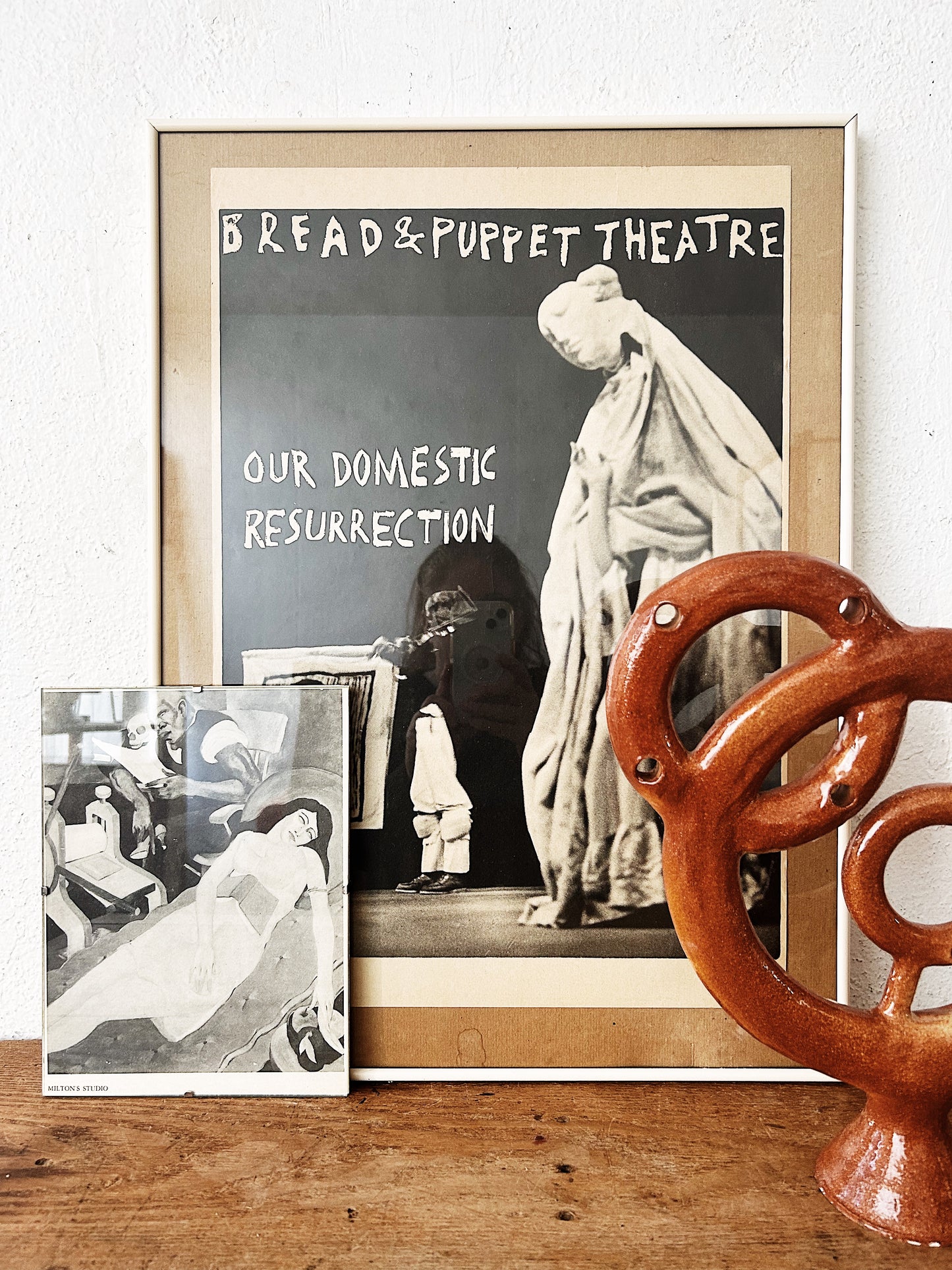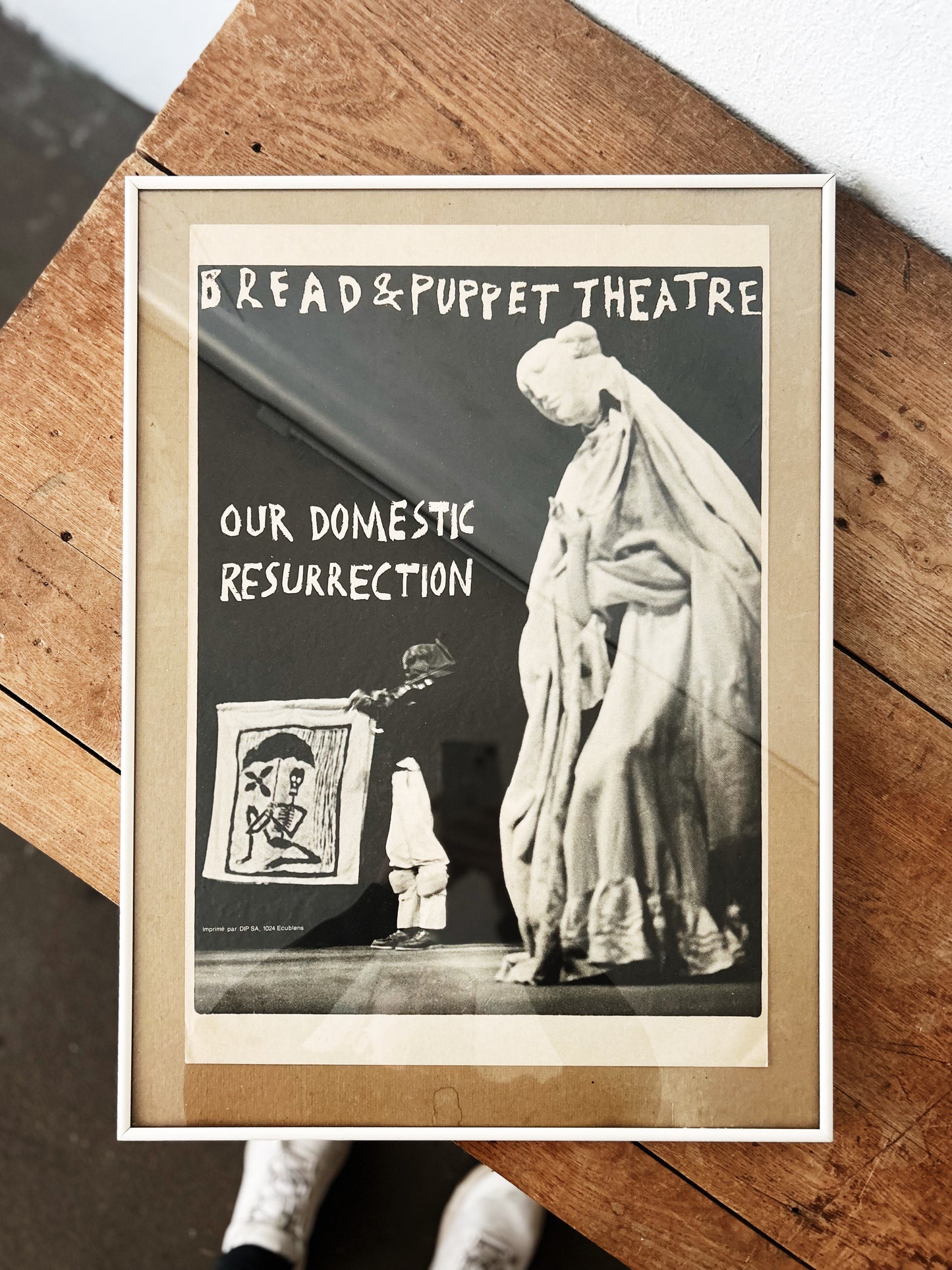 Rare vintage Bread and Puppet Theatre poster from 1973. Printed and designed in Switzerland. I have a love affair with them. So finding this old one was a treat. Framed under glass in a creamy white metal mount