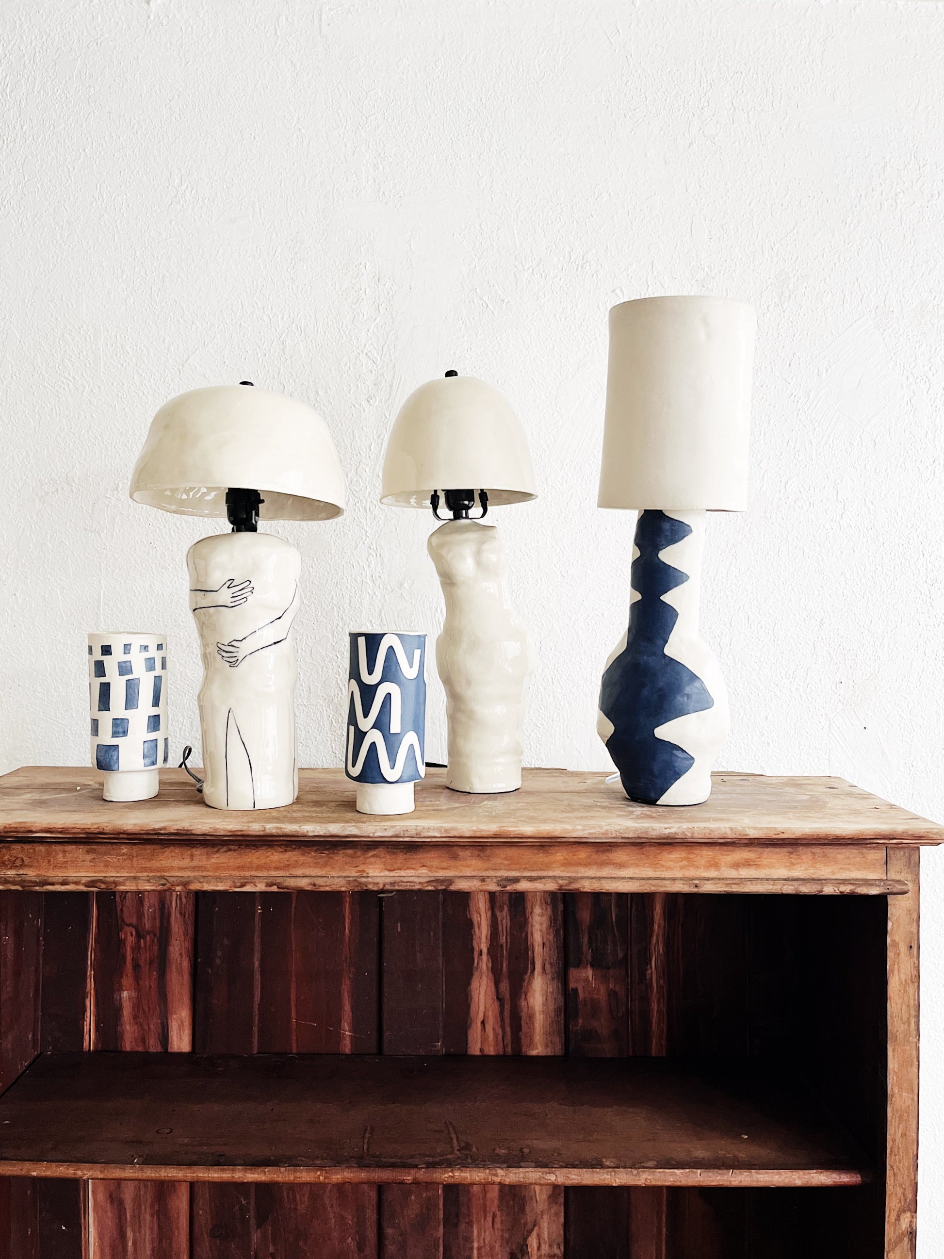 Stunning handmade lamps by local Portland artist Rebecca Boraz. Hand drawn details and hand formed shapes on glazed porcelain clay. The clay glows ethereally when the bulb is illuminated. Each has a nice long cord.