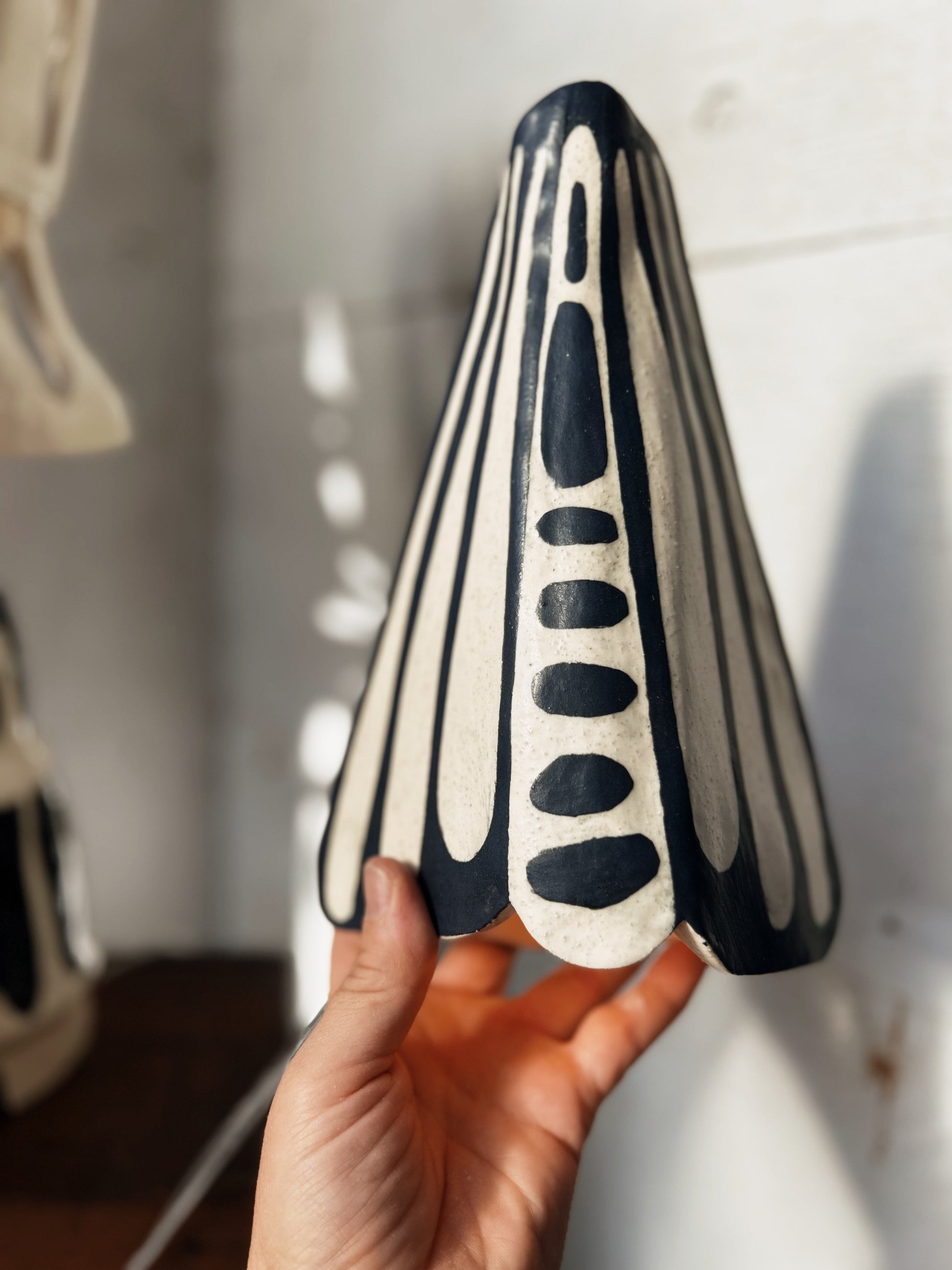 Stunning handmade lamps by local Portland artist Rebecca Boraz under her studio Brave Atlas. Hand drawn details and hand formed shapes on glazed porcelain clay. Some beautiful details include hand cut ceramic shades and hand made ceramic harps. They cast the most beautiful shadows. Each has a nice long clear cord with on cord rocker switch.