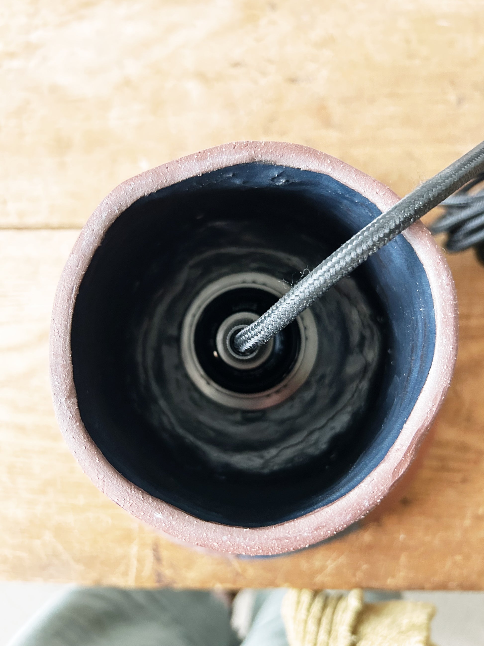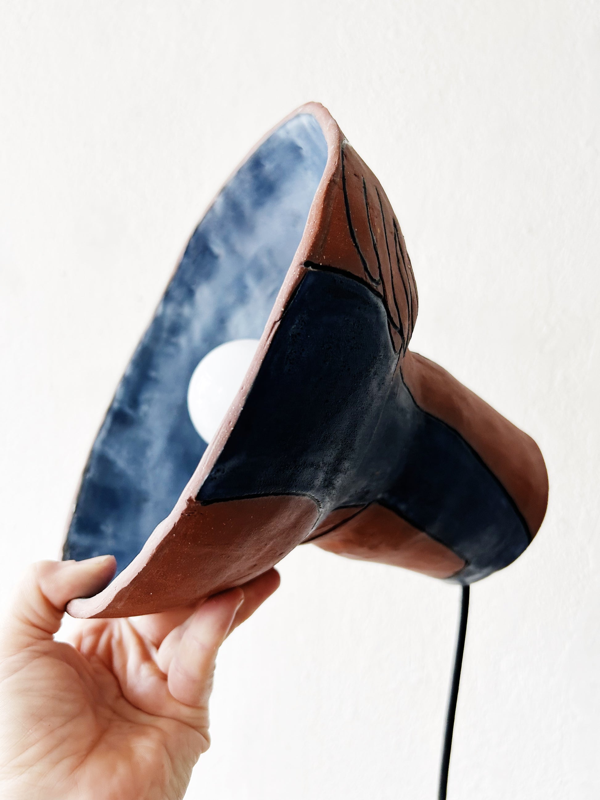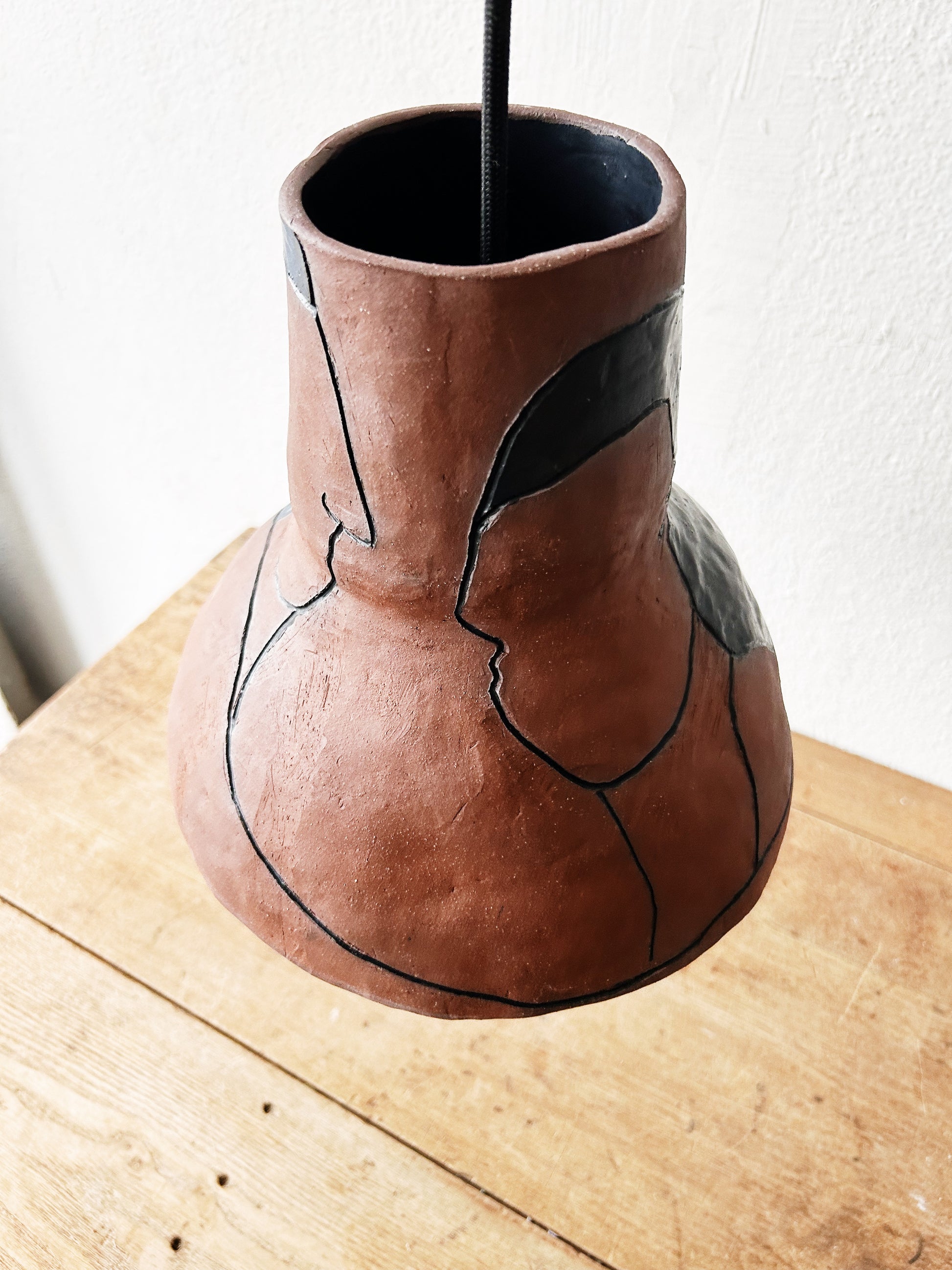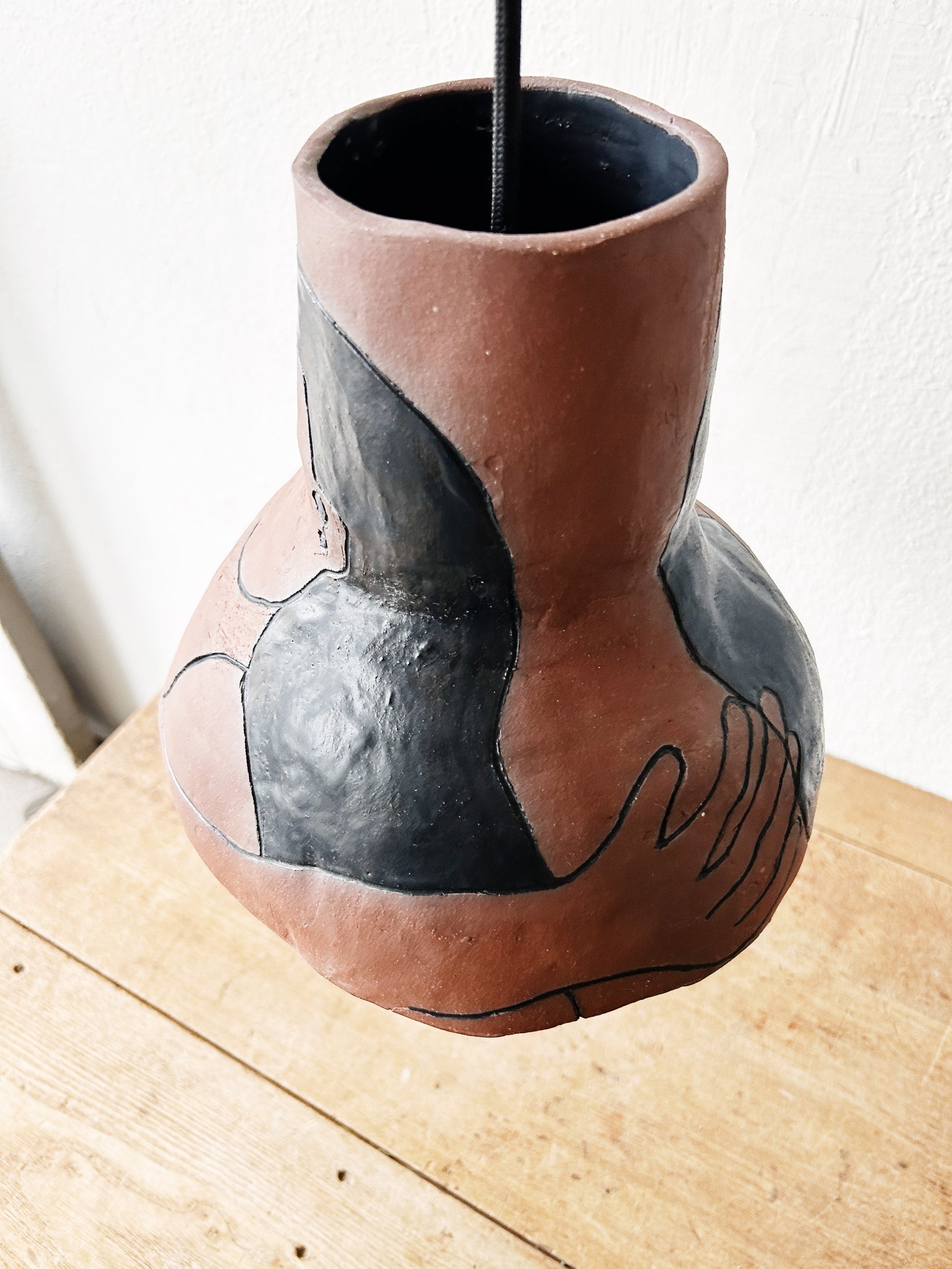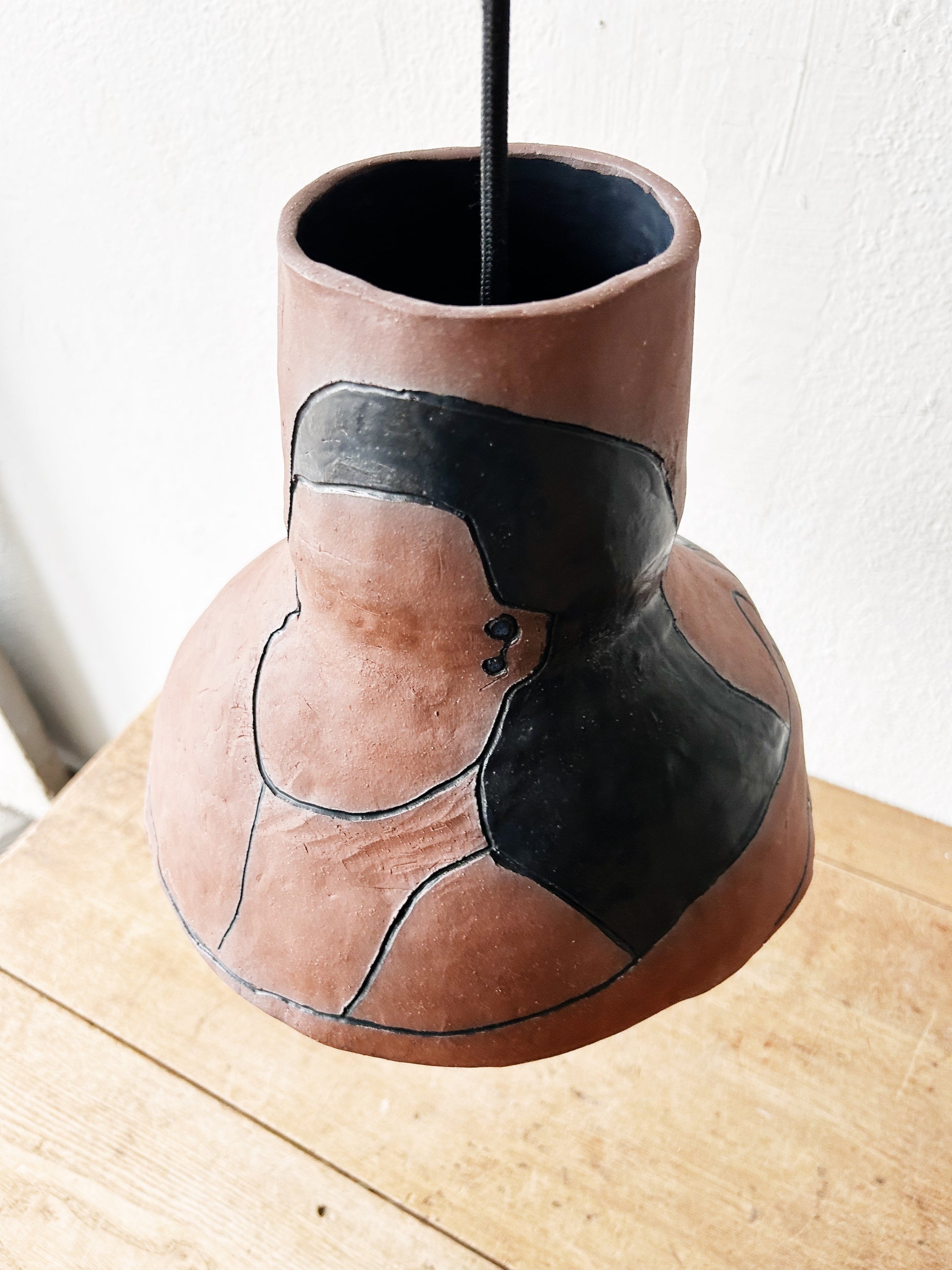 Stunning handmadeceramic pendant lamp by local Portland artist Rebecca Boraz. Hand drawn details on a larger bell shaped lamp. Long cord with plug end and rocker on off switch. Could be hardwired too. Takes a standard bulb