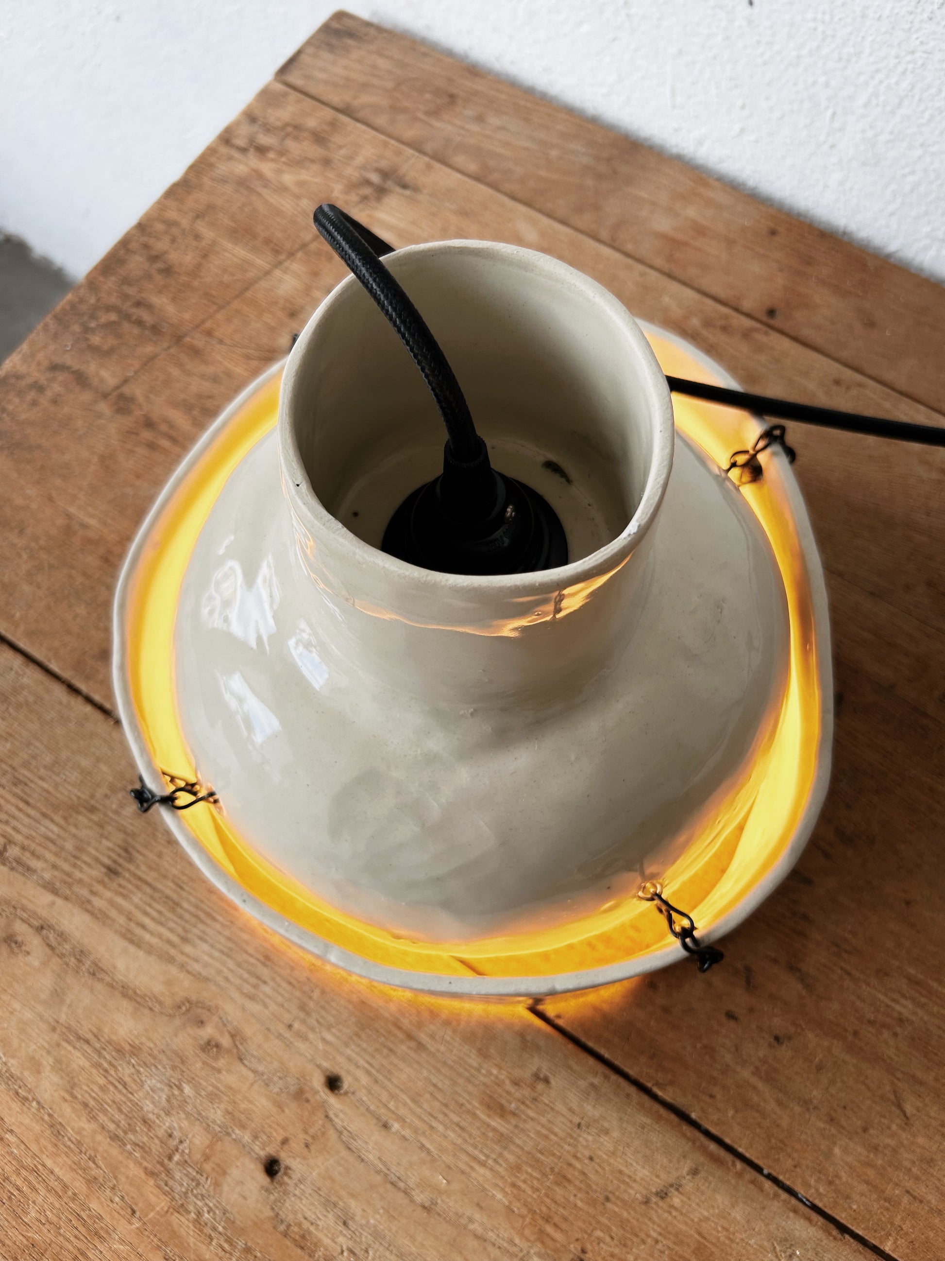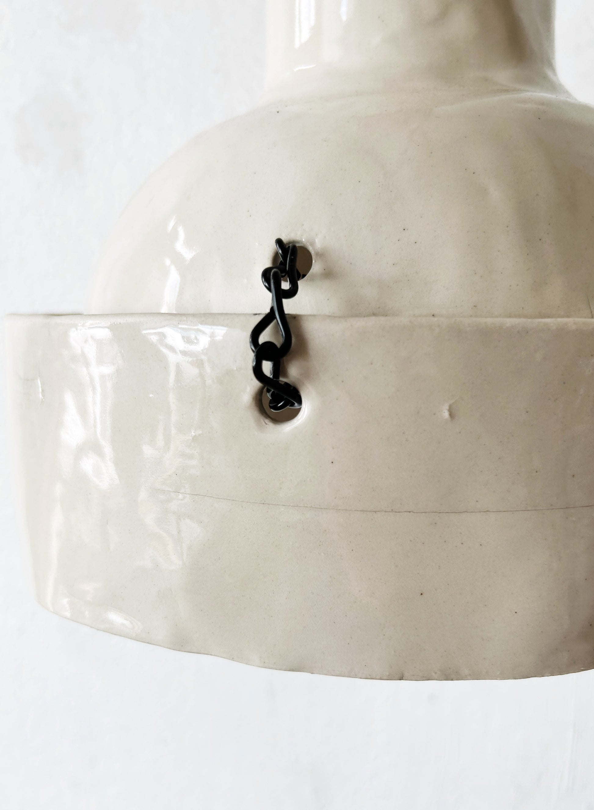 Stunning handmade ceramic pendant lamp by local Portland artist Rebecca Boraz. Two tiered warm white gloss ceramic casts a lovely glow. Especially with the light peeking out the tiered area. Long cord with plug end and rocker on off switch. Could be hardwired too. Takes a standard bulb