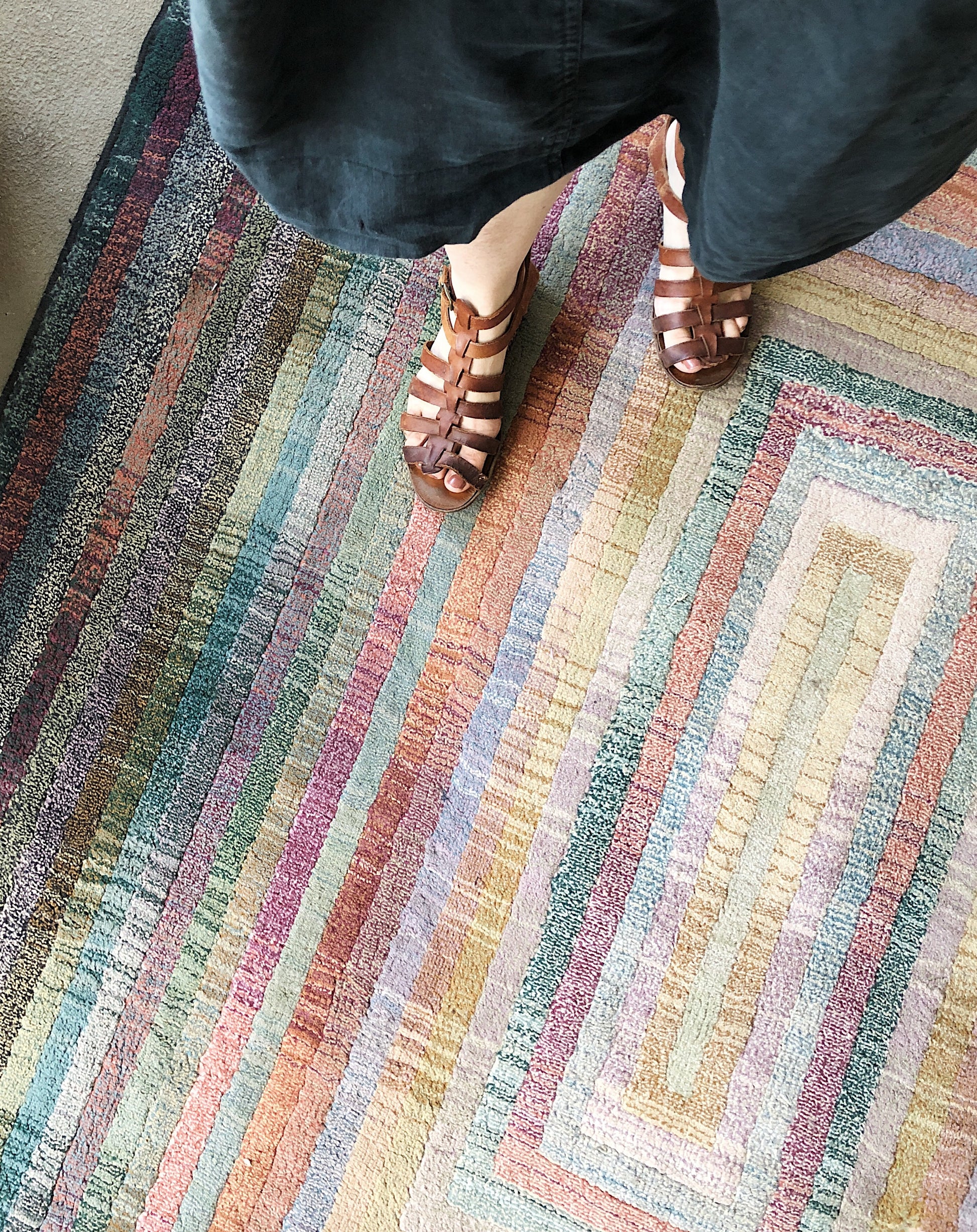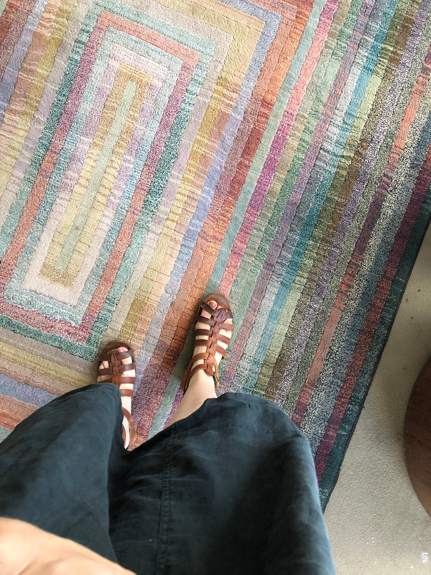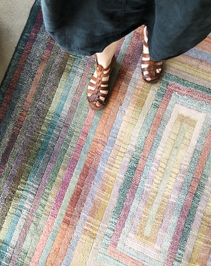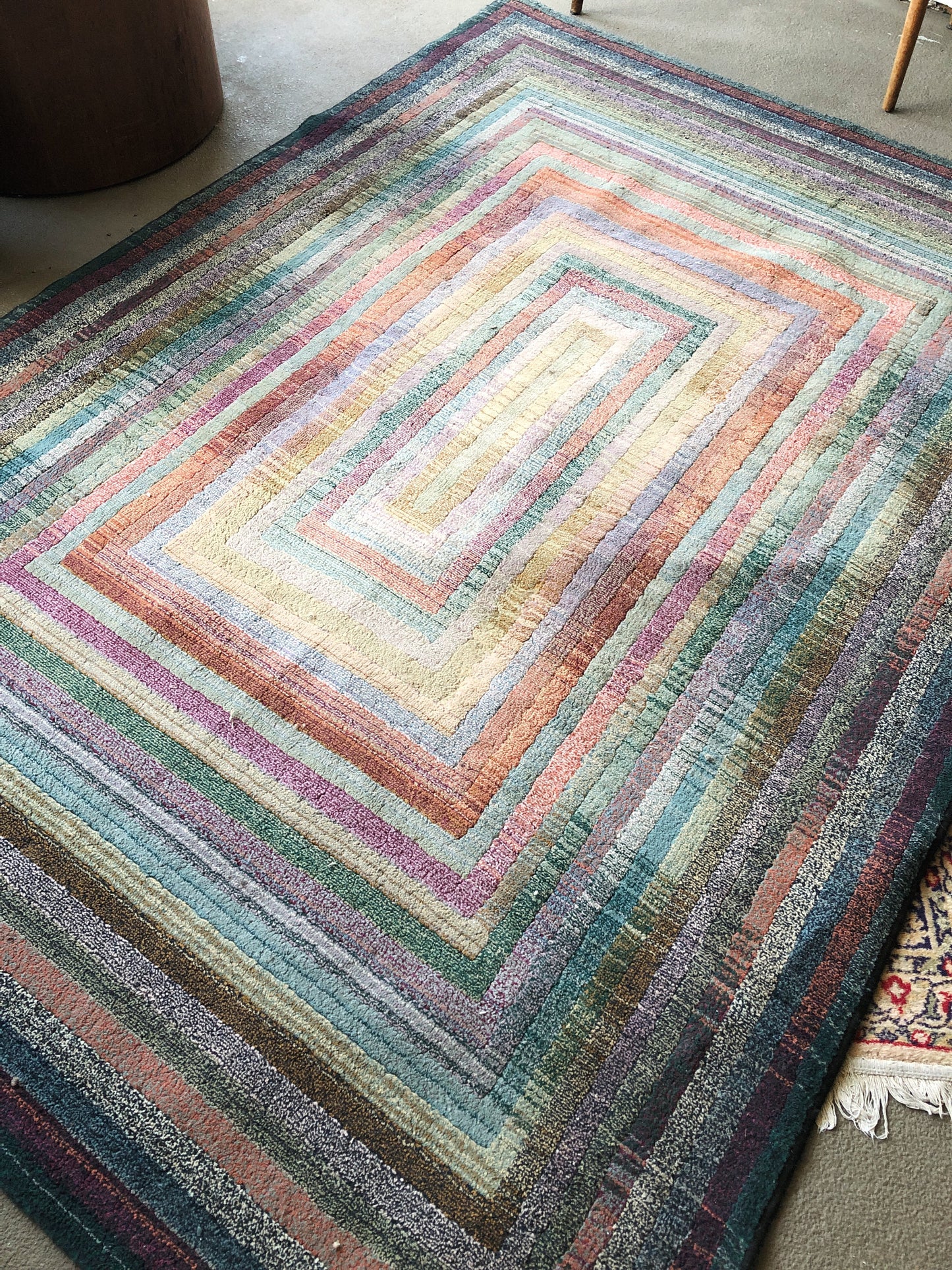 The coolest design and fab colors! Wool blend knitted area rug with medium flat pile. In great condition with only a few areas of wear.