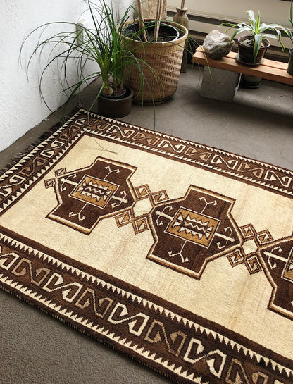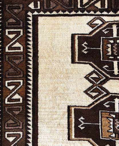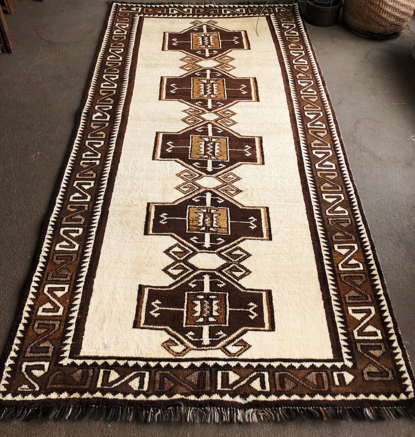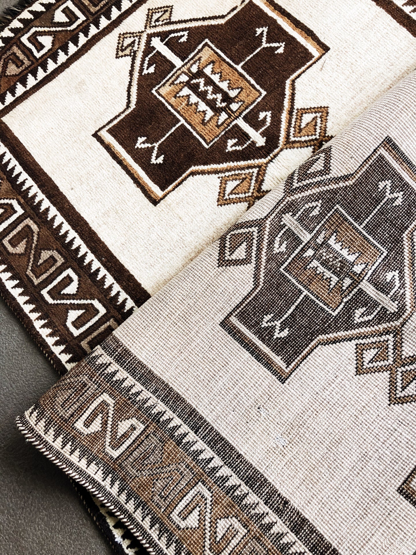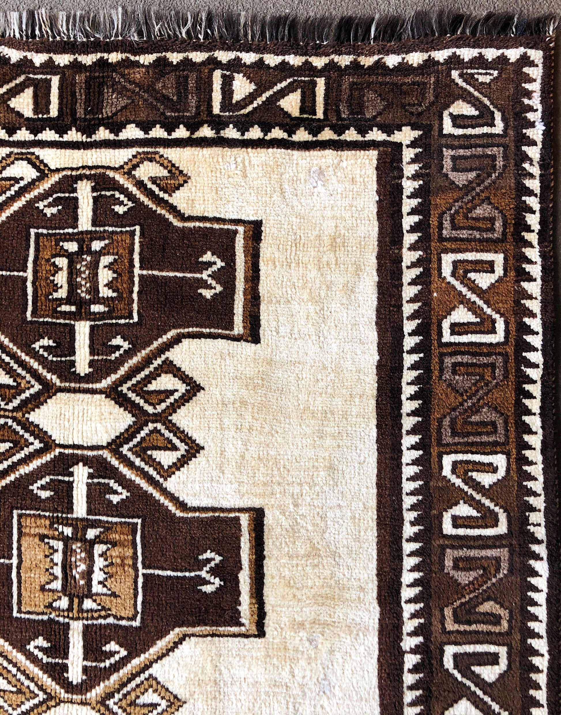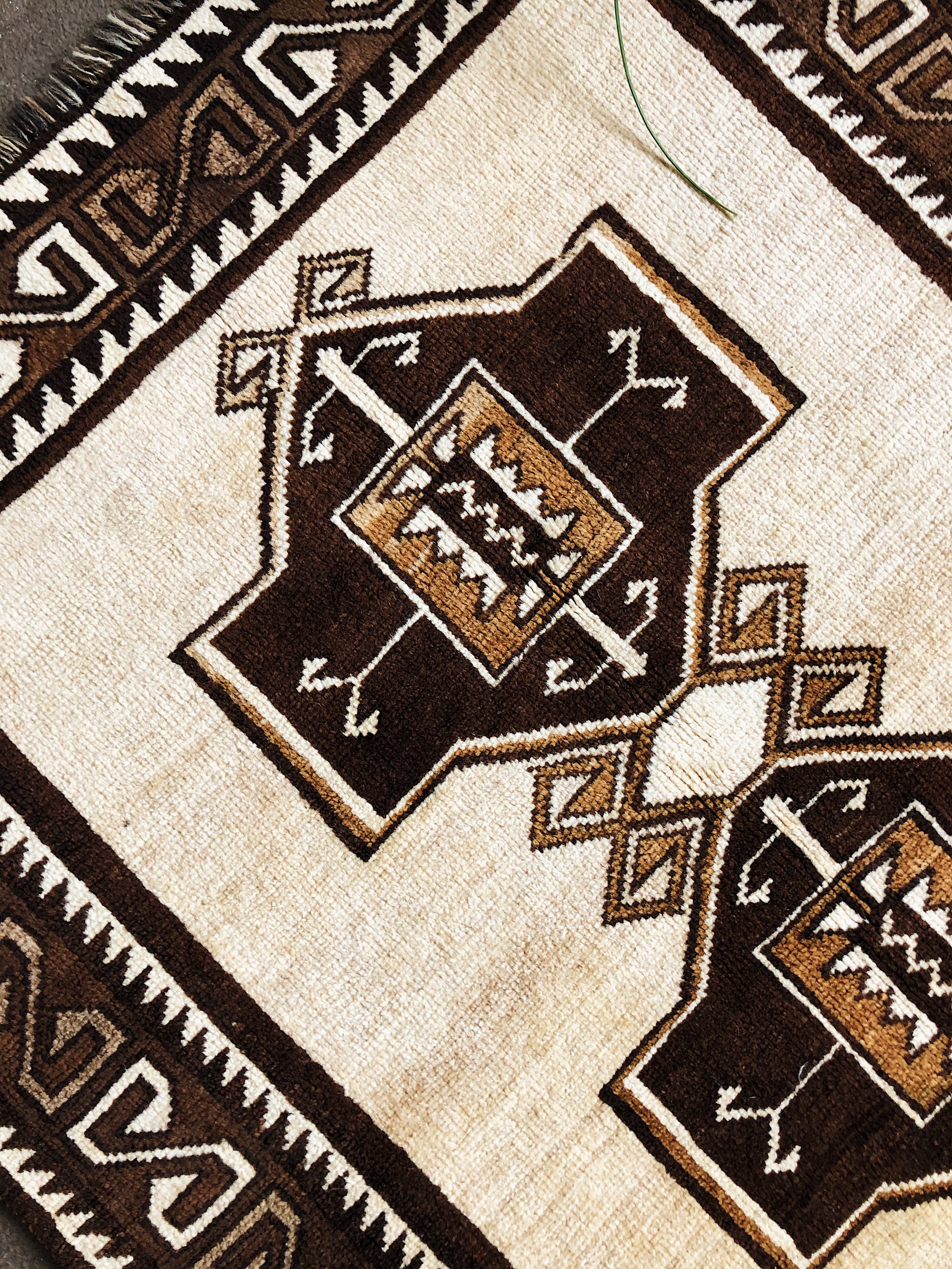 Stunning tribal rug in pure wool. The brown tones are derived simply and only from various sheep’s wool. Medium semi plush pile. Horsehair fringe