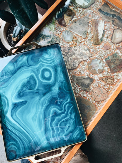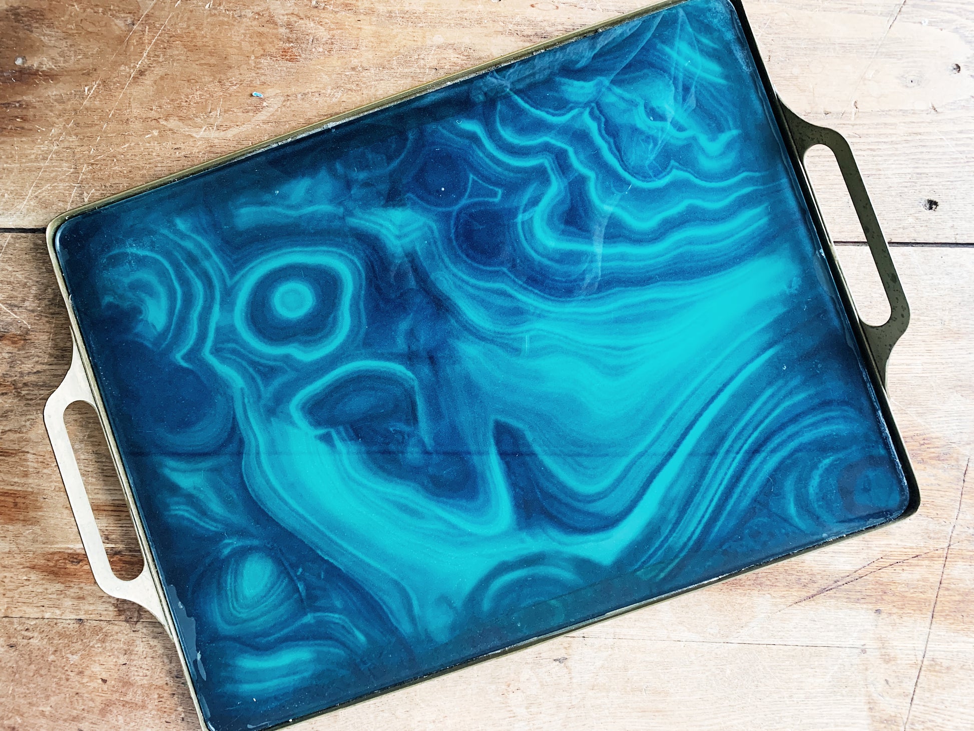 Stunning turquoise marbleized resin and brass tray. This is really beautiful held up to the light, and a darker indigo swirl when sitting on a table.