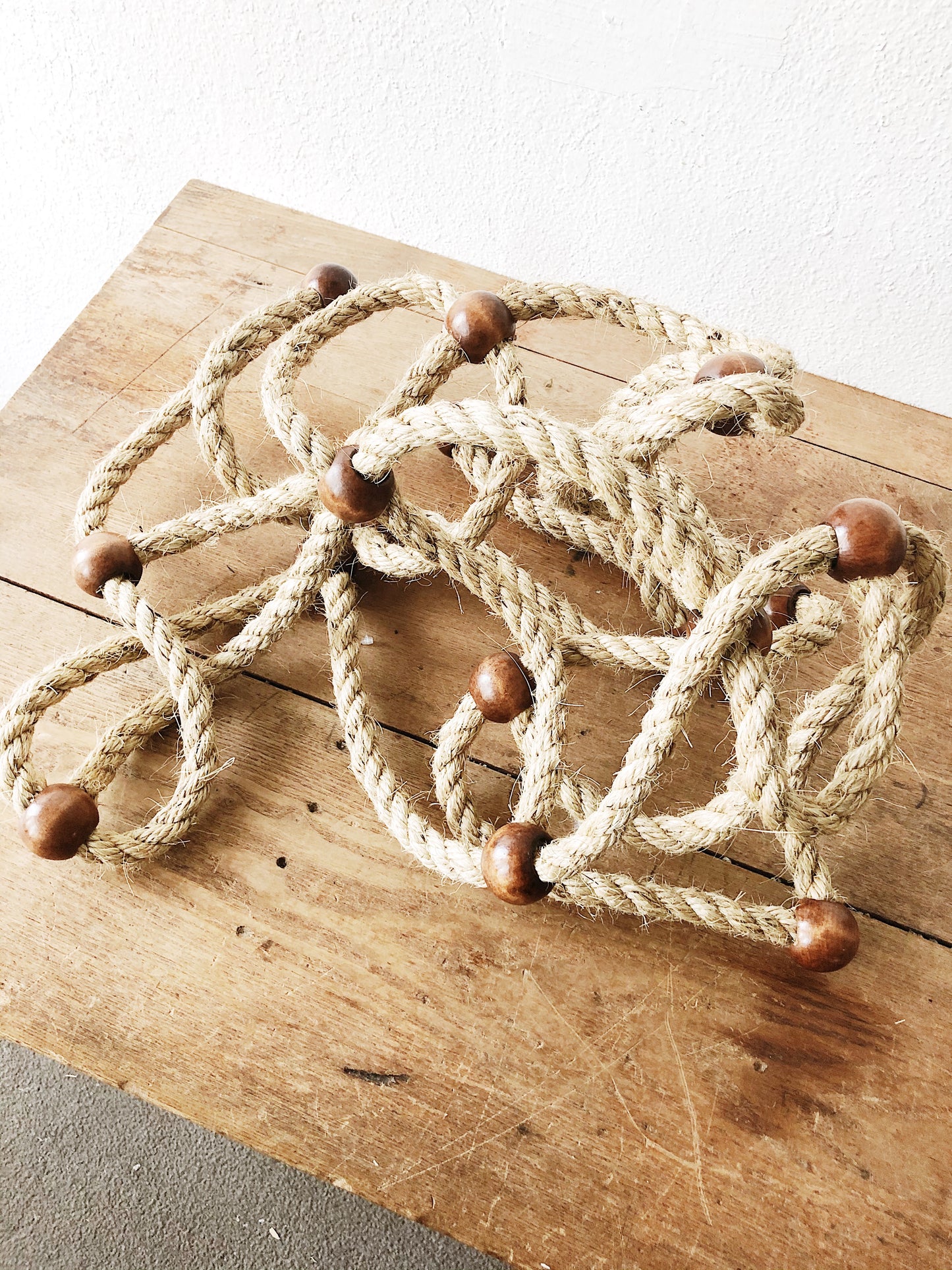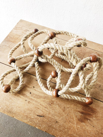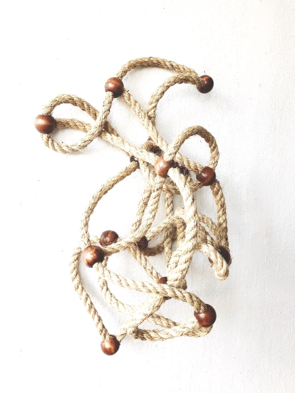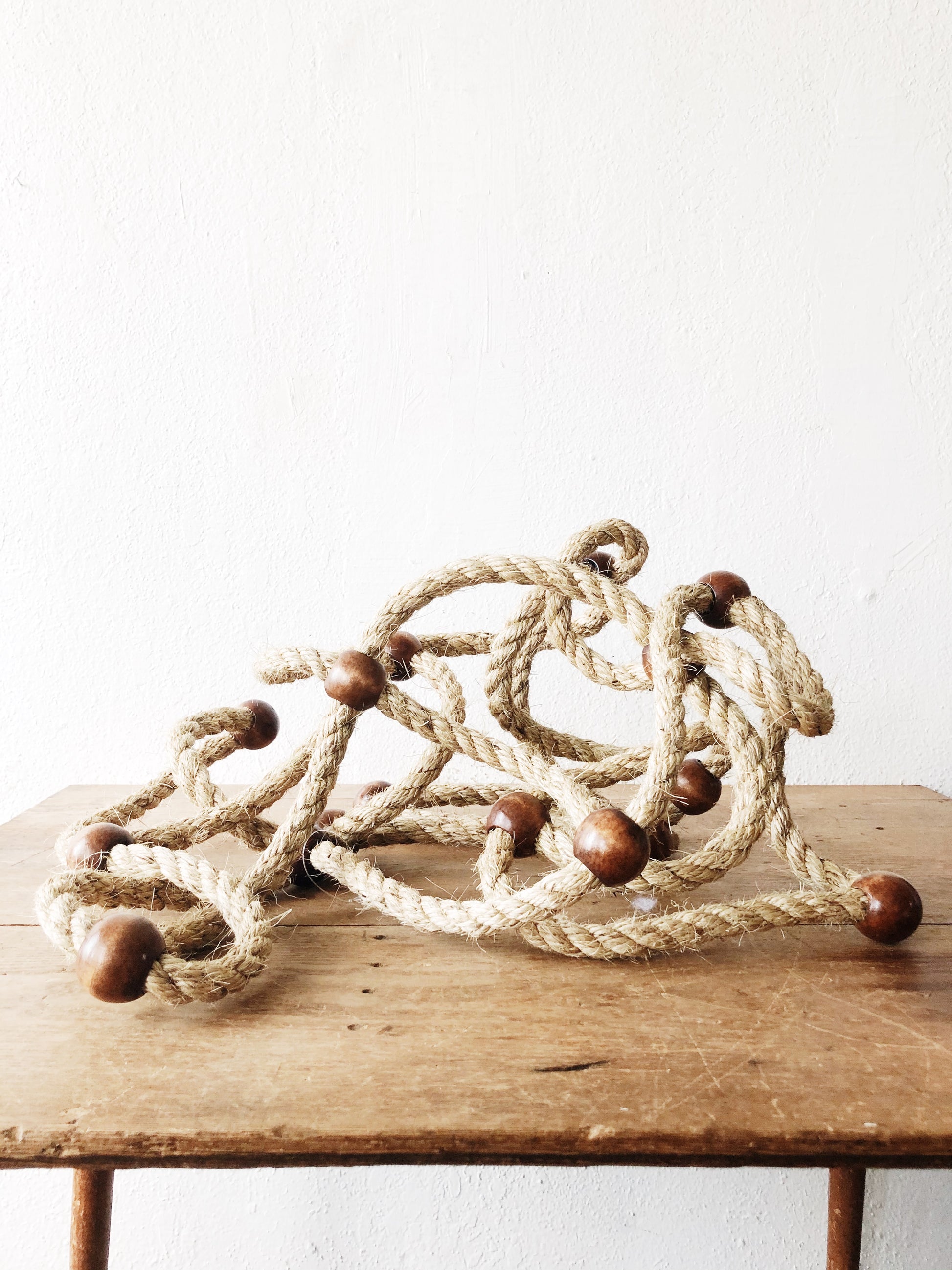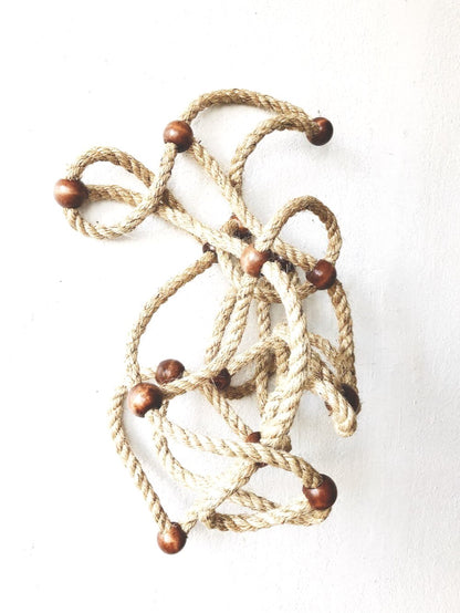 Three dimensional rope sculpture with wood beads. This is pliable, so in addition to hanging on the wall or placing on the floor or a low table you could also mold this into different shapes.
