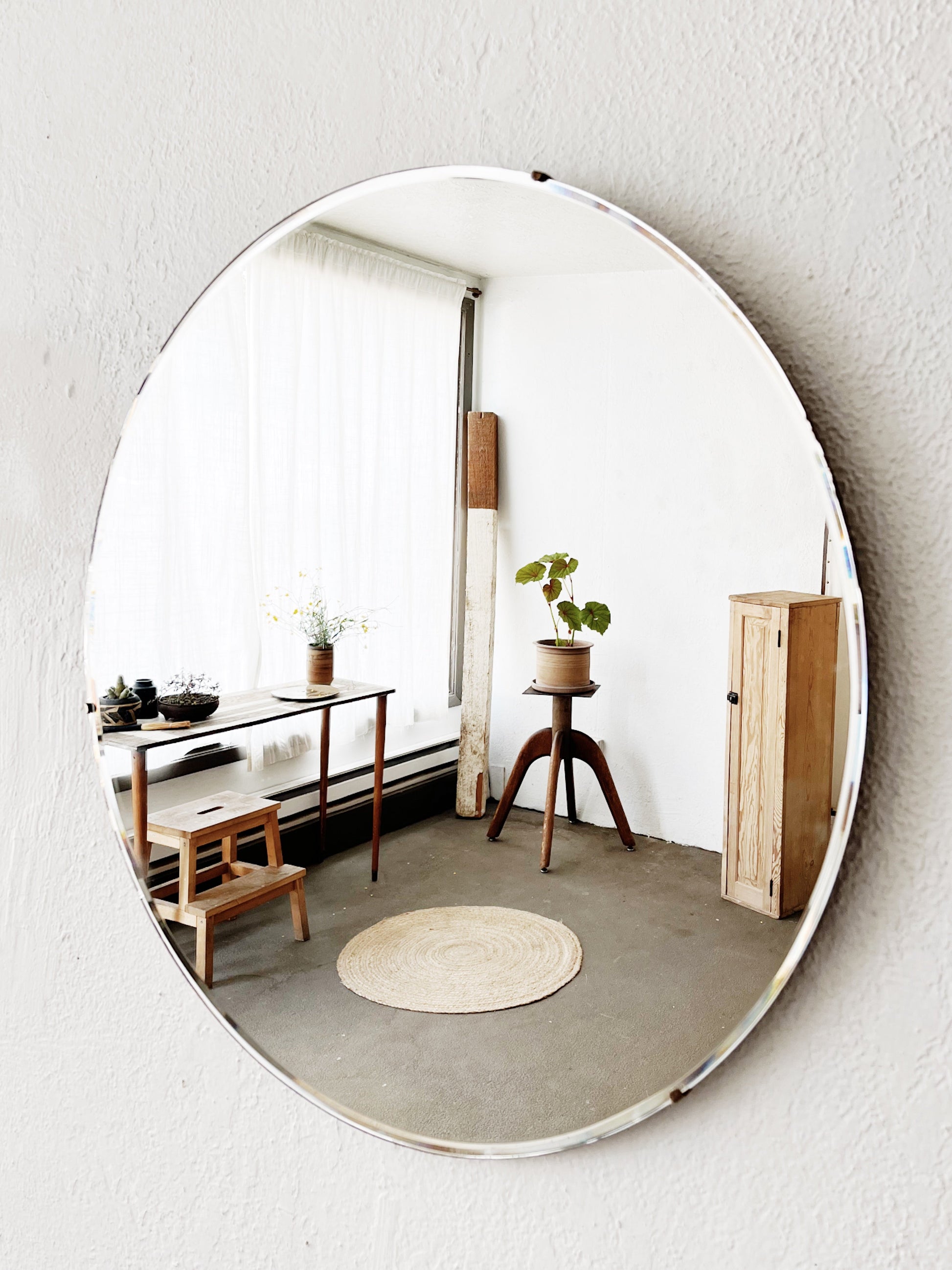 Vintage modern at its best. Nice round mirror with a sharp edge bevel and industrial clips. Very clear glass with only tiny spots of silver loss which reveals its age. Hanger on the wooden back