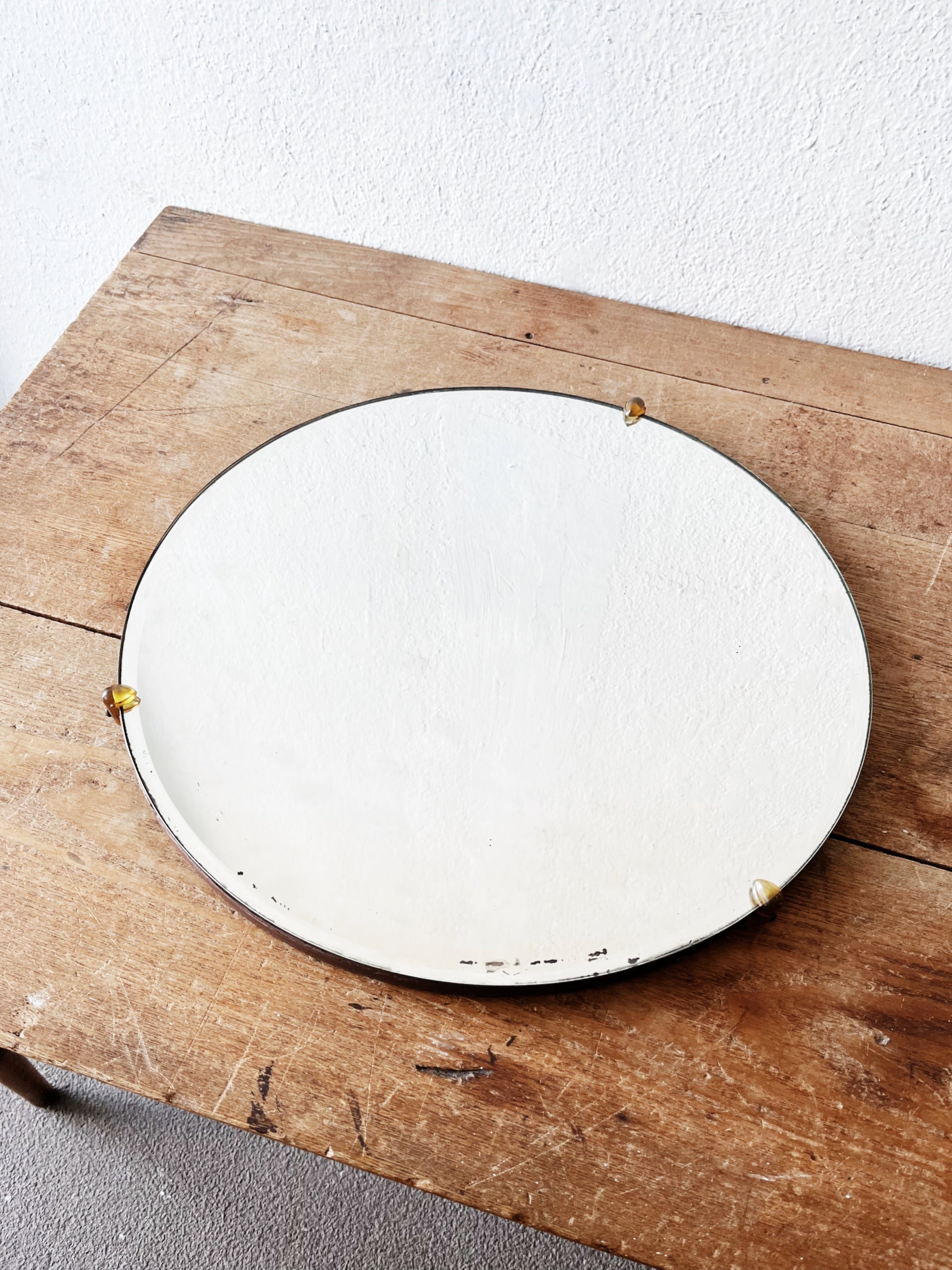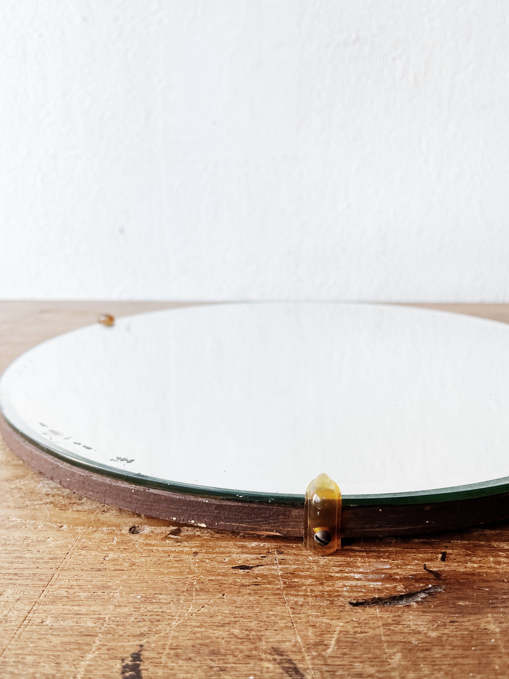 Vintage beveled edge industrial round mirror. Really nice detail is the Amber Bakelite clips. Has wood back and wire hanger. A great smaller size. Glass is very clear, except for some age marks around the rim and a few specks throughout.