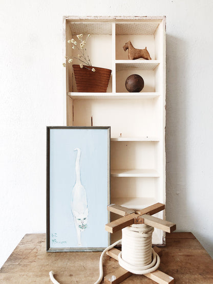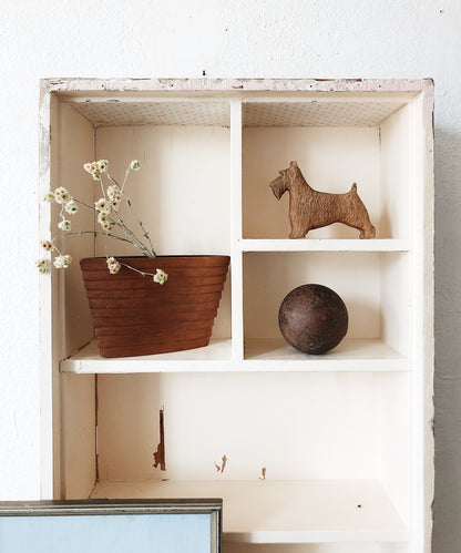 Oversized wood cubby shelf. Painted palest peach with raw wood outer. One side of the shelves has a petite floral paper lining. Nicely sized for hanging in any direction or prop on a table top