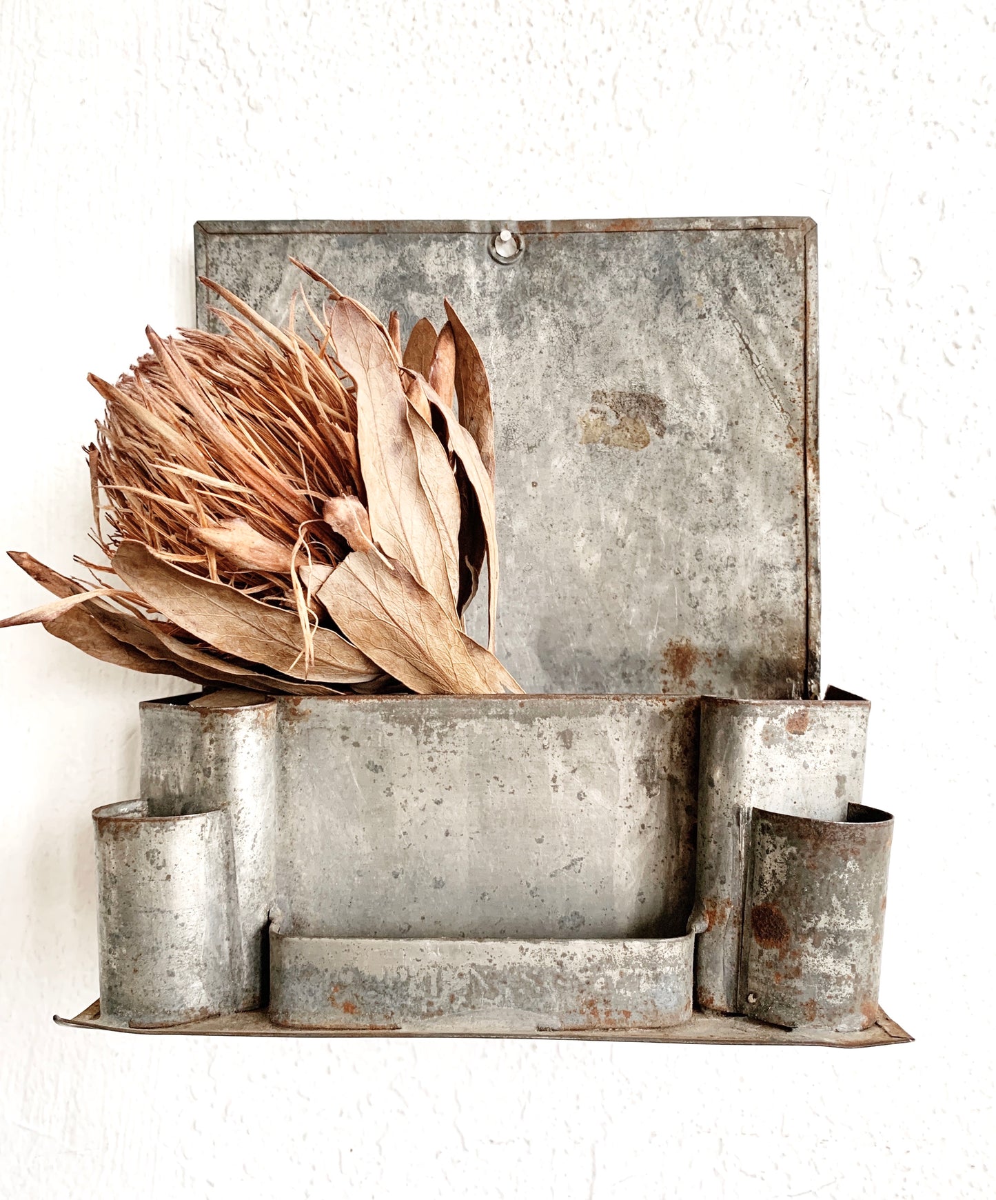 Wonderful rustic tin wall organizer.
