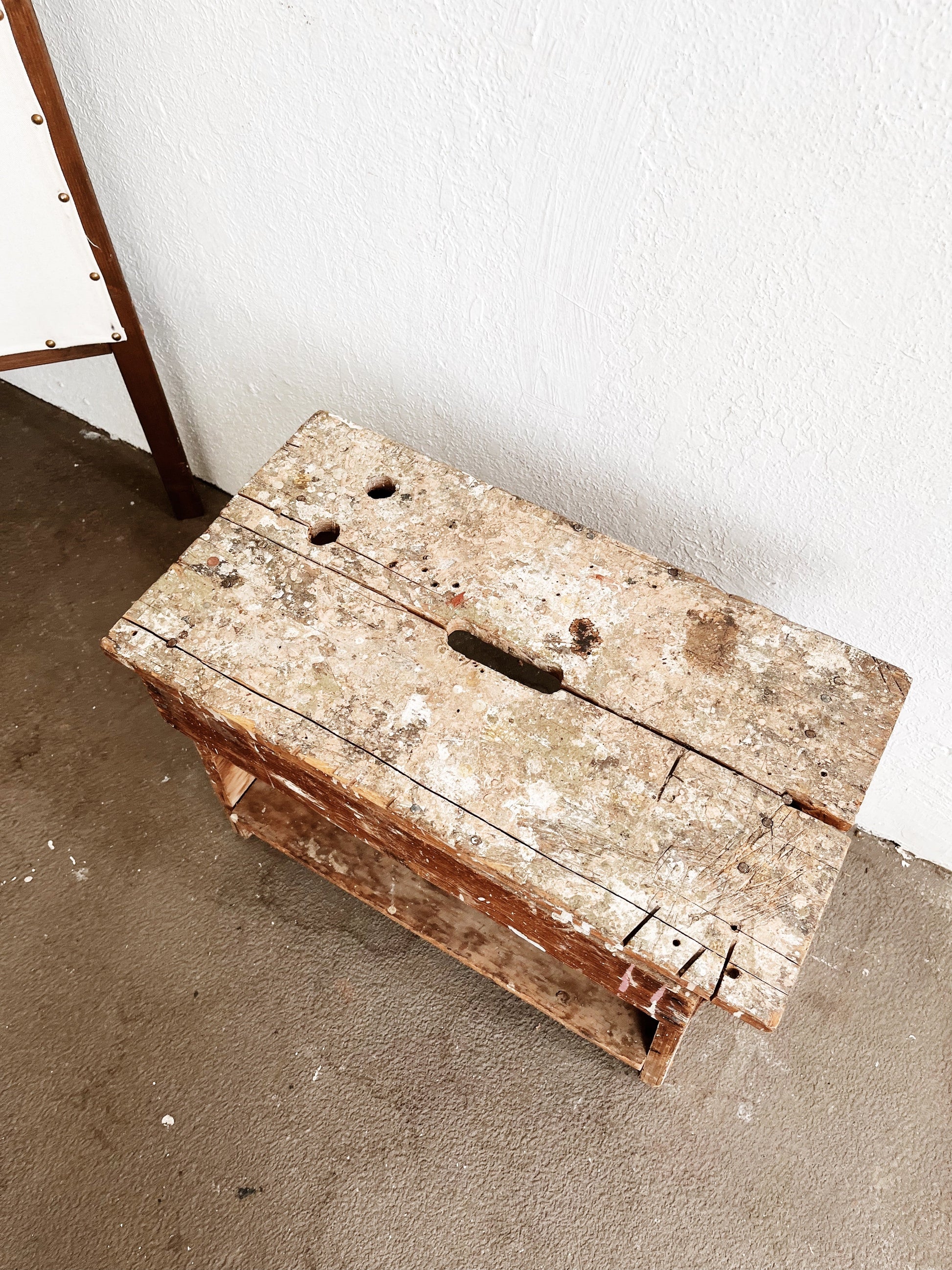 Rustic farmhouse stool, paint splattered and worn in. Sturdy enough for sitting and certainly for holding a plant friend. All over wear