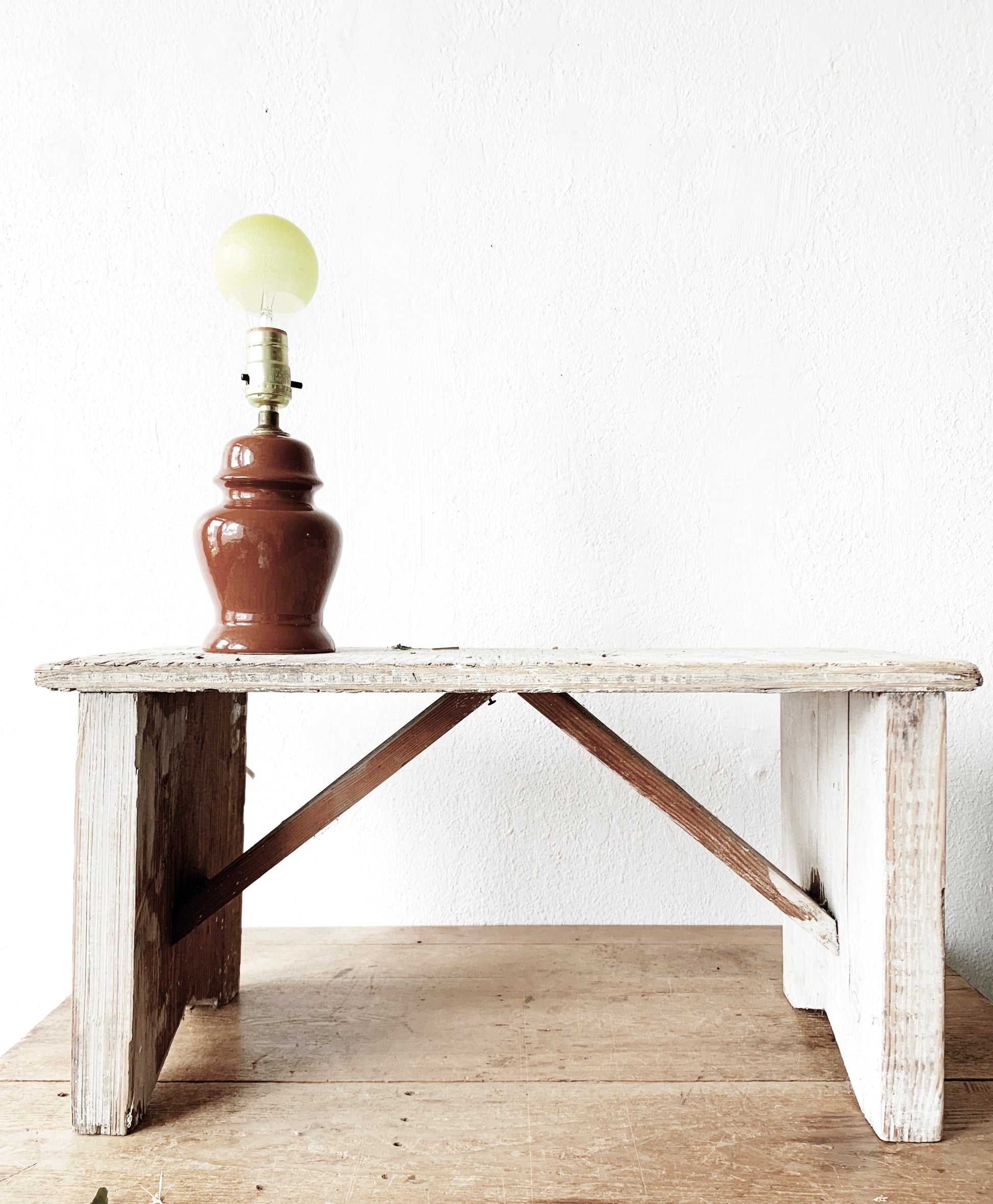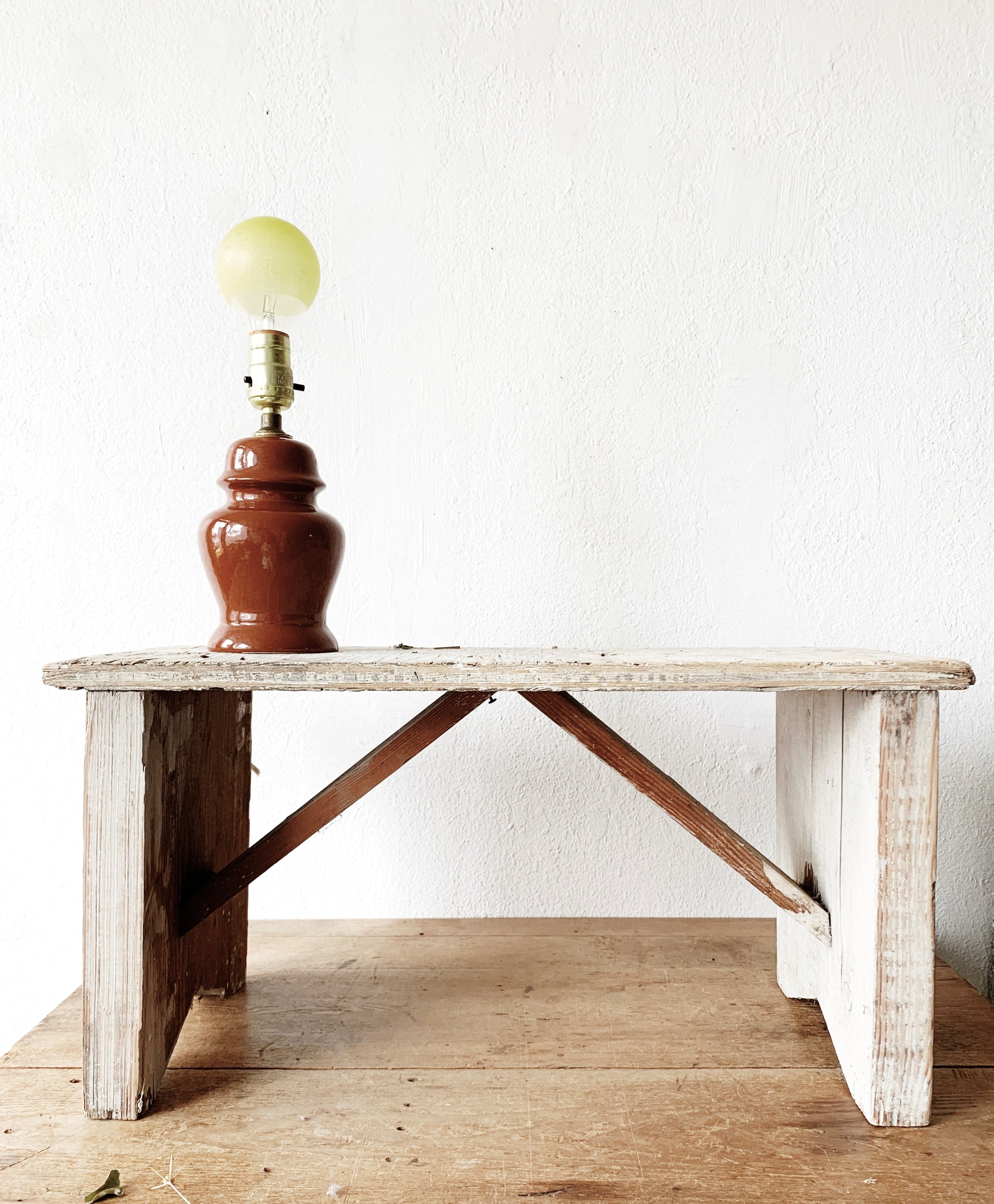 Rustic, sturdy wood bench with a grayish whitewashed finish. Sturdy enough to stand on!