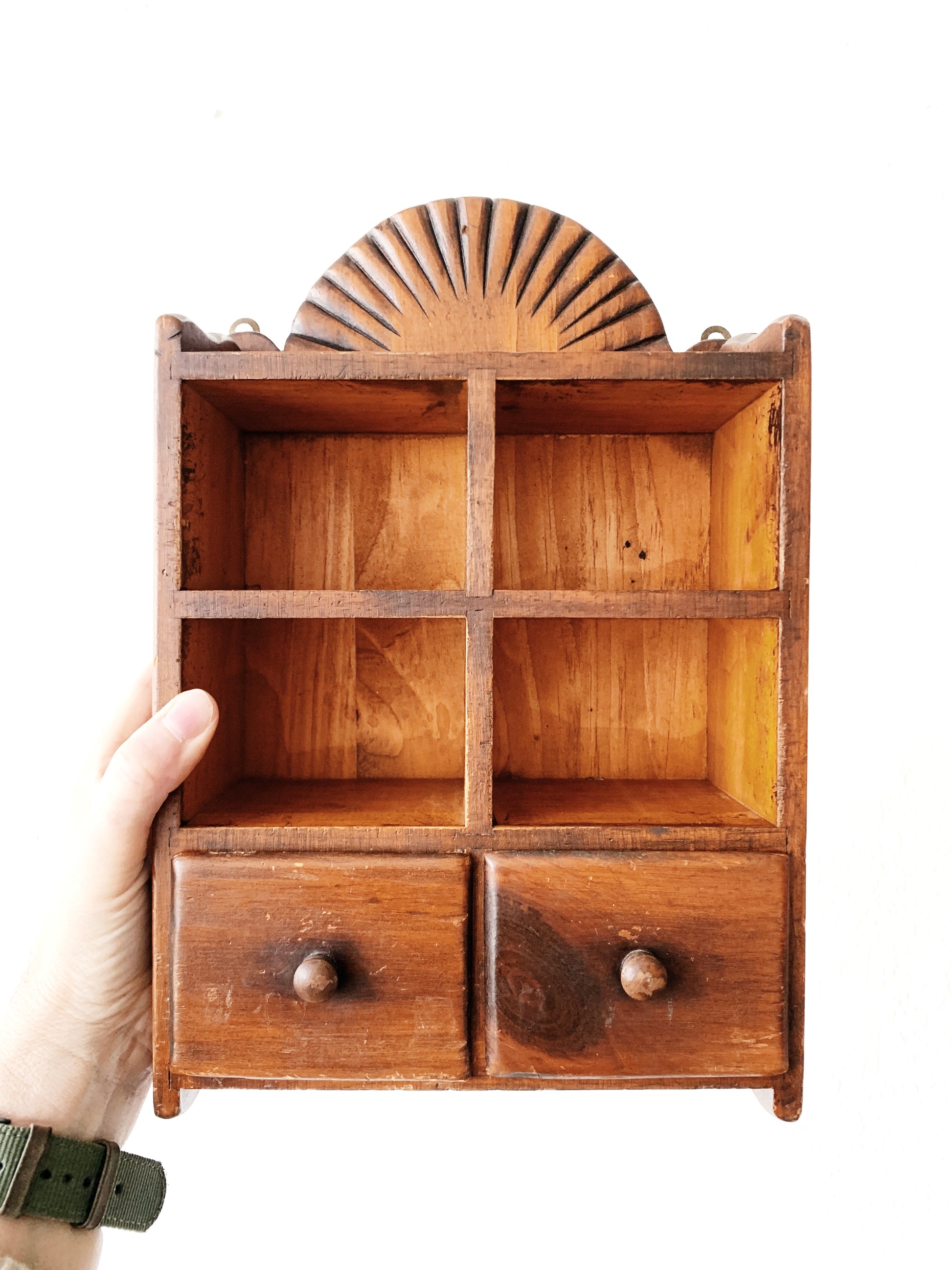 Fabulous vintage hanging wood shelf with cubbies and drawers. The top starburst makes it great! Yep brass hangers on back