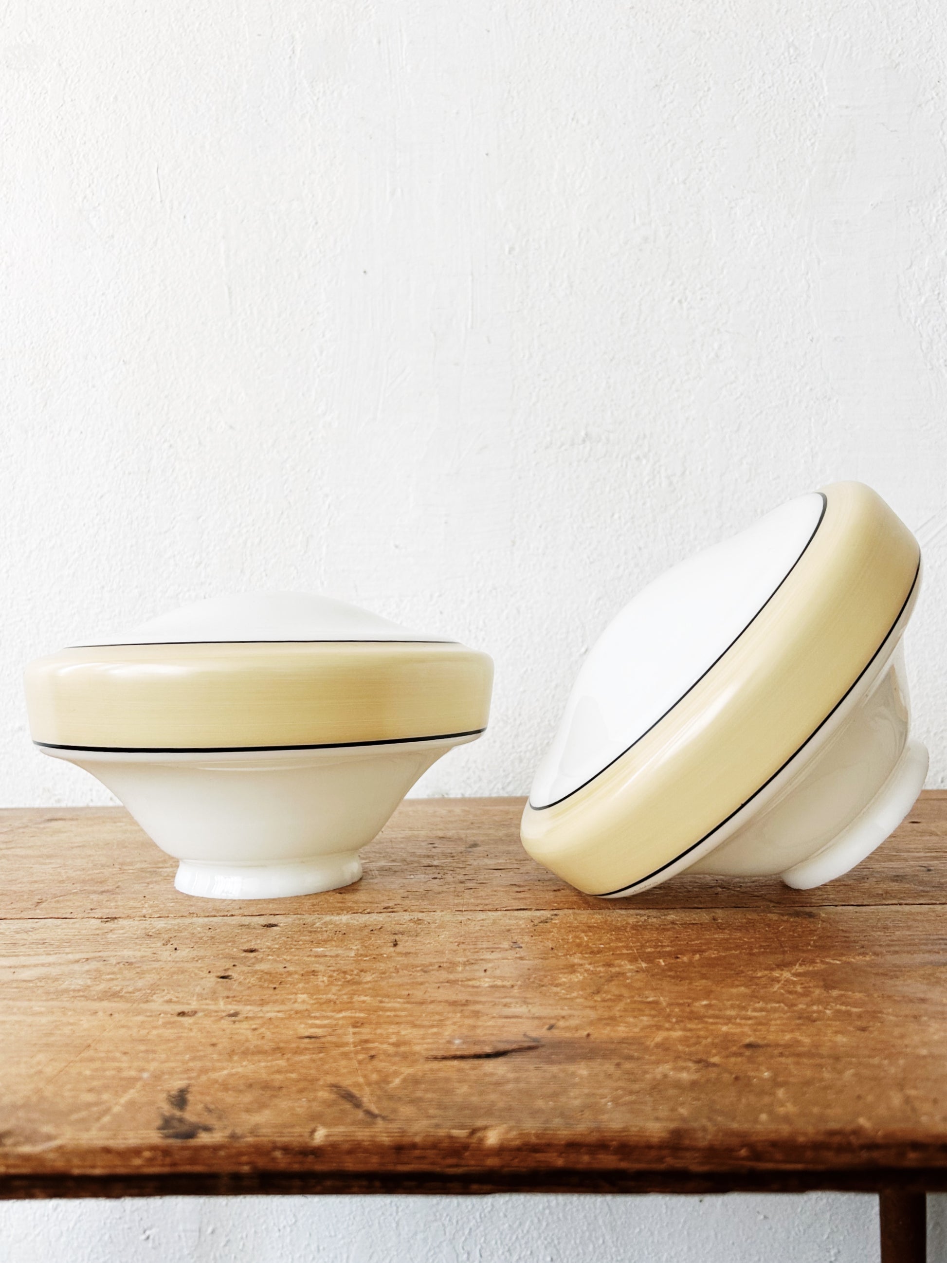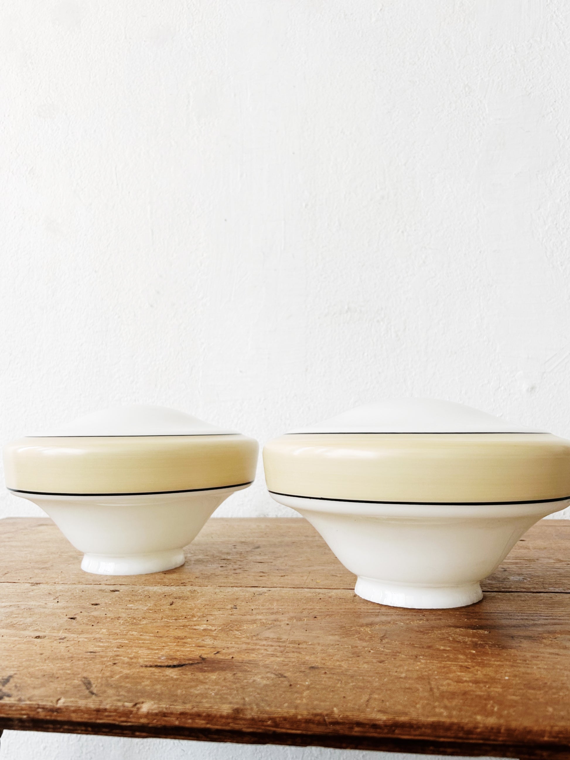 Traditional schoolhouse glass shade, two available in this size and we have one larger one in plain black stripe listed separately. We think they’d look great in a long hallway! Or in the kitchen of course