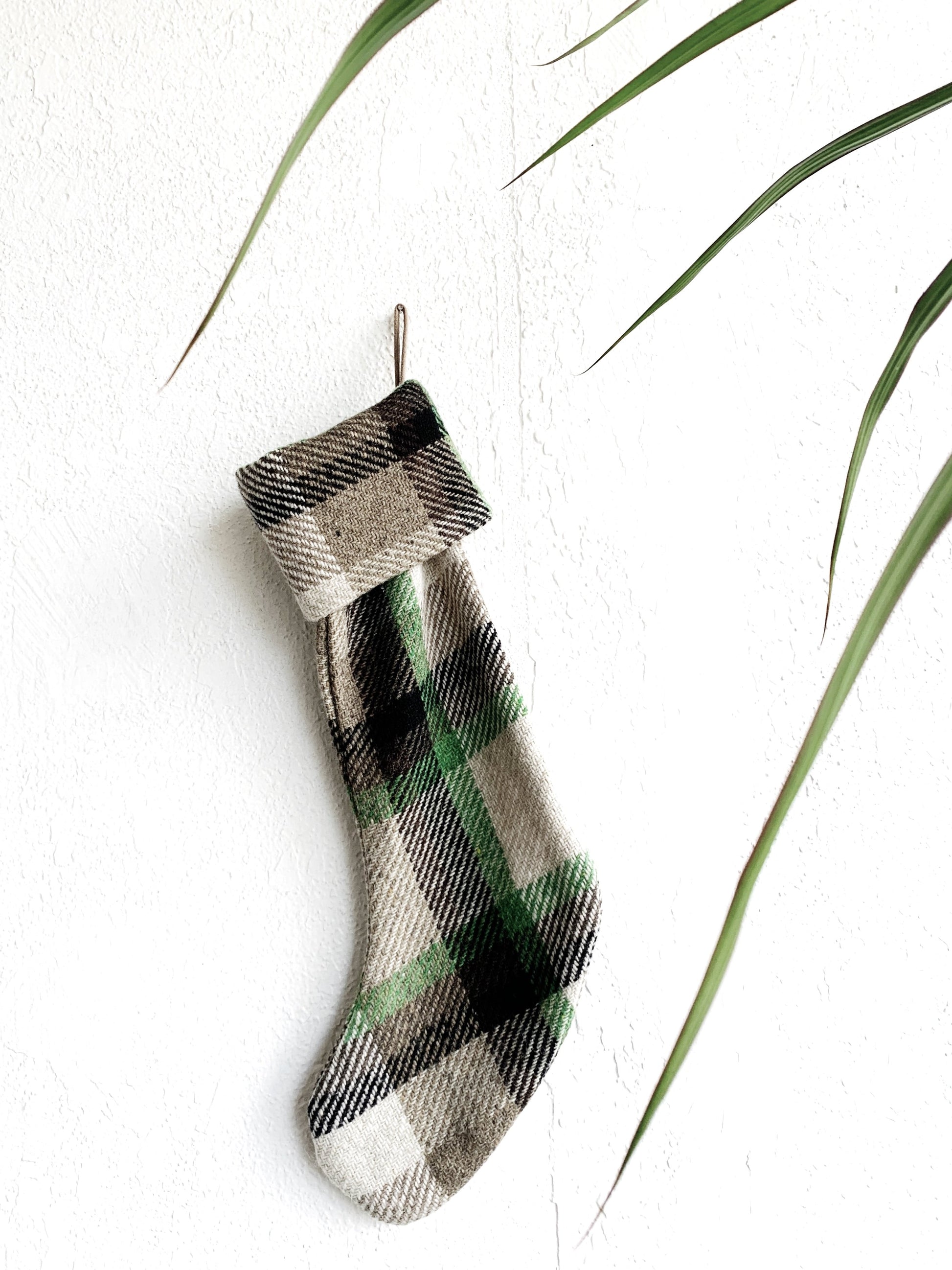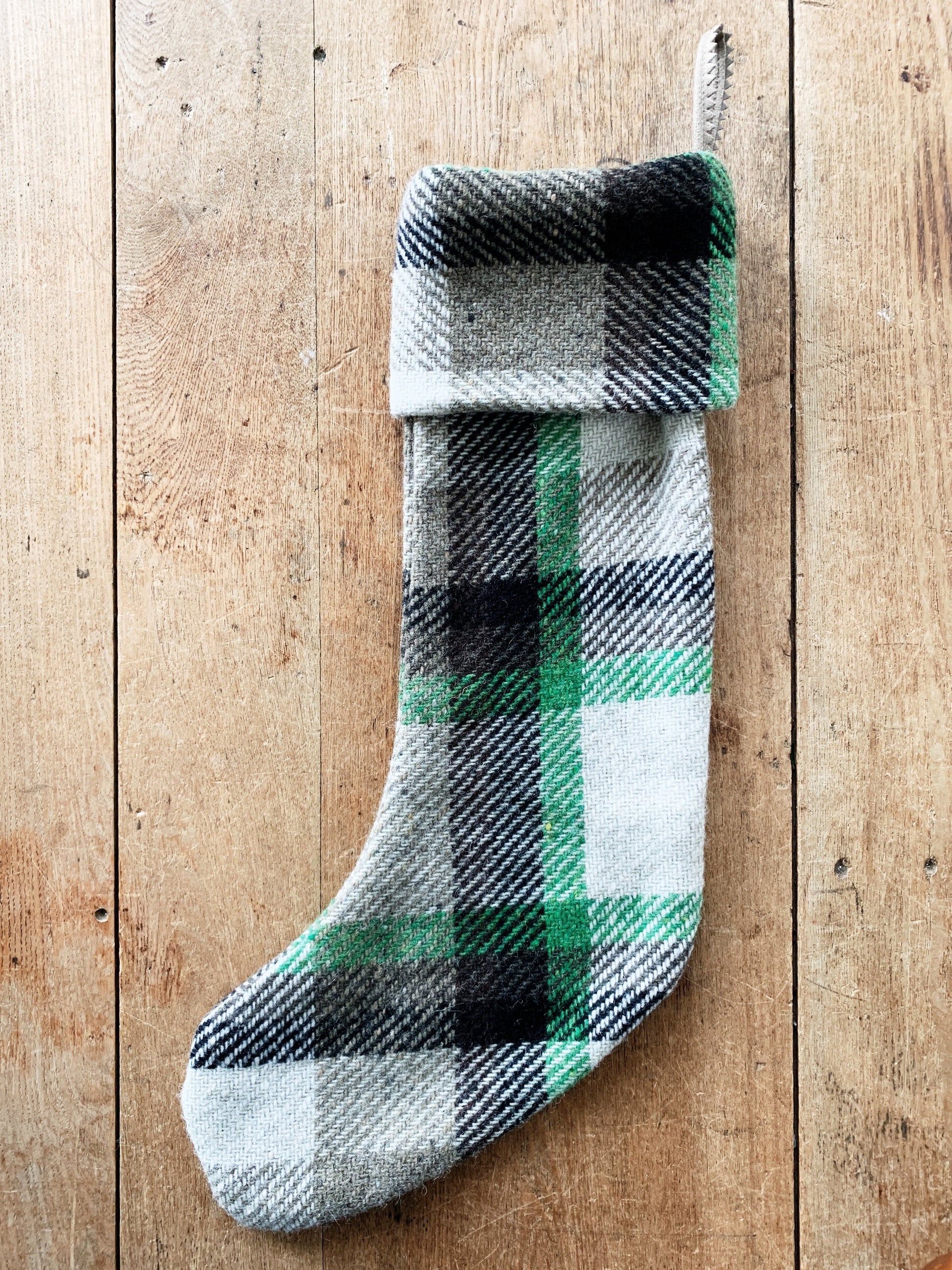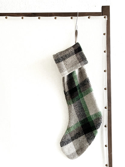 Schoolhouse Elected plaid wool stocking in beige green and brown. New condition and no longer available on their site.