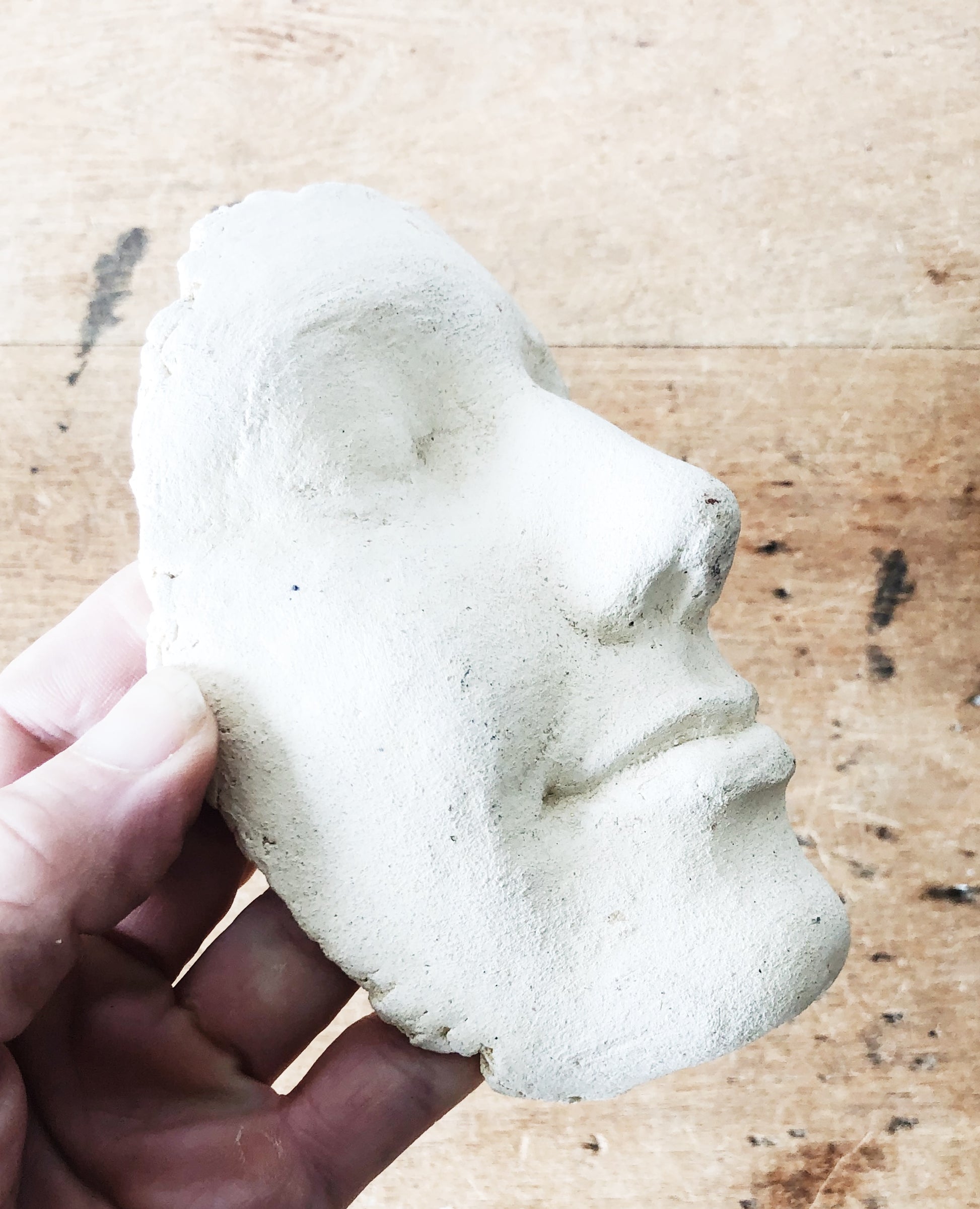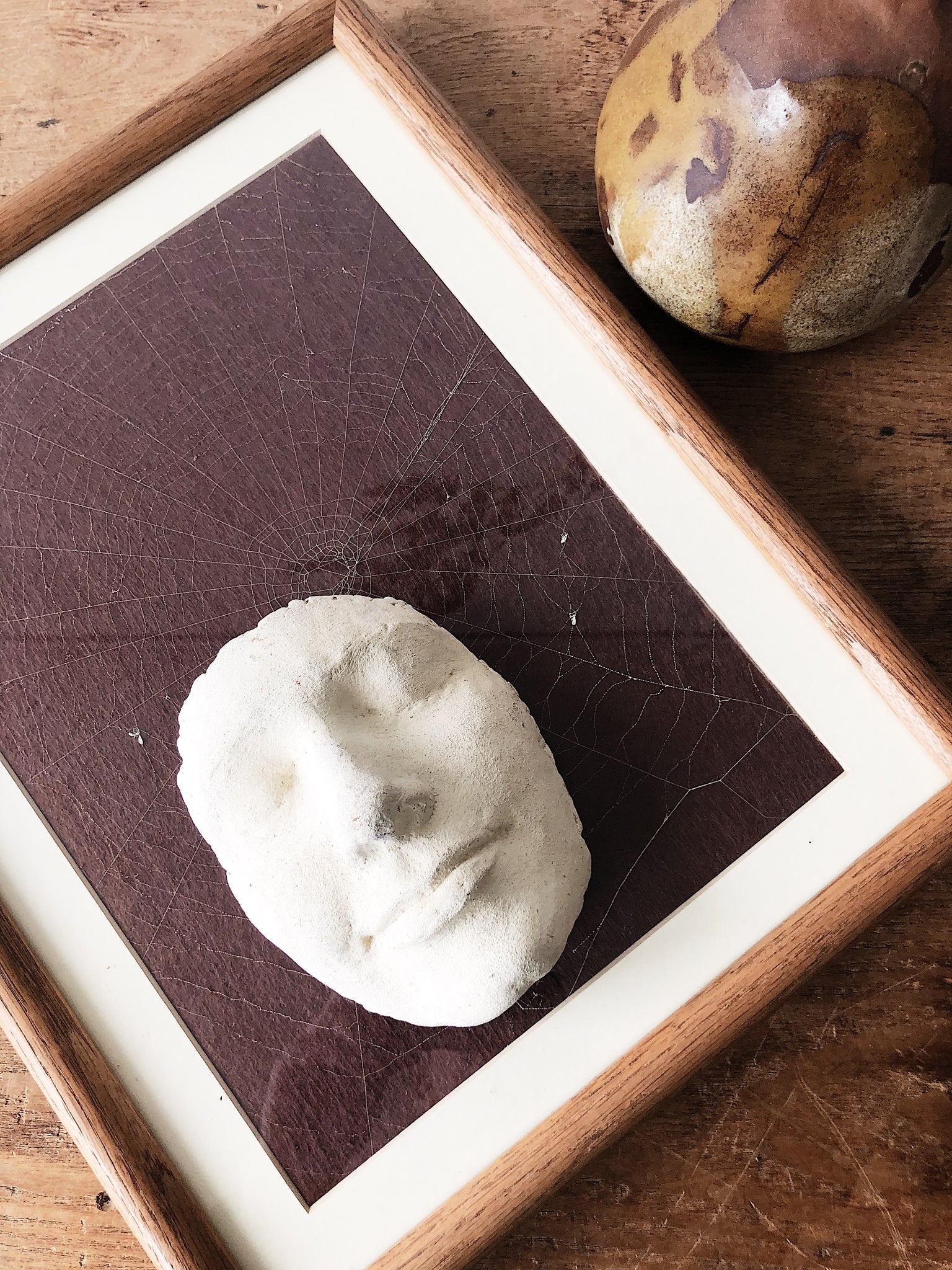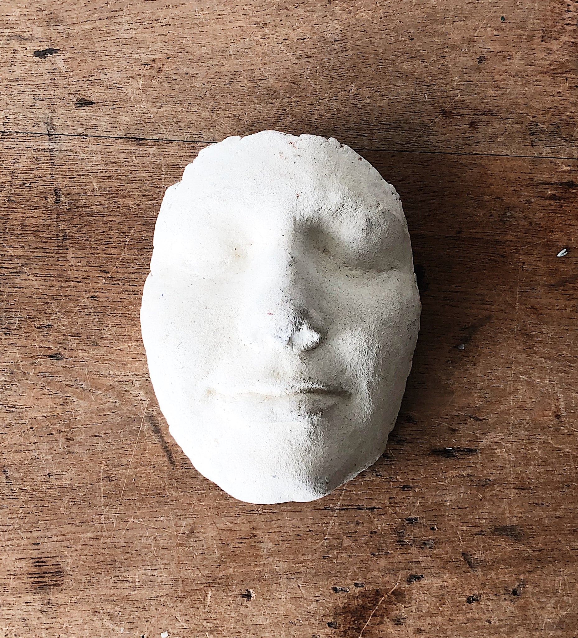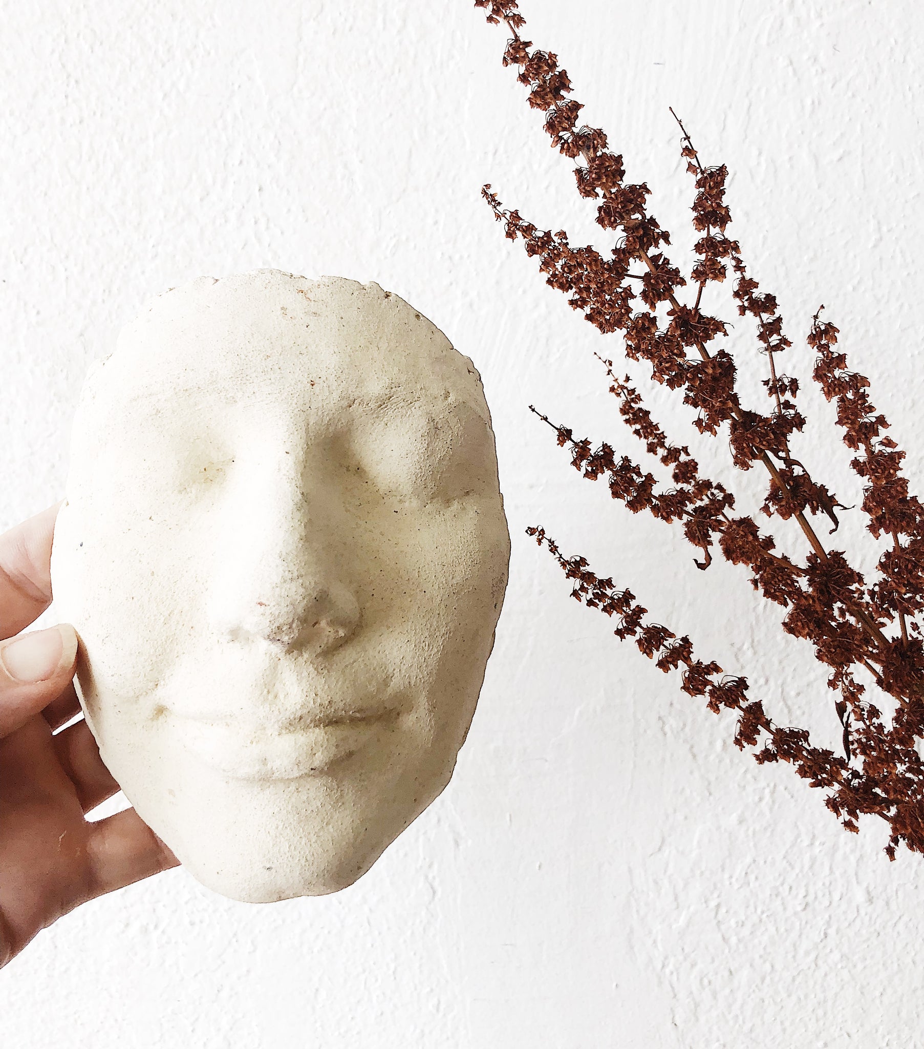 A handmade ceramic mask, very realistic. With a quiet serene expression