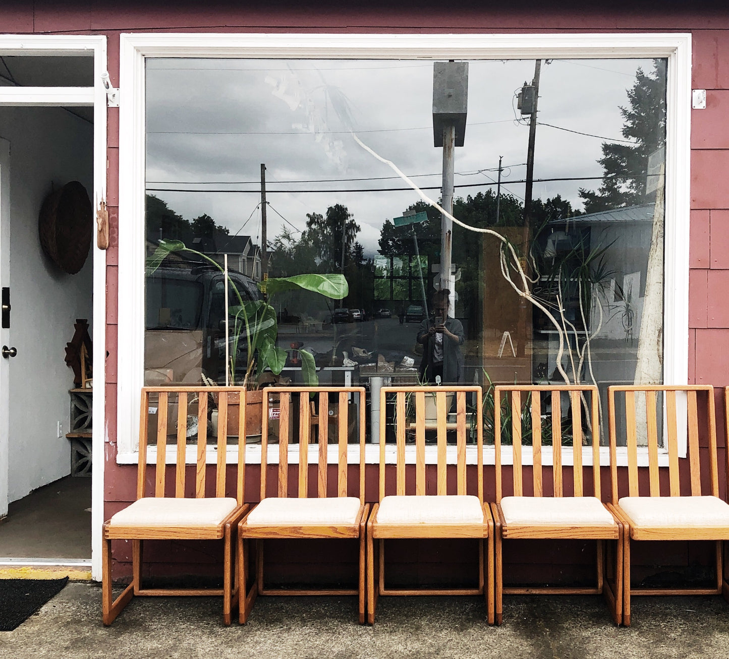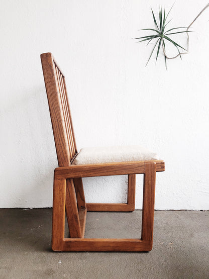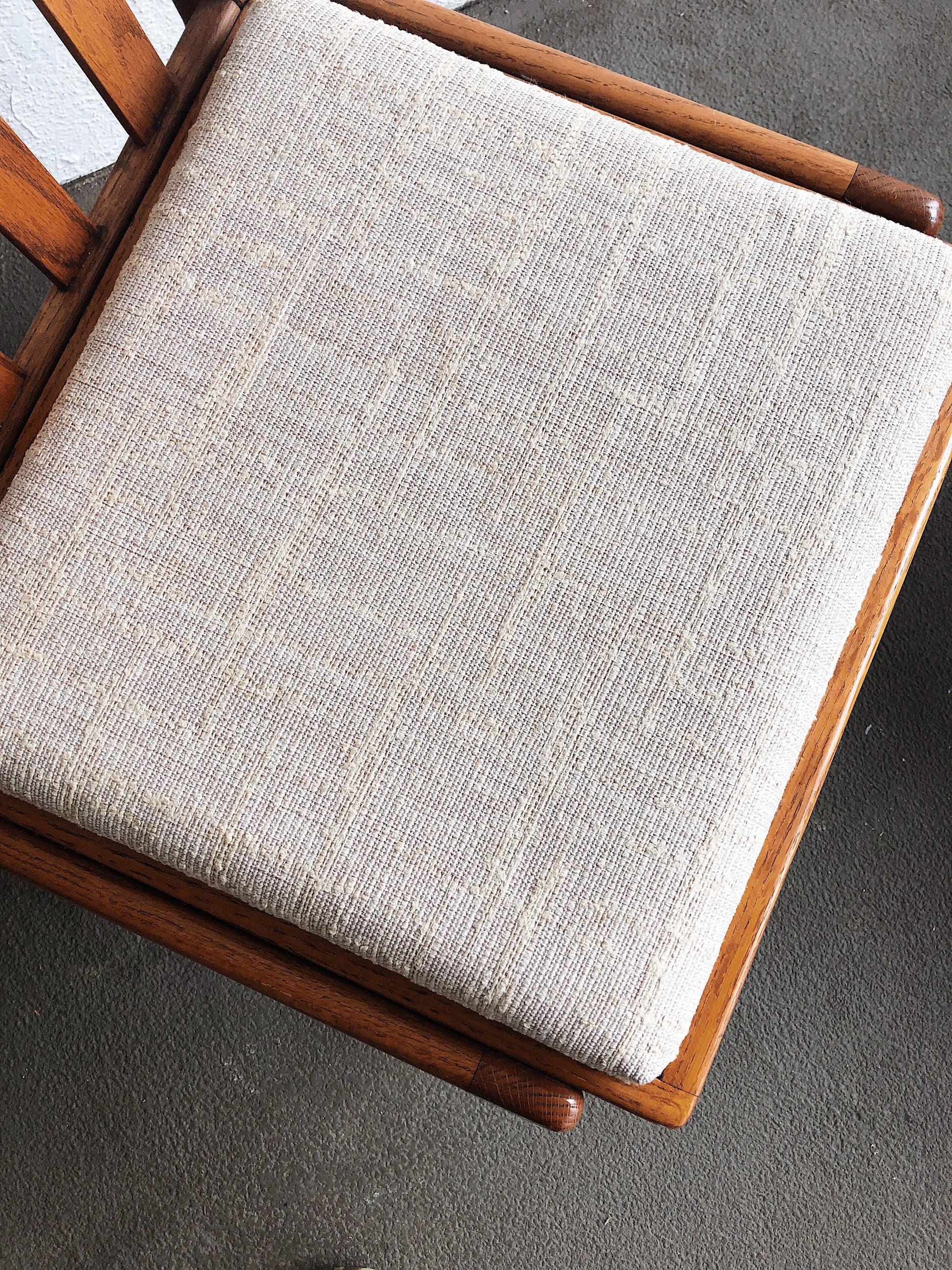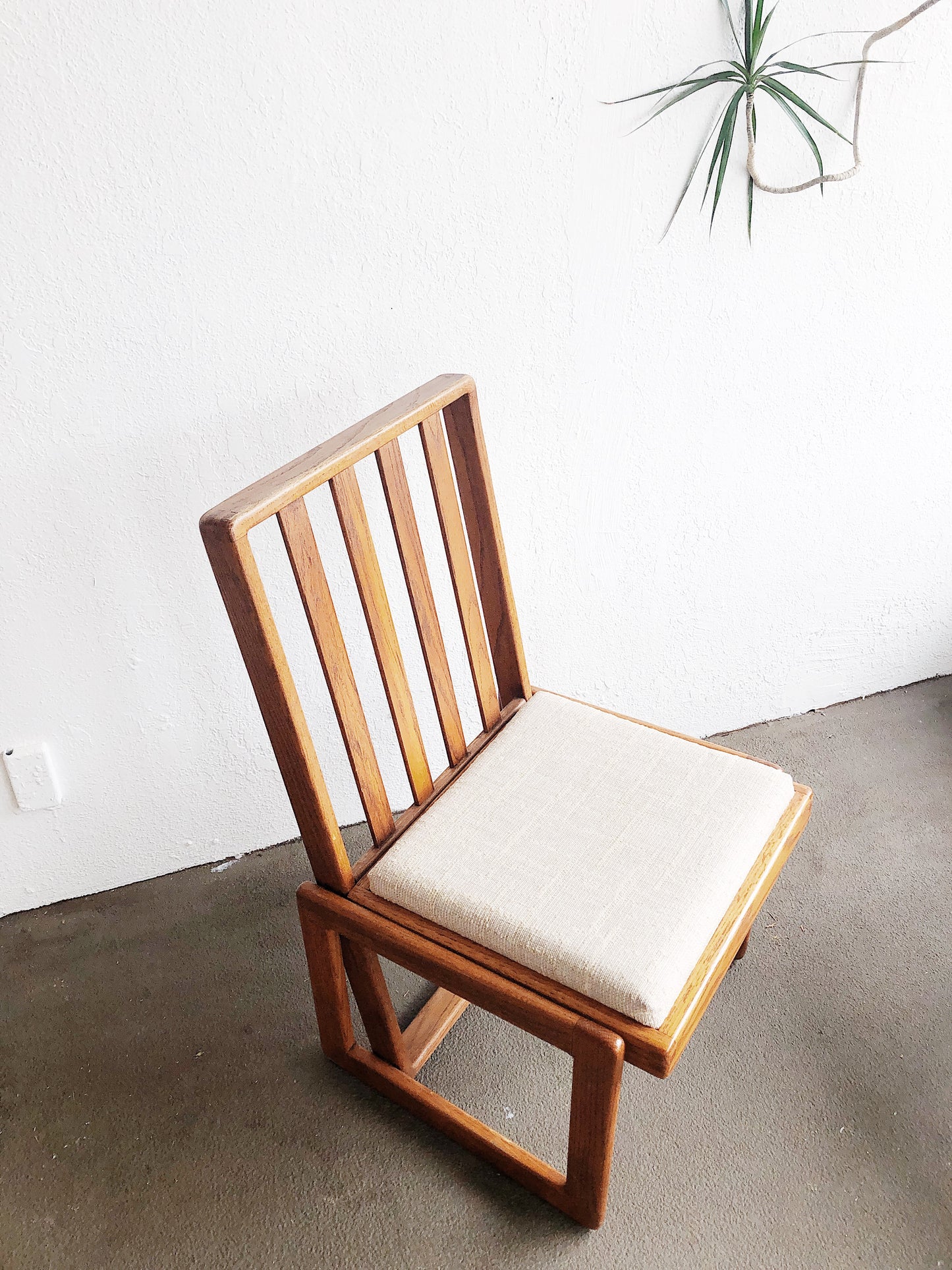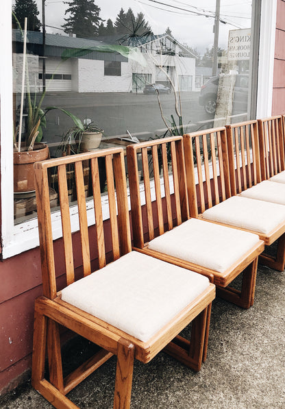 Gorgeous vintage late seventies dining chairs. Look at that design! California made. Heavy duty oak. Off white nubby fabric is in excellent condition. Super comfy