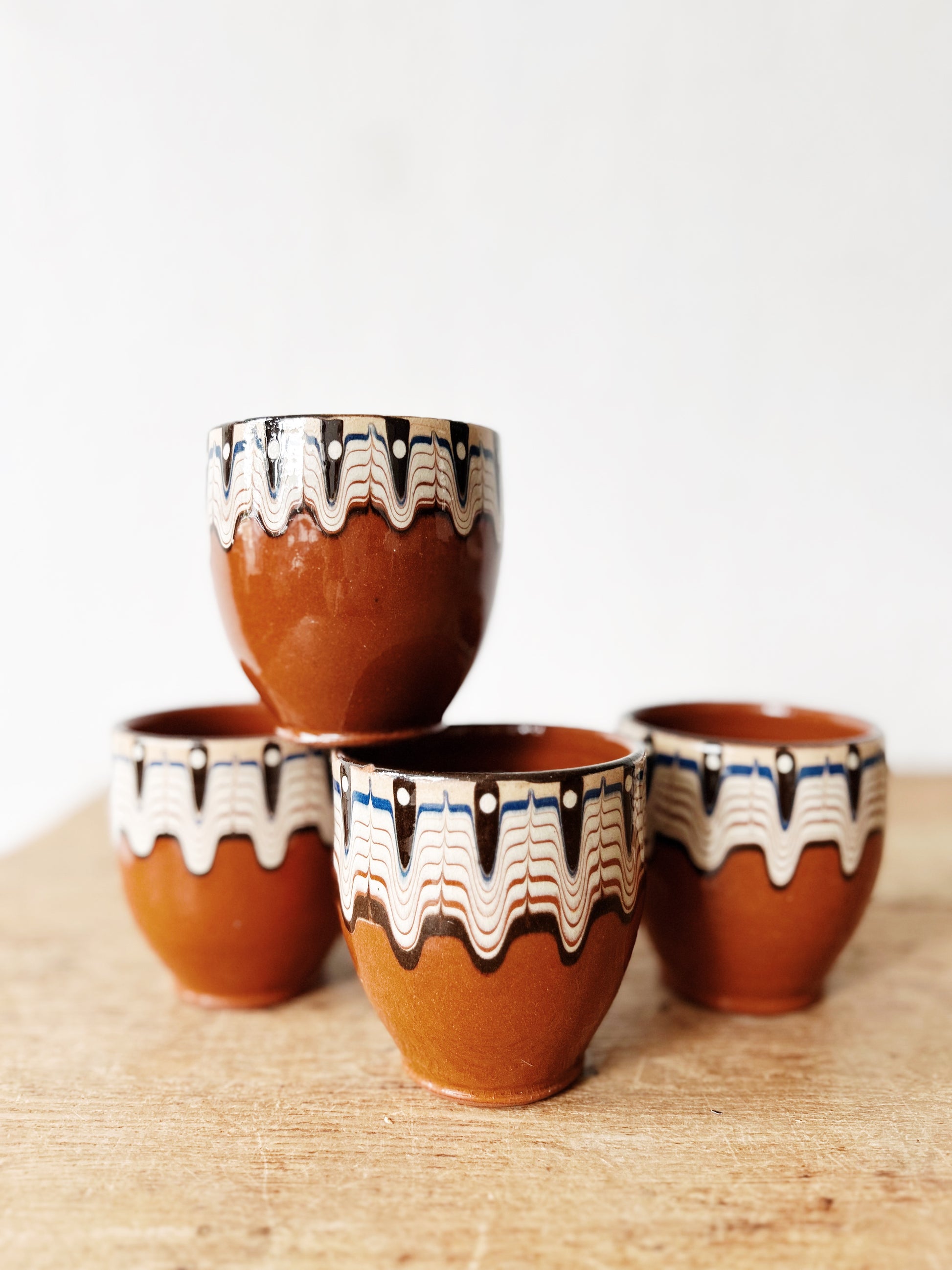 Set of four Belgian ceramic slip ware pottery cups. The traditional way to drink wine or fermented drinks in the Eastern European country.
