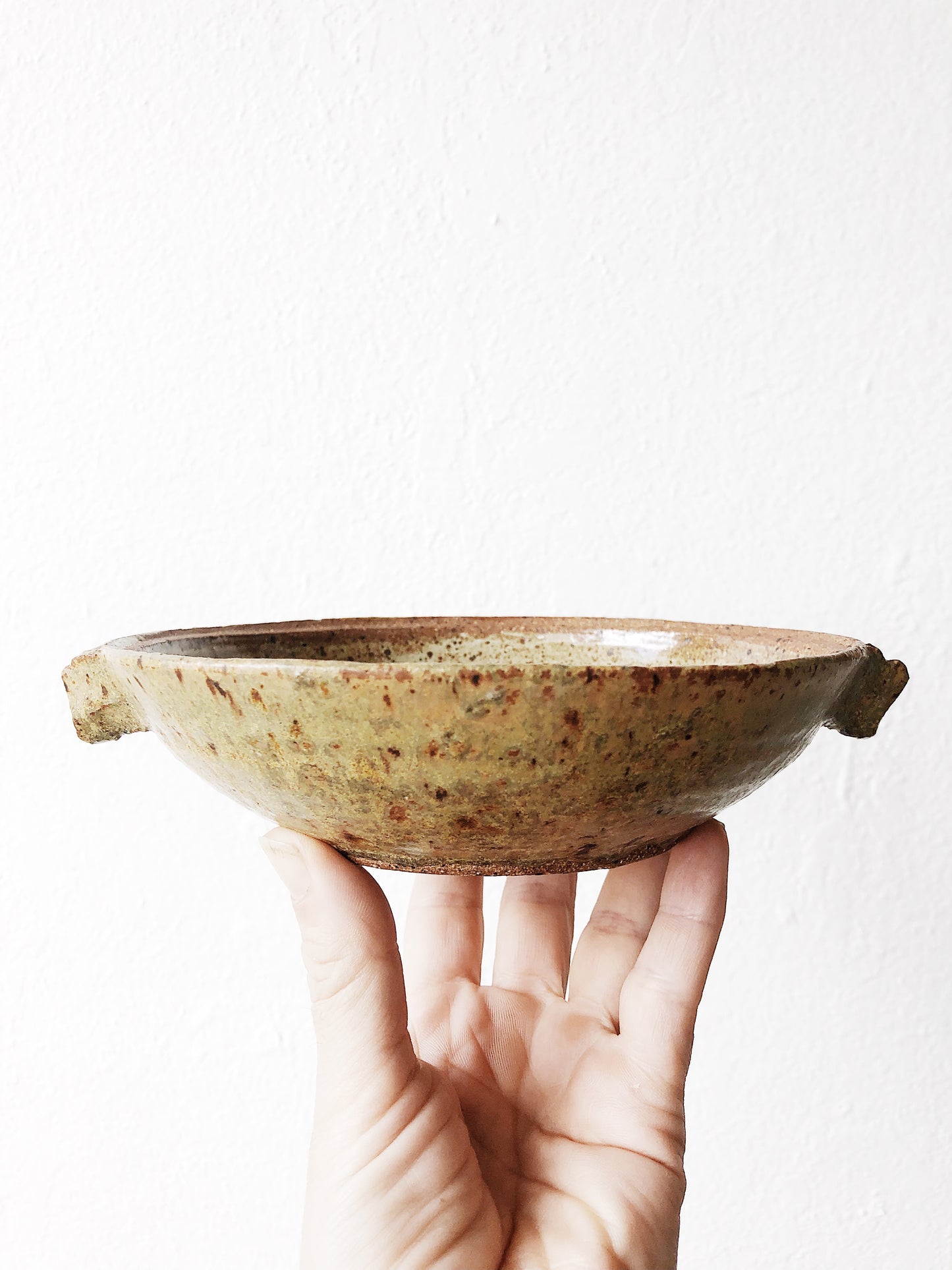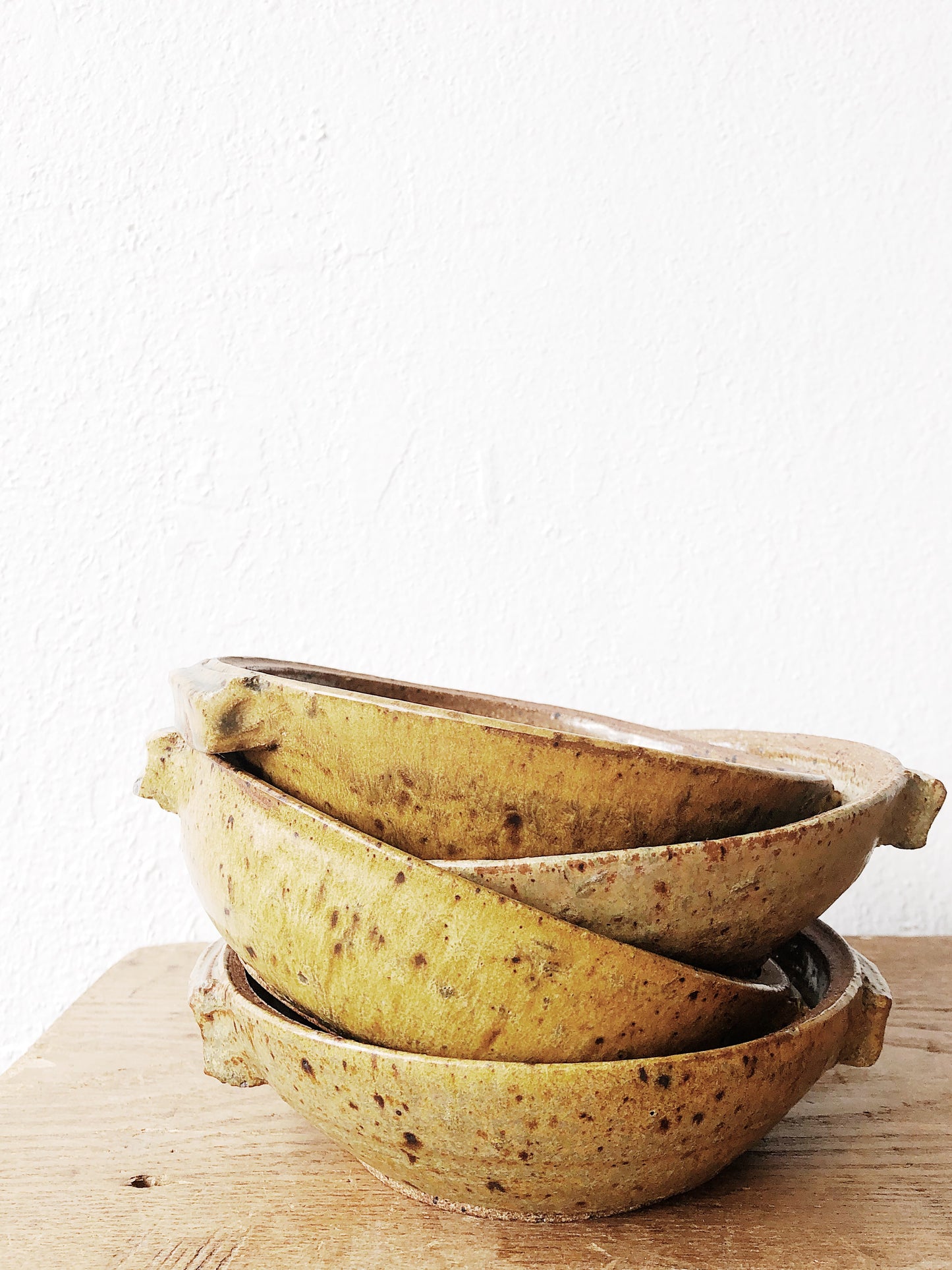 Lovely handmade vintage Stoneware shallow bowls. Love the handle details. With speckled interiors and matte ochre exteriors these go from salad to side dish to ice cream easily. Warm and earthy.