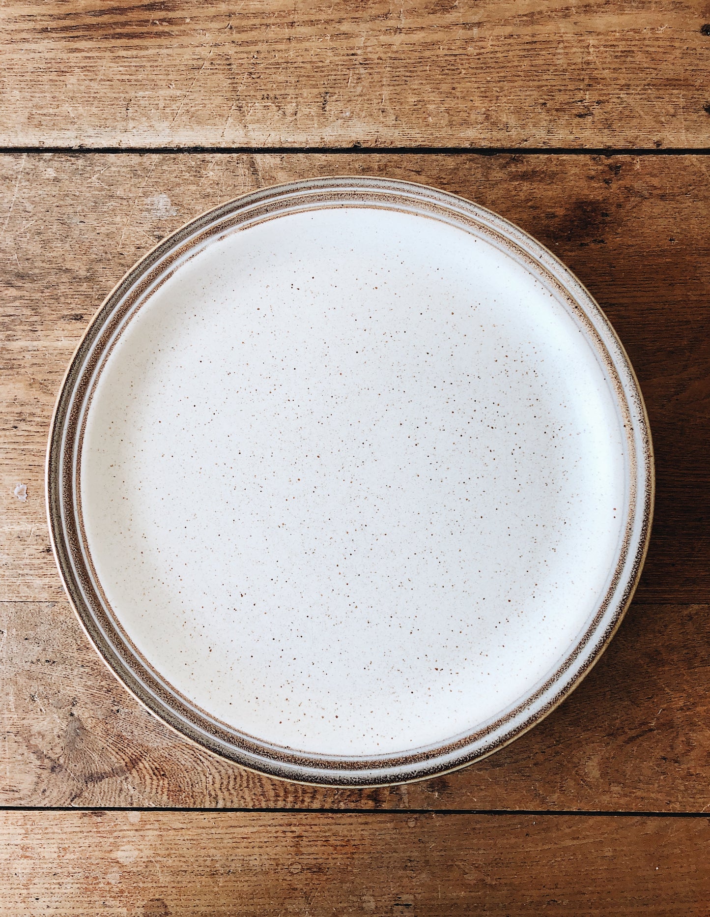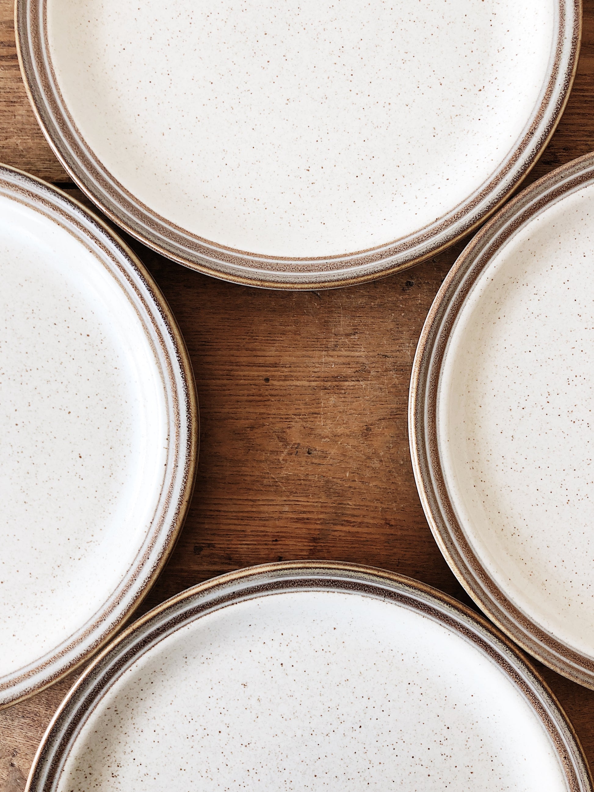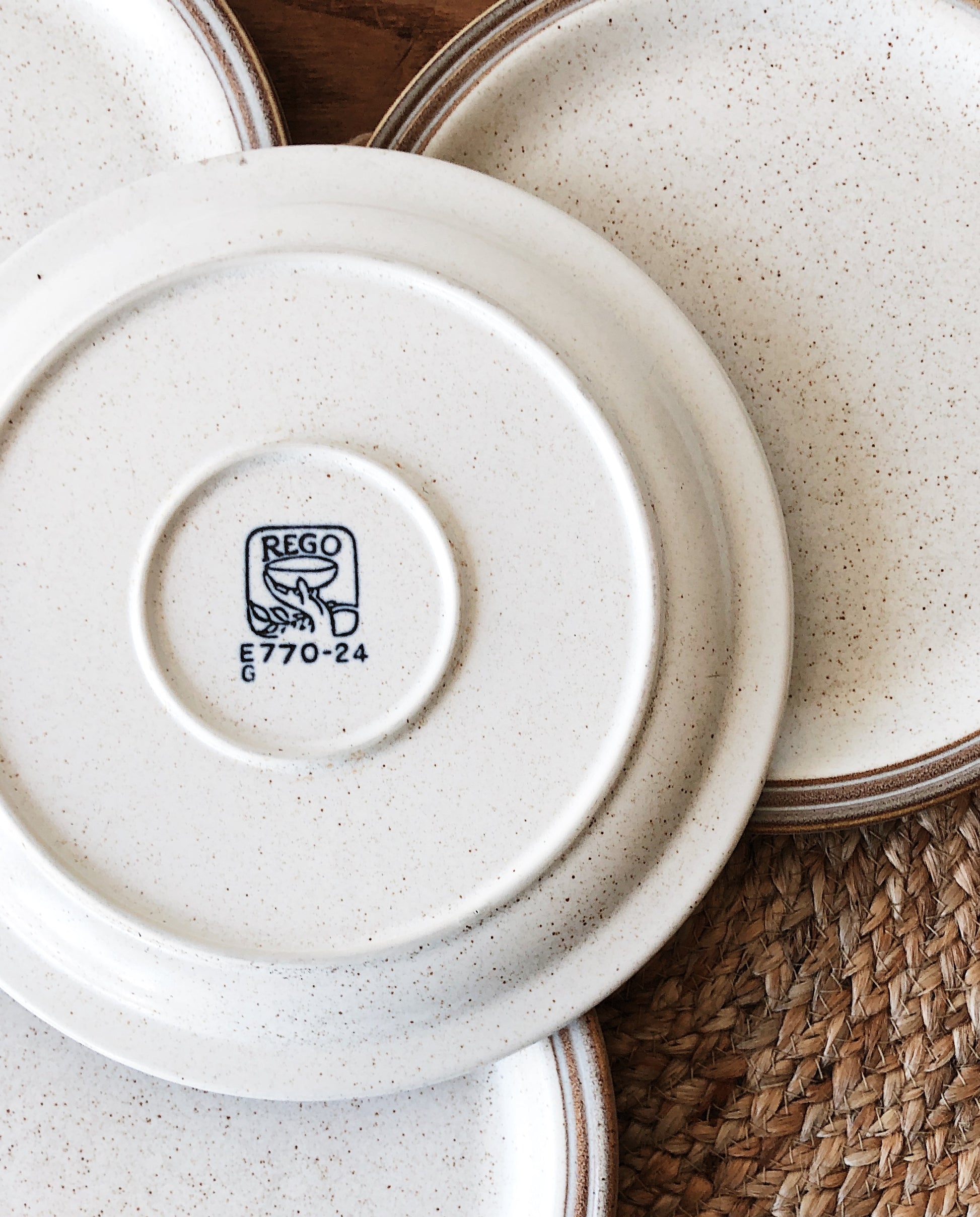 A nice neutral set of restaurant ware dishes. Rega stoneware is oven to table and super sturdy. Flecked oatmeal with a palest grey blue rim