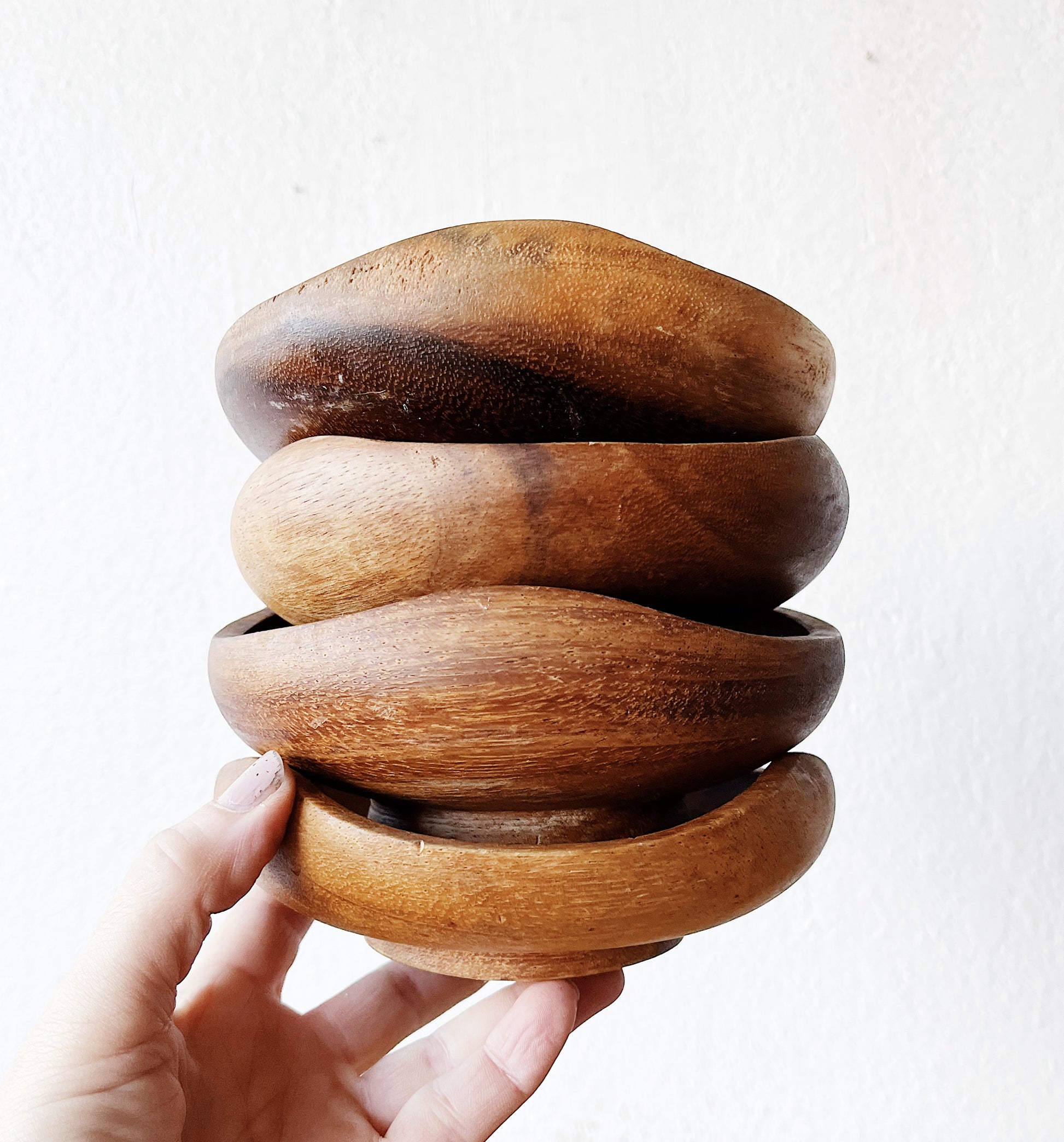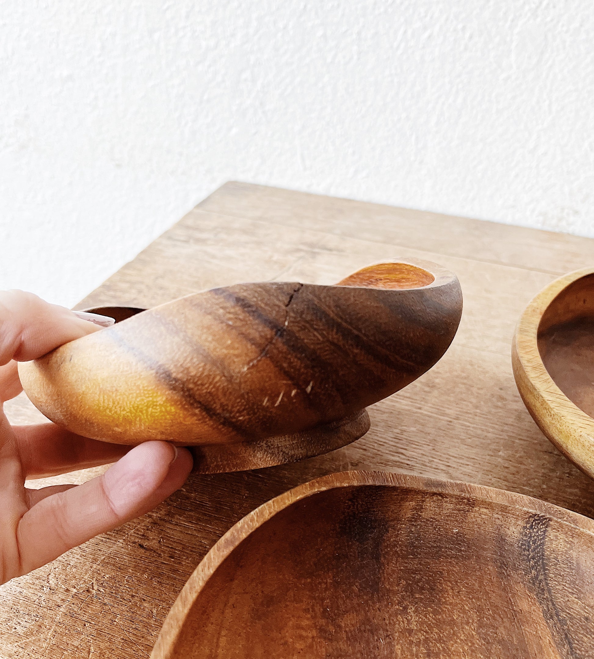 Snack or small salad wood bowls with that fab wavy design. Weighty for their size. One small crack on one bowl as shown