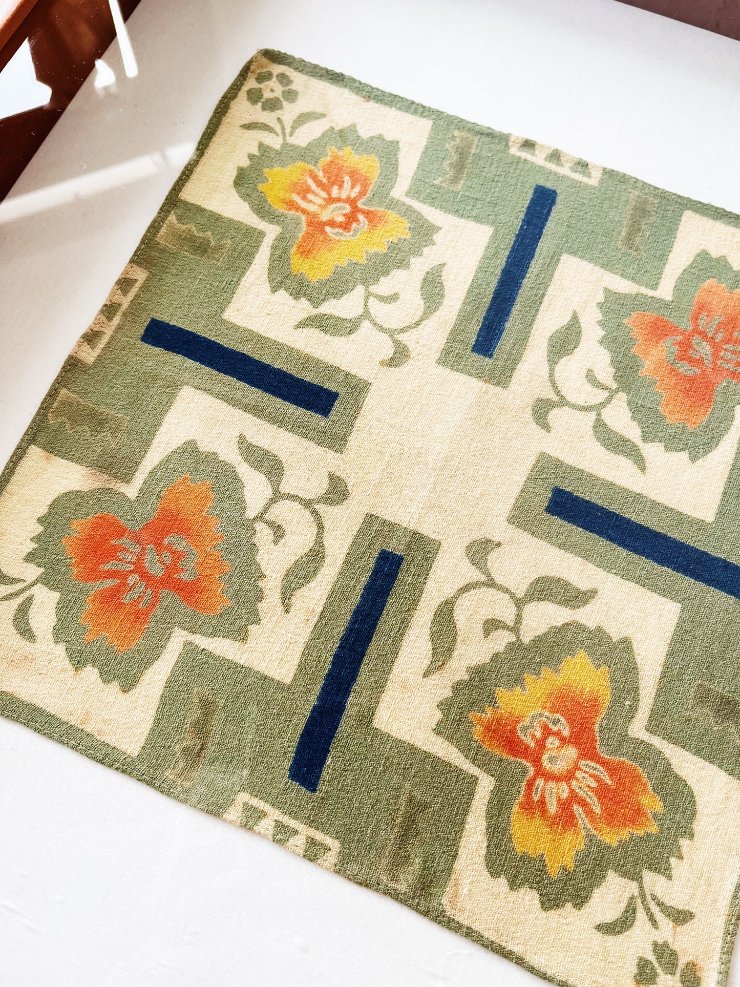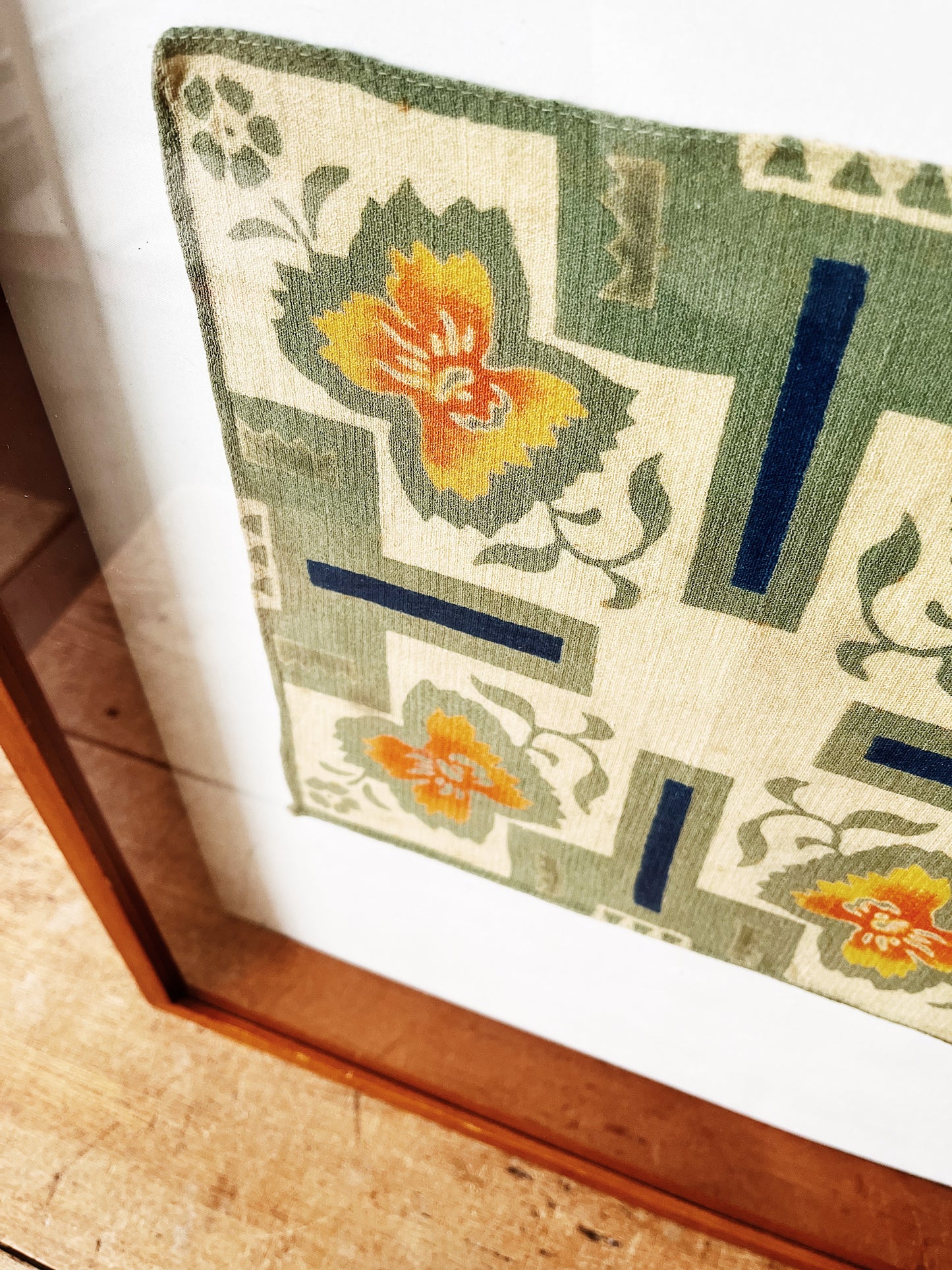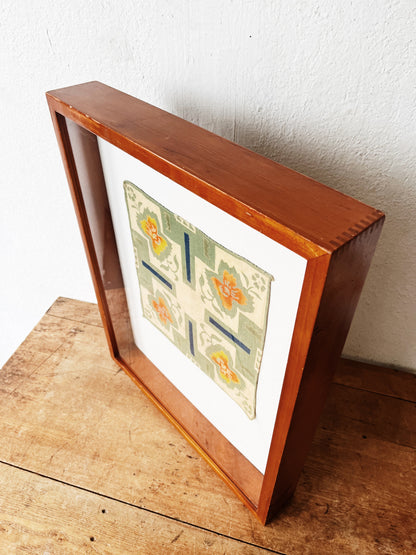 Such a beautiful old textile from the 1920s. Silk retains its vivid colors. Mounted on silk and in a dovetailed wood box frame under glass. Lovely!