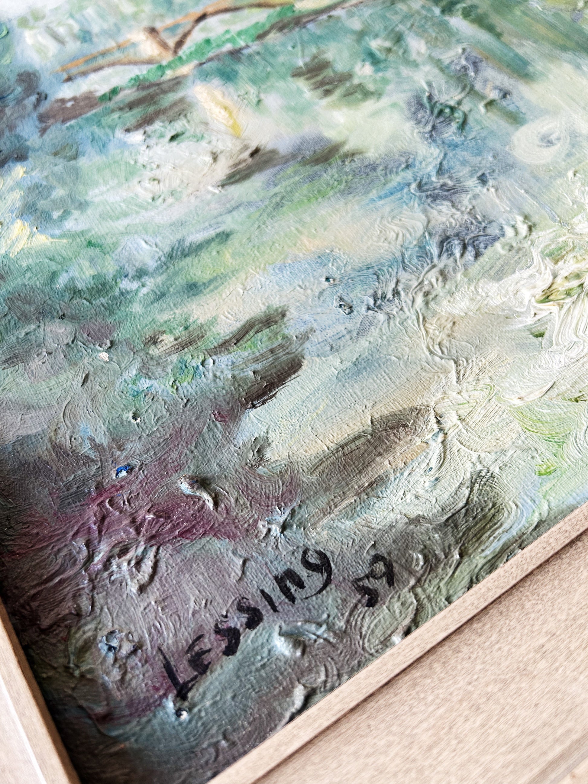 Bucolic original oil landscape framed in vintage wood with wire hanger. Signed and dated c1959