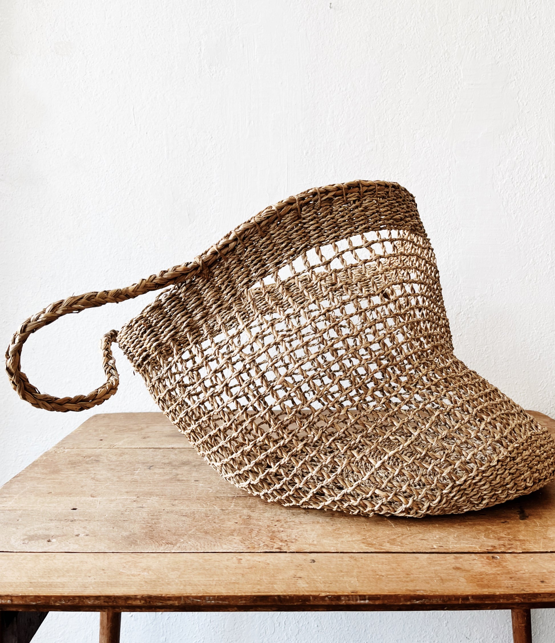 Woven tote bag in strong natural jute. Free form shape makes this look nice just thrown on the floor or hanging form a hook (great for holding towels). Nice beach or river tote
