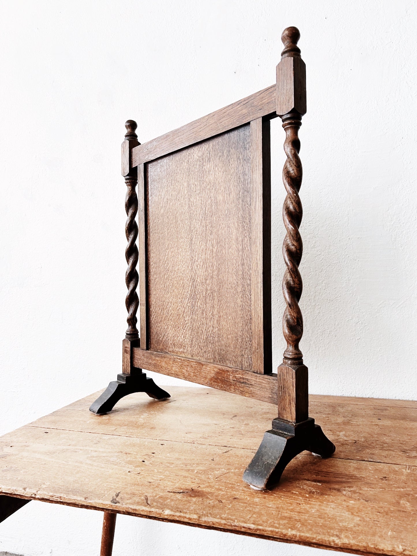 Small antique wood fireplace screen with barley twist sides.