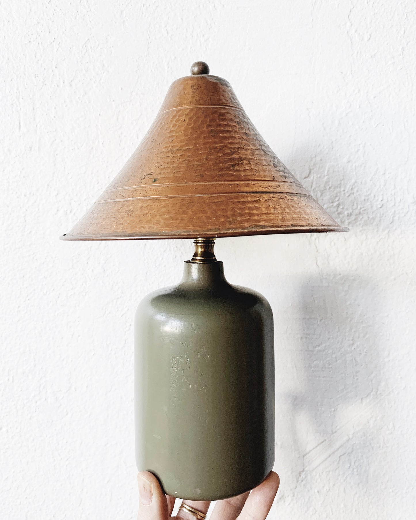 Small olive green lamp with hammered copper clamp on shade. I found these separately and they aren’t a ‘perfect’ fit but I love them together. I was cleaning the lamp base and accidentally scraped off some of the paint (eyeroll!) sorry about that, please see photo. Can touch up with a little paint! I’ll try to do that before sending it off to it’s new home :) The base is painted wood.