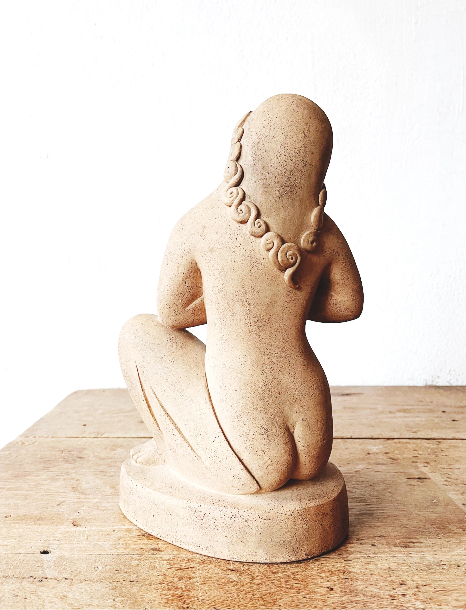 Contemplative and serene sandstone sculpture in a pale terra color. In the style of Lagriffoule. Weighty enough for use as a bookend or doorstop