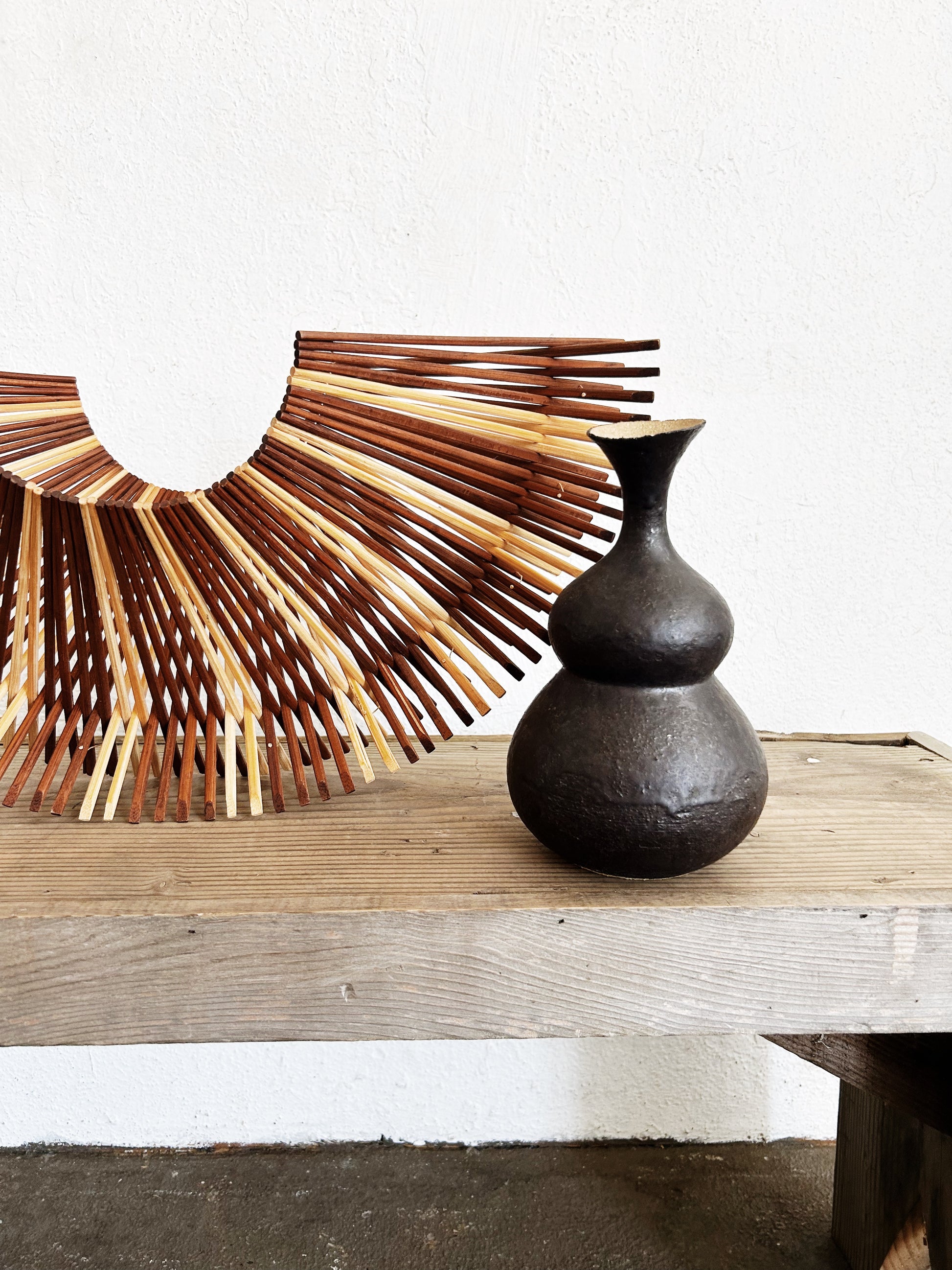 Wonderful gourd shaped pottery vase in matte black. Love the wonky shape. Signed