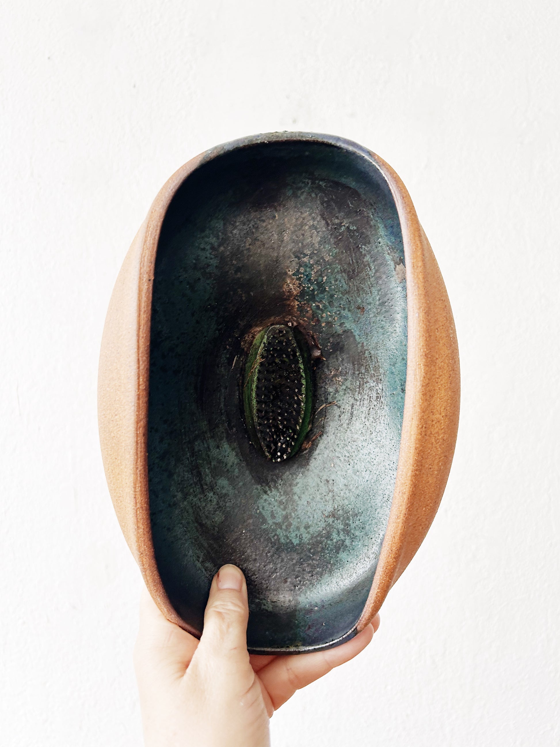 Earthy stoneware vessel with drippy indigo glaze. Has a flower frog for holding, displaying little bouquets