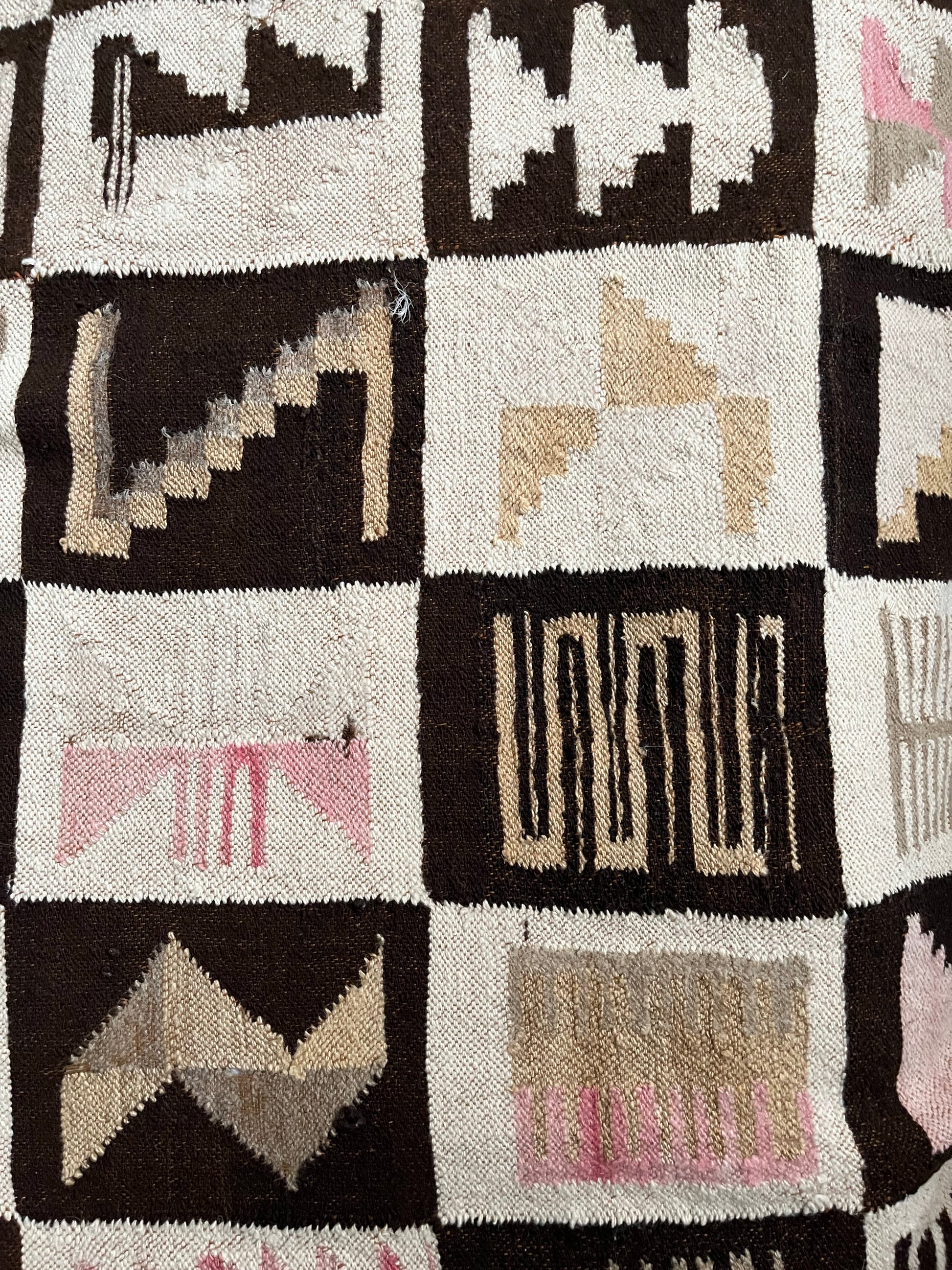 Gorgeous wool textile in a medium weight. Wool. Colors of dark brown ochre ecru warm pink. Charmingly hand mended with only a few small areas of unmend