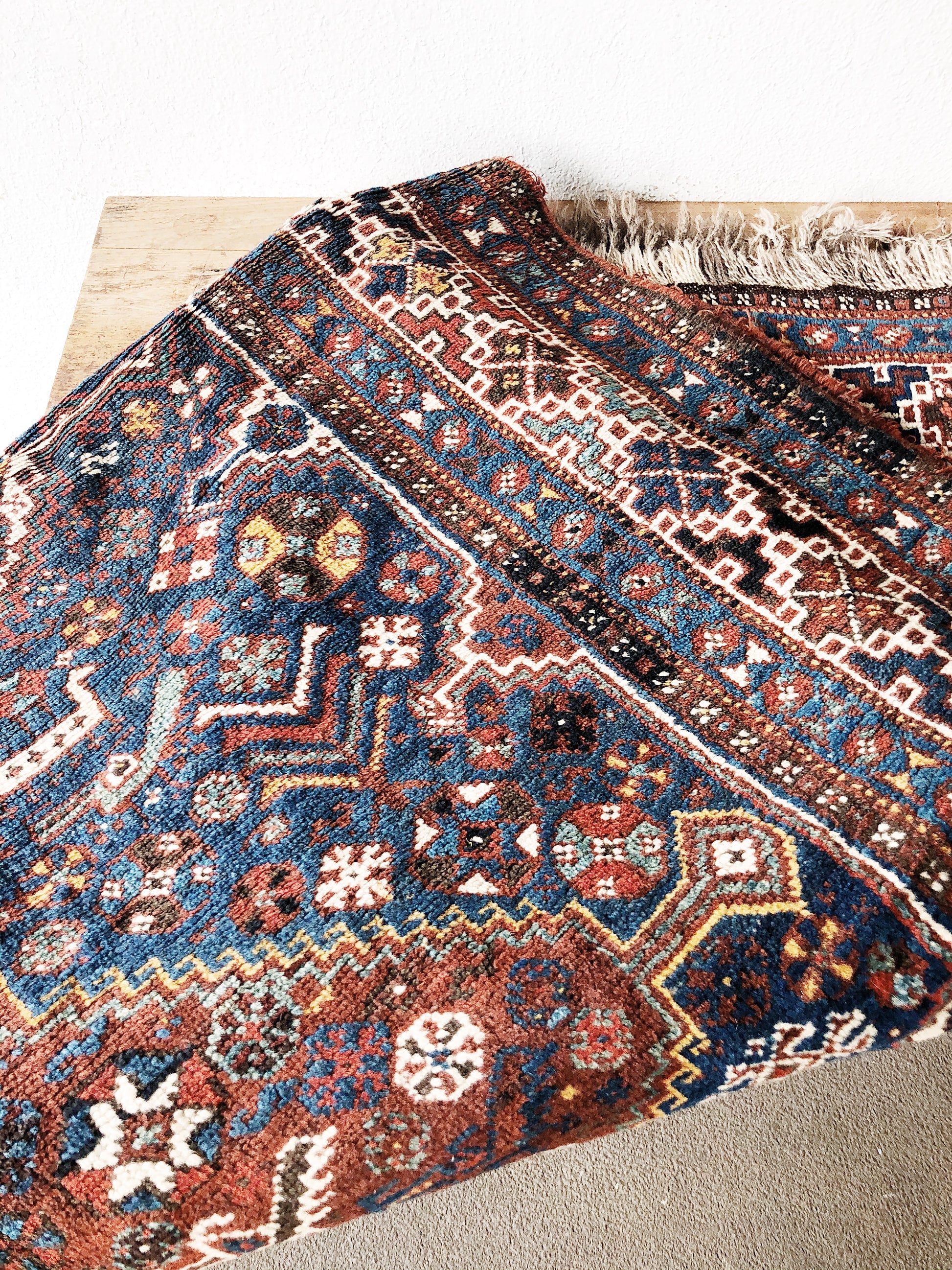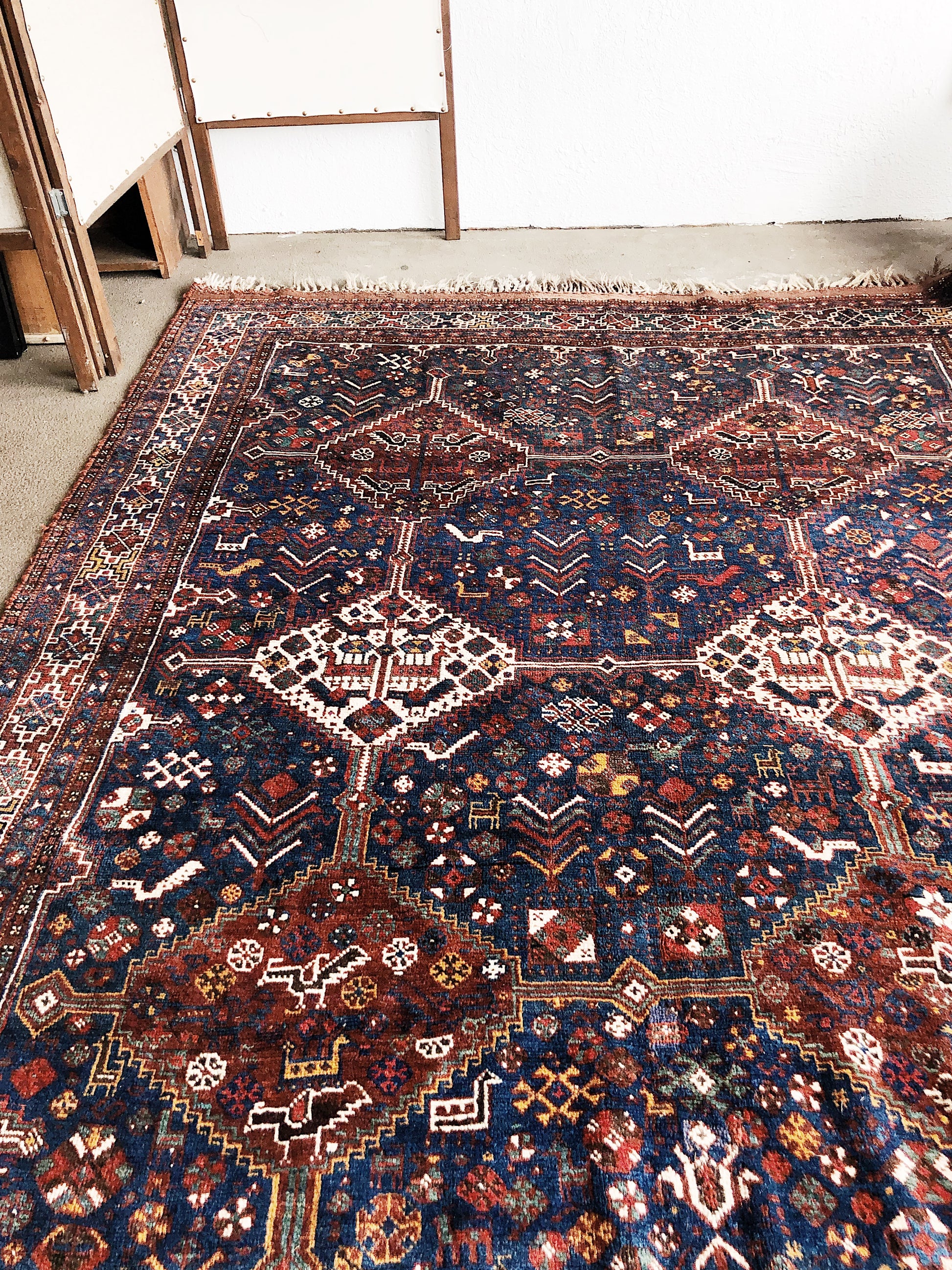 Gorgeous wool Persian in a hard to find large squarish shape. Deep colors mix with charming imagery of birds and animals nestled in the design. Retains much of the soft pile with almost no wear. Natural dyes and you can see where the wool from different colored sheep was used in the trim. Super clean