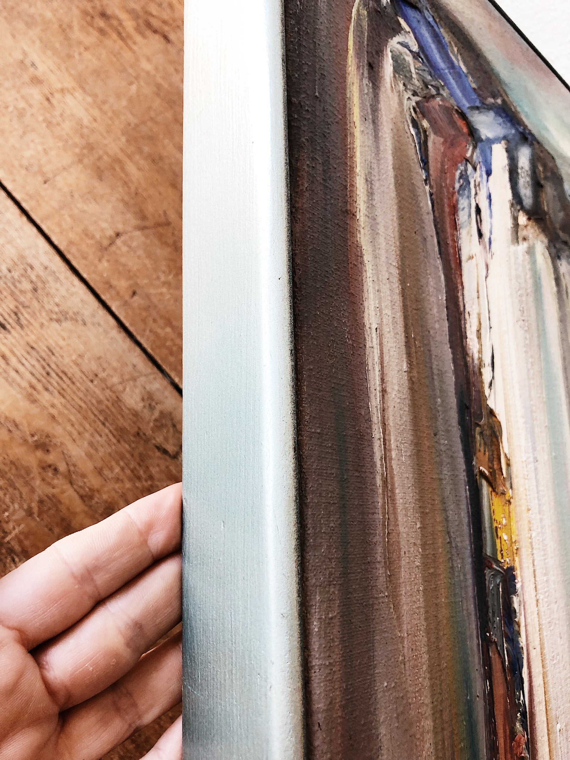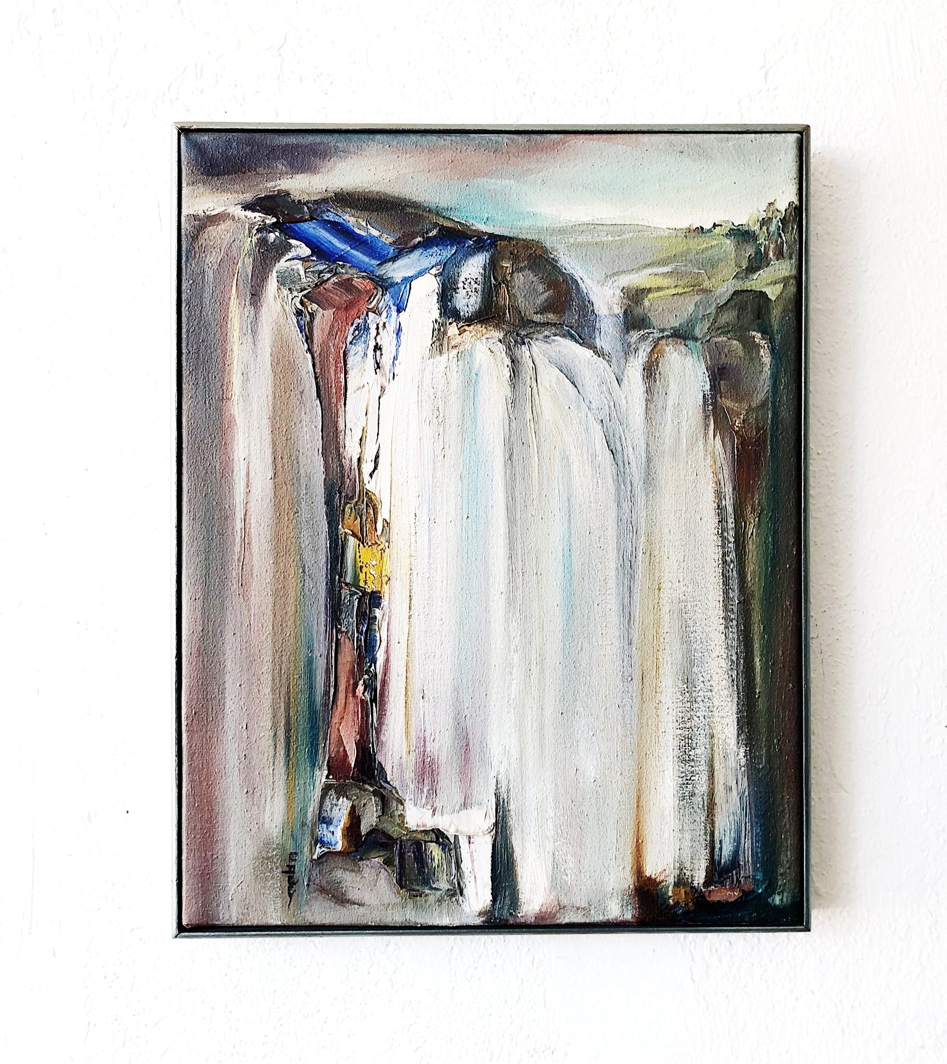Really gorgeous painting signed by the artist. Oil on linen. The colors are out of this world. Titled Falls Along the Columbia Gorge. Framed in painted wood