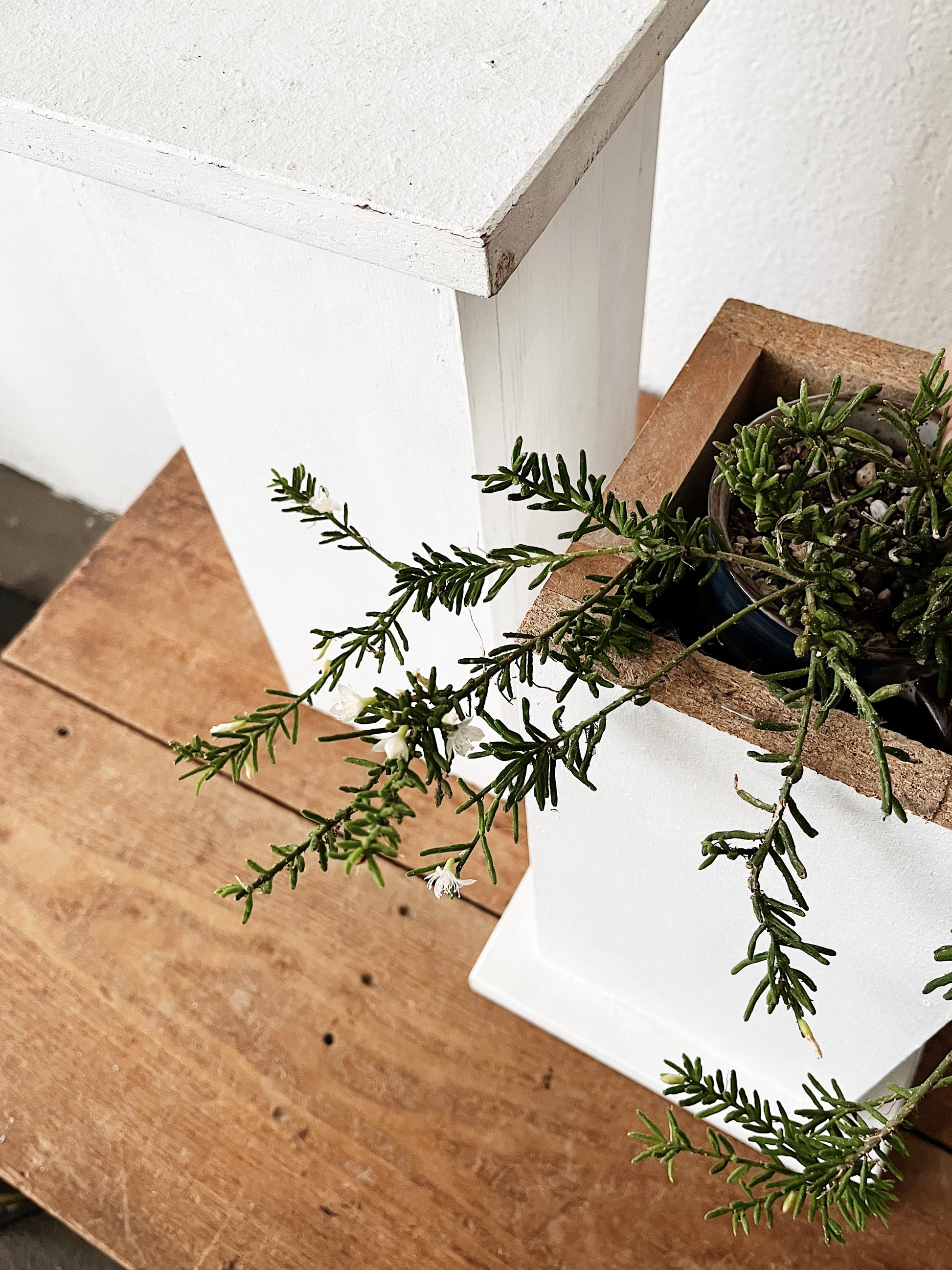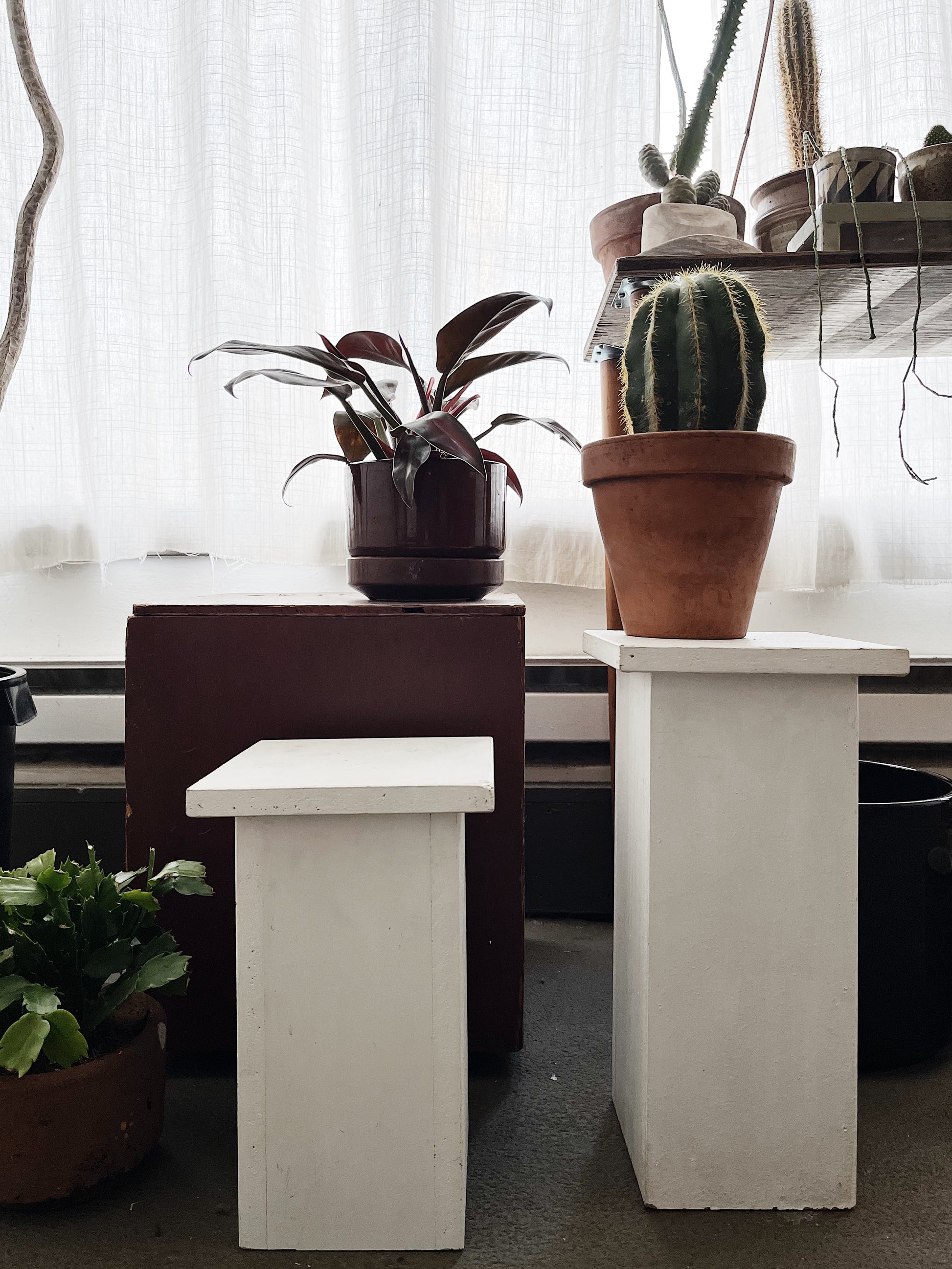 Simple and blocky display stand. Painted white over thick fiberboard. Sturdy and weighty. Flipped over they would make cool planters with a terra insert