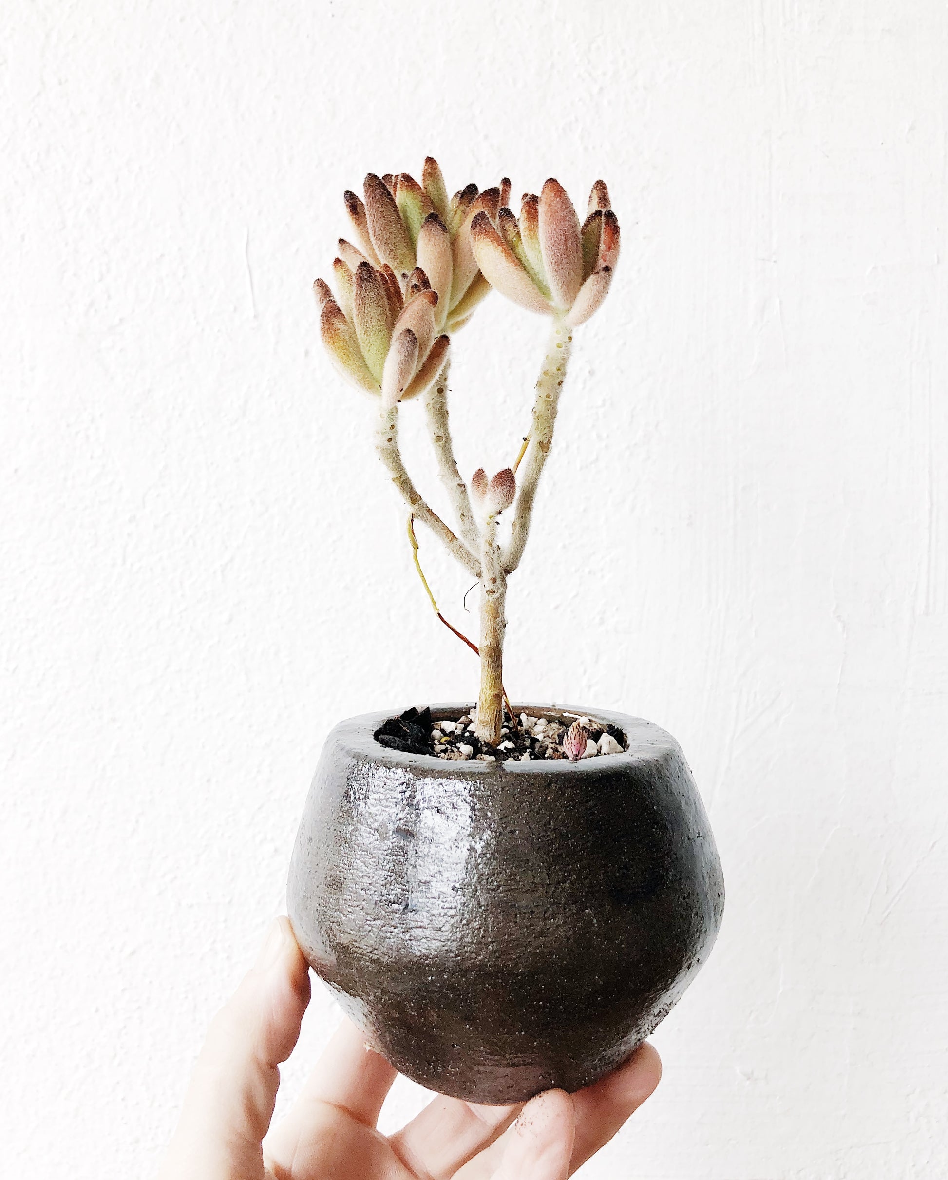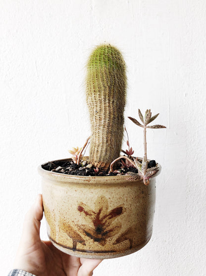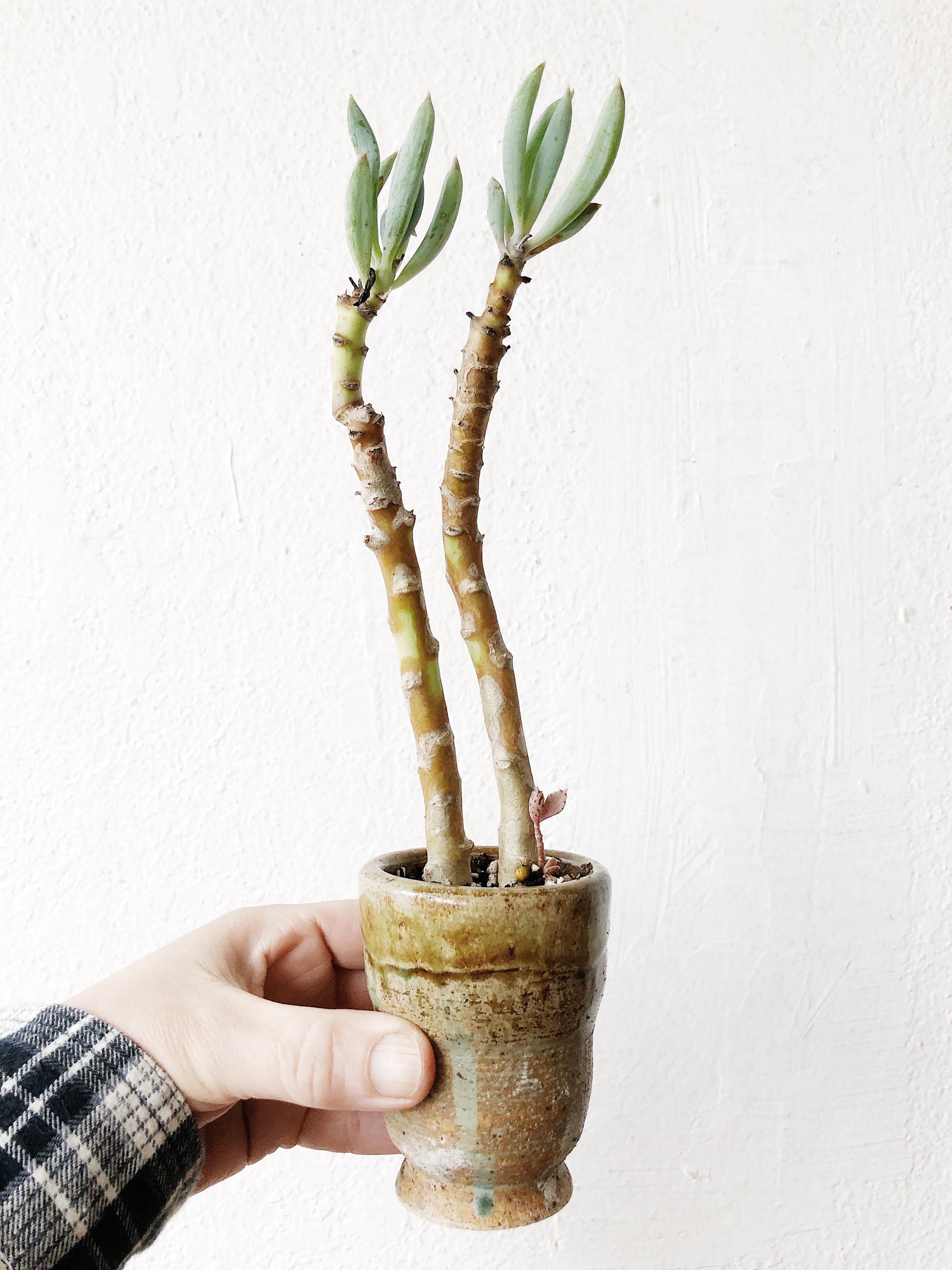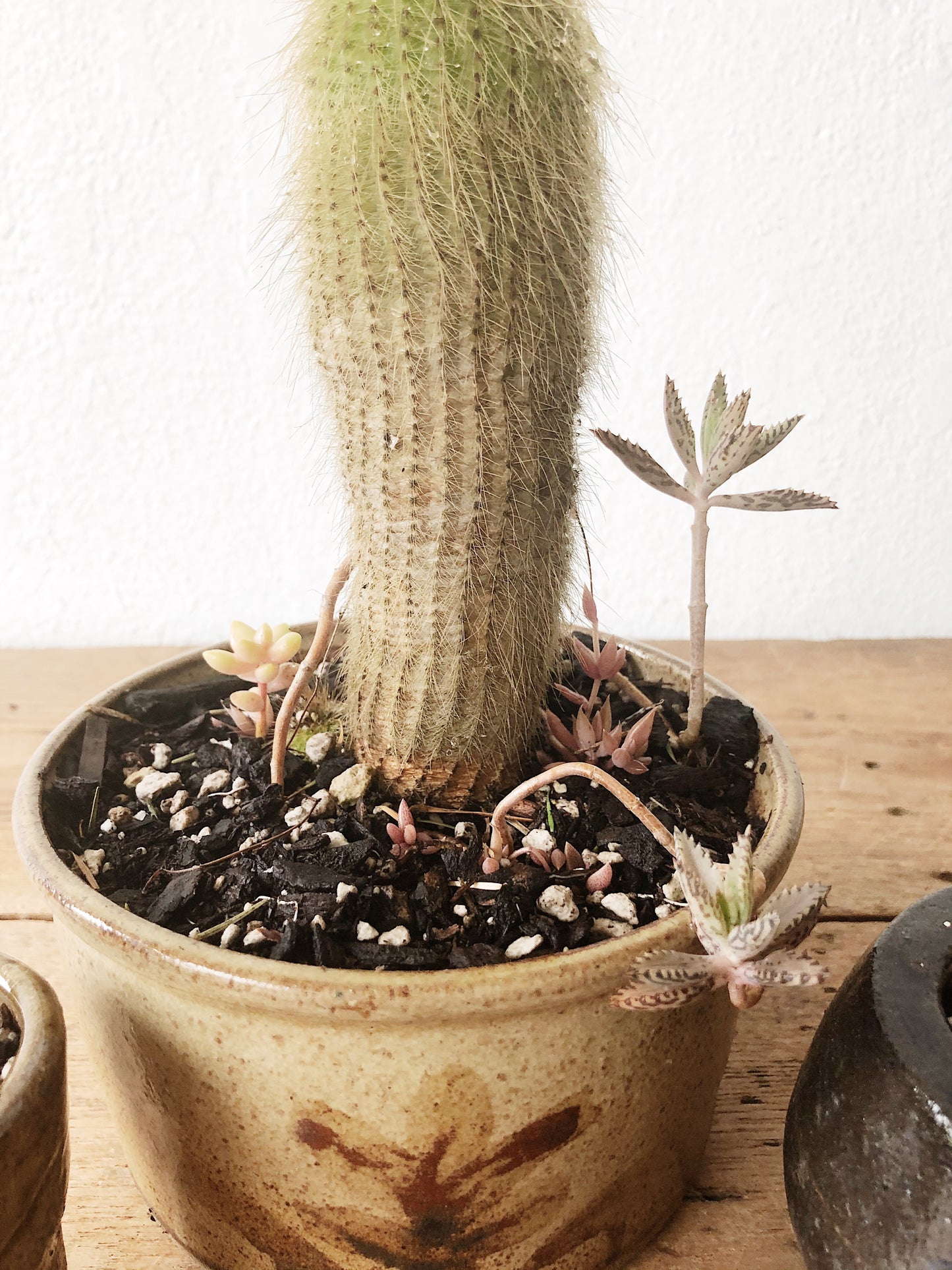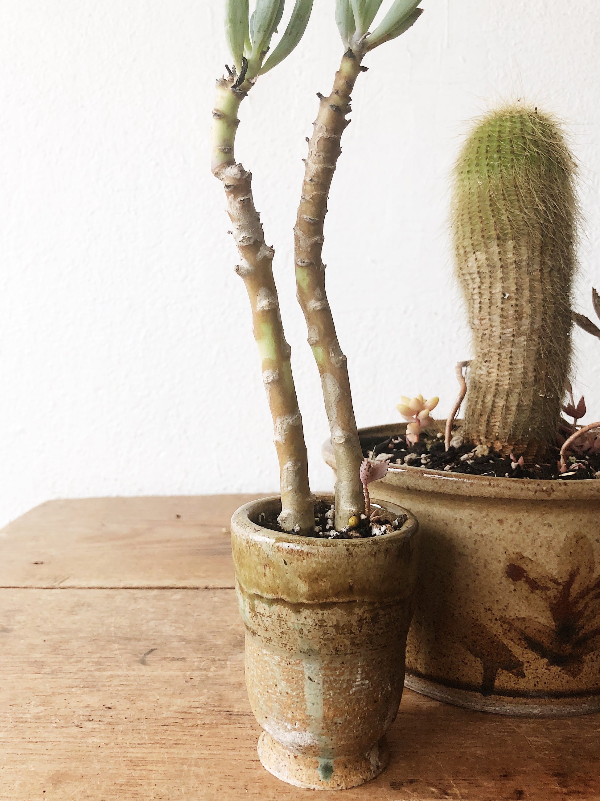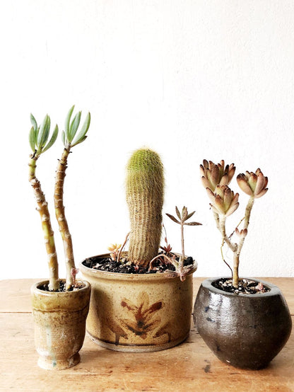 Part of a large collection of unusual succulents that we acquired, each one potted in a vintage vessel. many have multiple varieties growing within one pot.