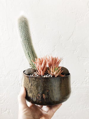 Part of a large collection of unusual succulents that we acquired, each one potted in a vintage vessel. many have multiple varieties growing within one pot.