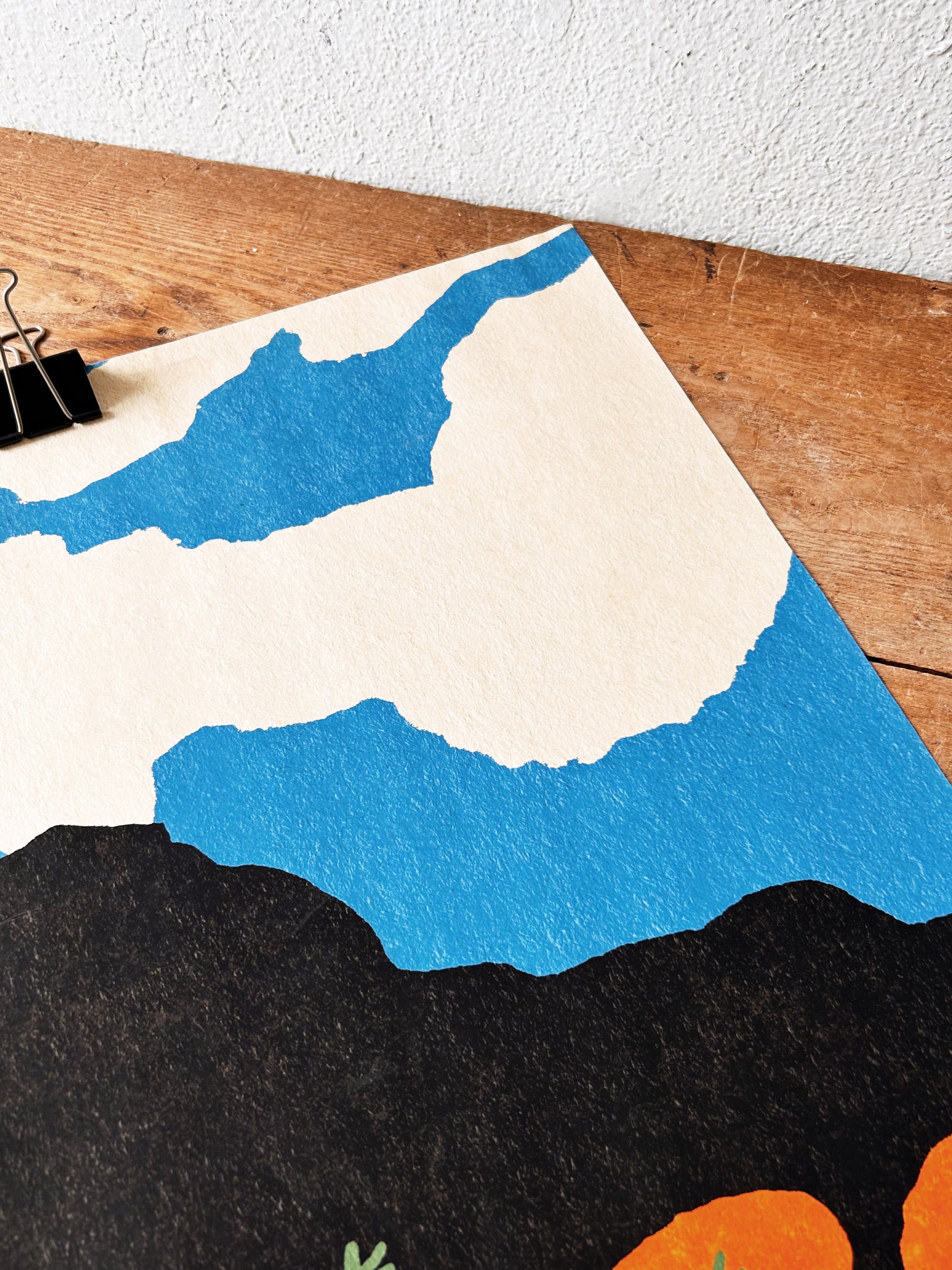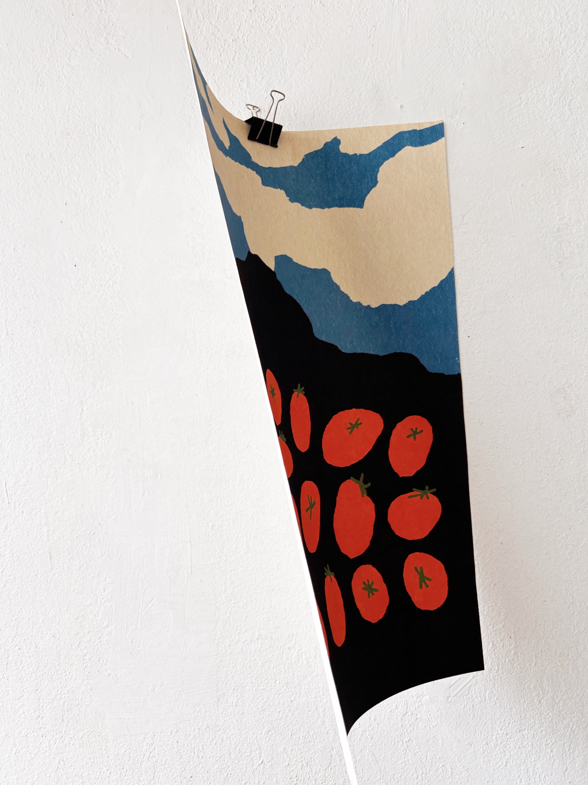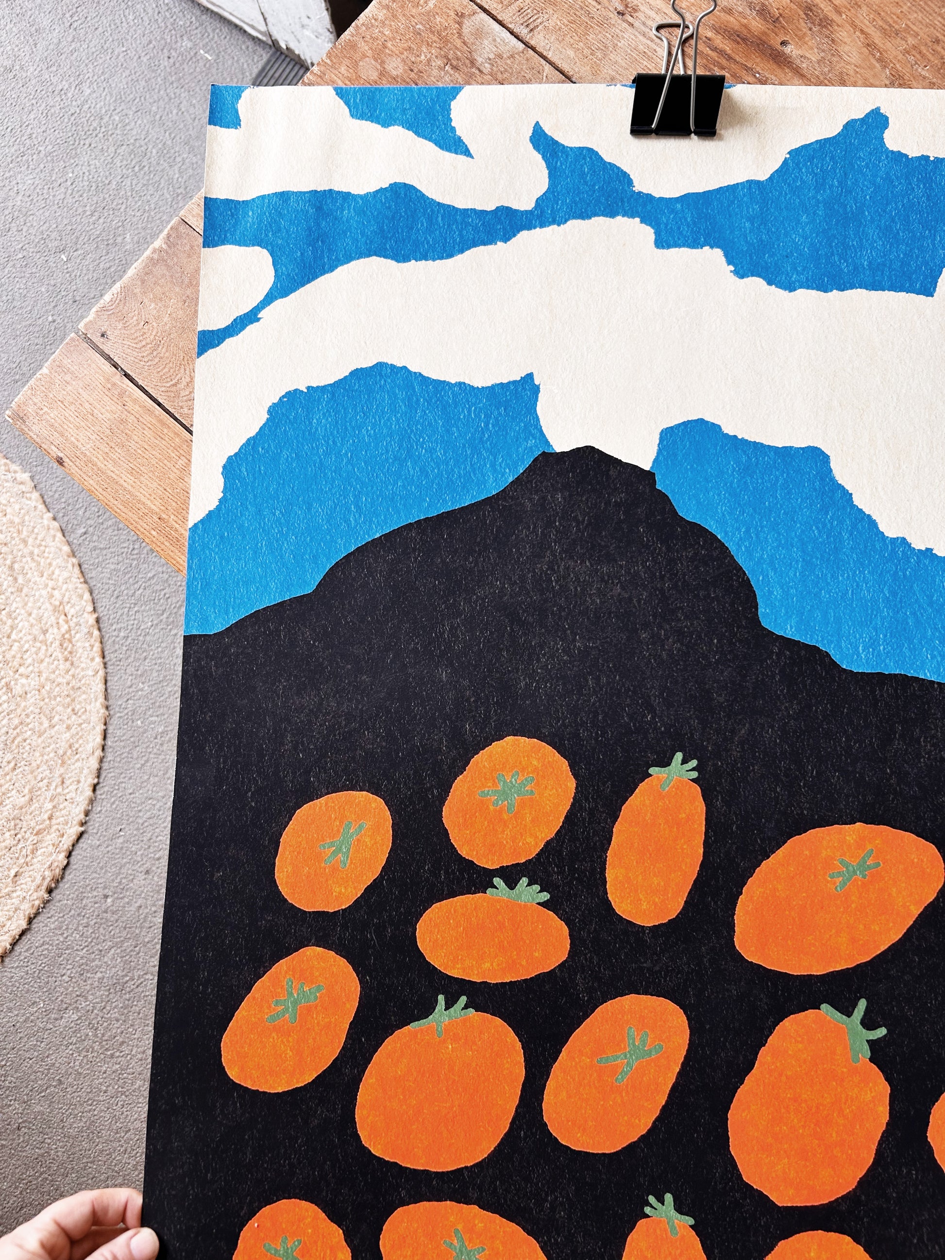 Vibrant sweet red tomatoas againt the backdrop of Mount Vesuvius and a bright blue sky. It is produced through the sophisticated giclée printing process on premium matte paper, sourced from sustainable forestry.