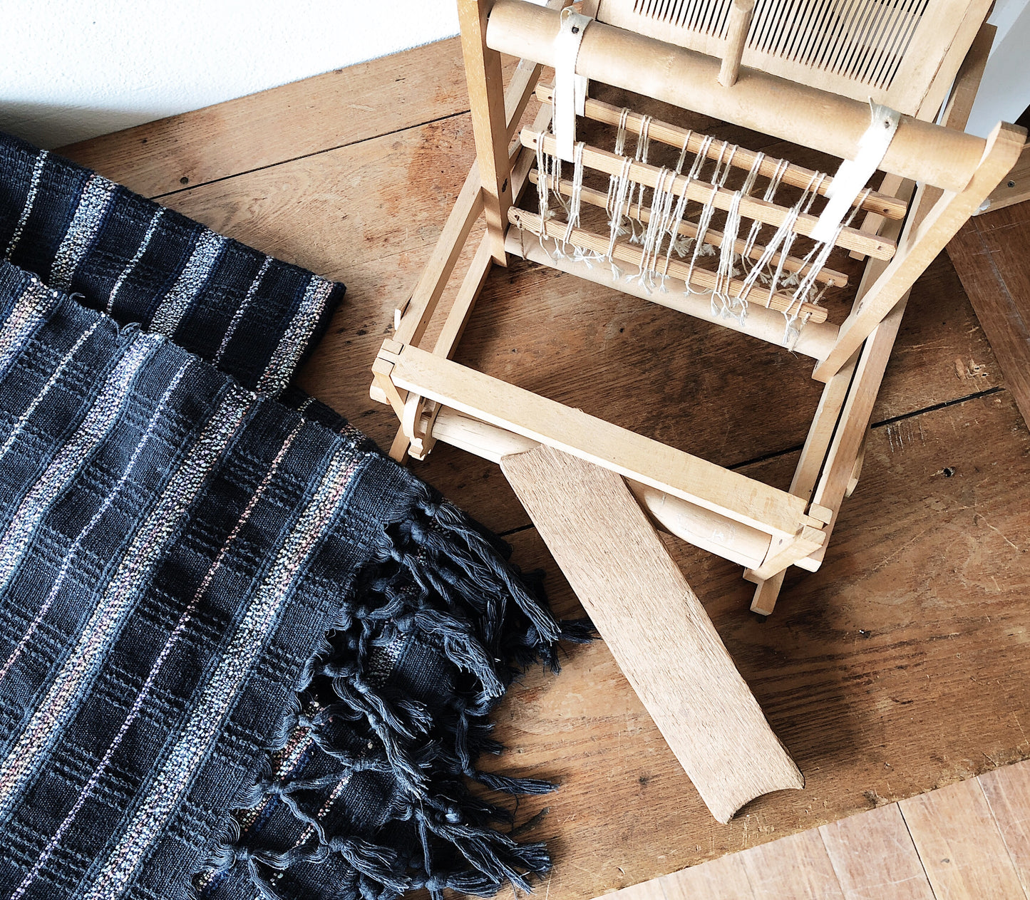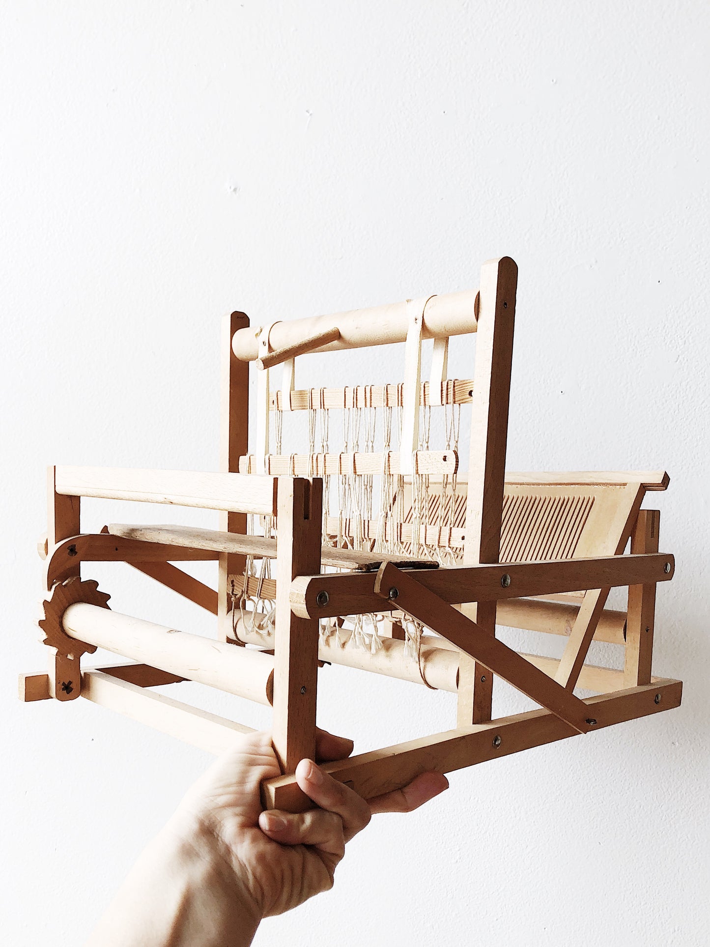 A compact table top loom perfect for a beginner or those that like to weave on the go. Made in Sweden. Wood, with all working parts