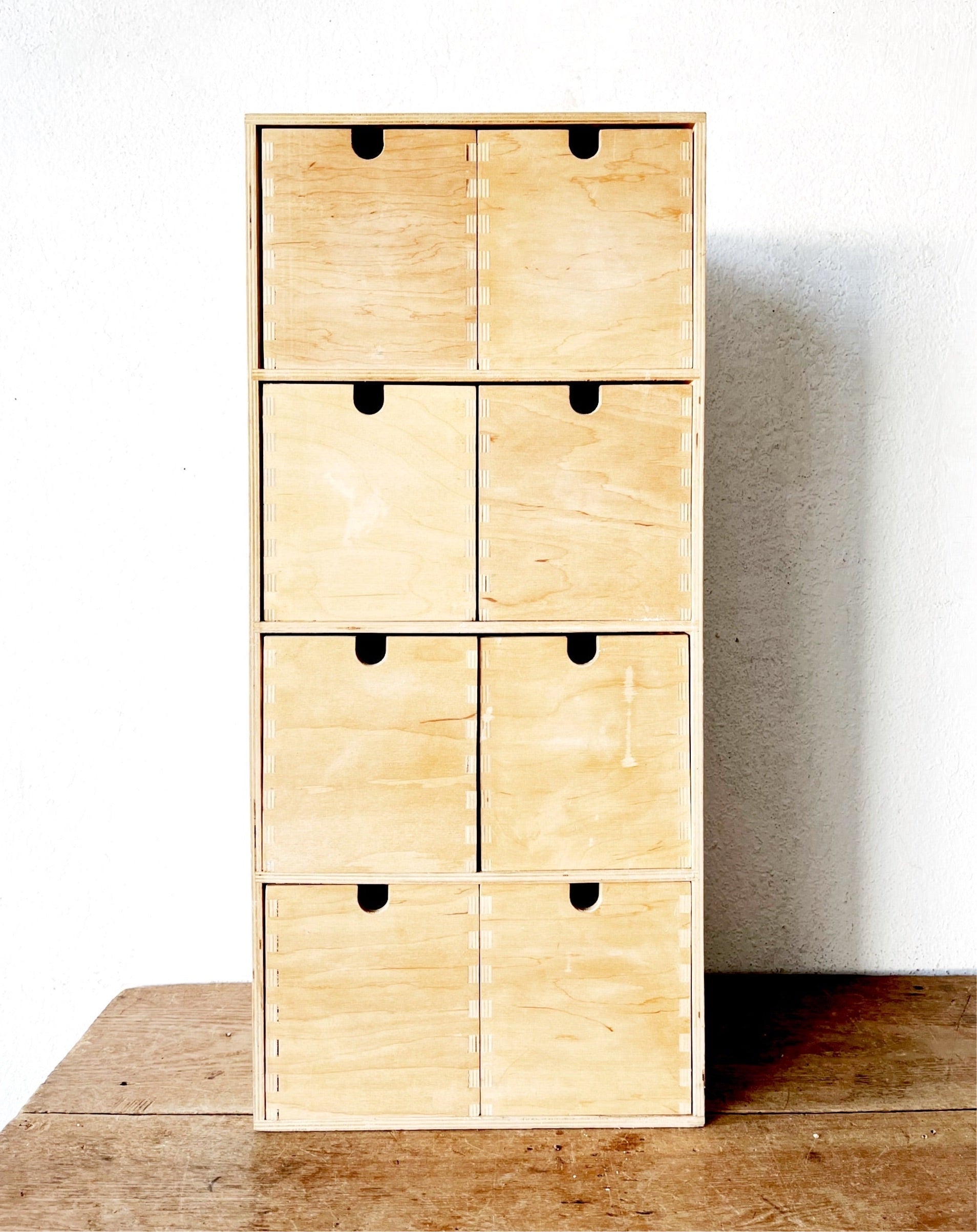 No longer produced and highly coveted moppe 8 drawer. Really good quality Unfinished natural ply. Simple integrated pulls. Fiberboard back. Dovetailed