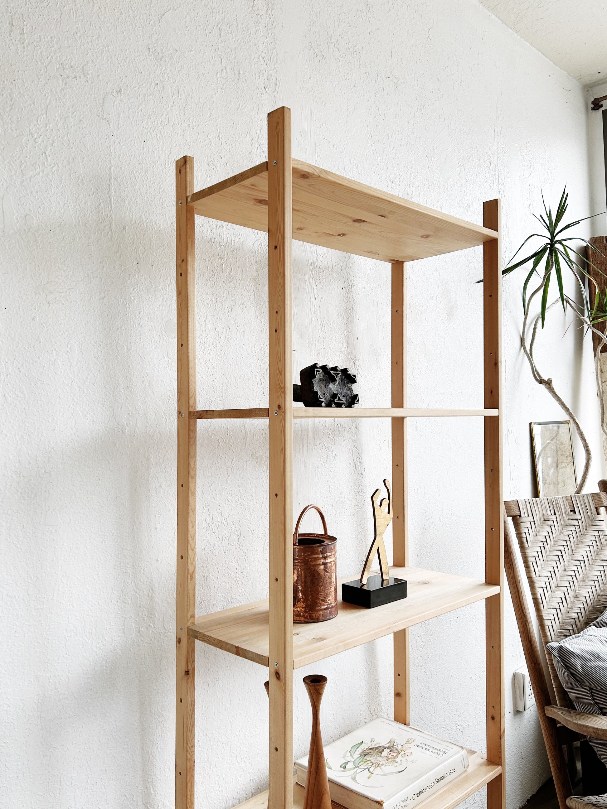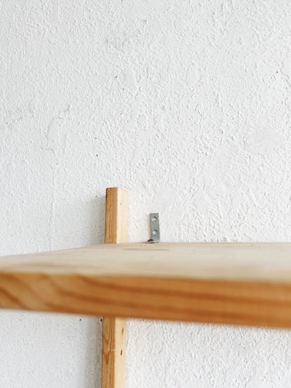 Newer utilitarian natural un stained wood shelf. Great for display or loaded up with plants and books. Open back and sides. I left the small metal bracket on upper back for easy attach to stabilize to a wall.