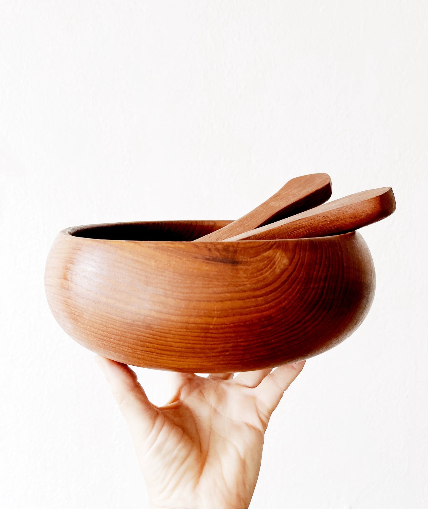 Great bun shaped teak bowl with chunky servers. A really nice looking mid century set for serving 2-6