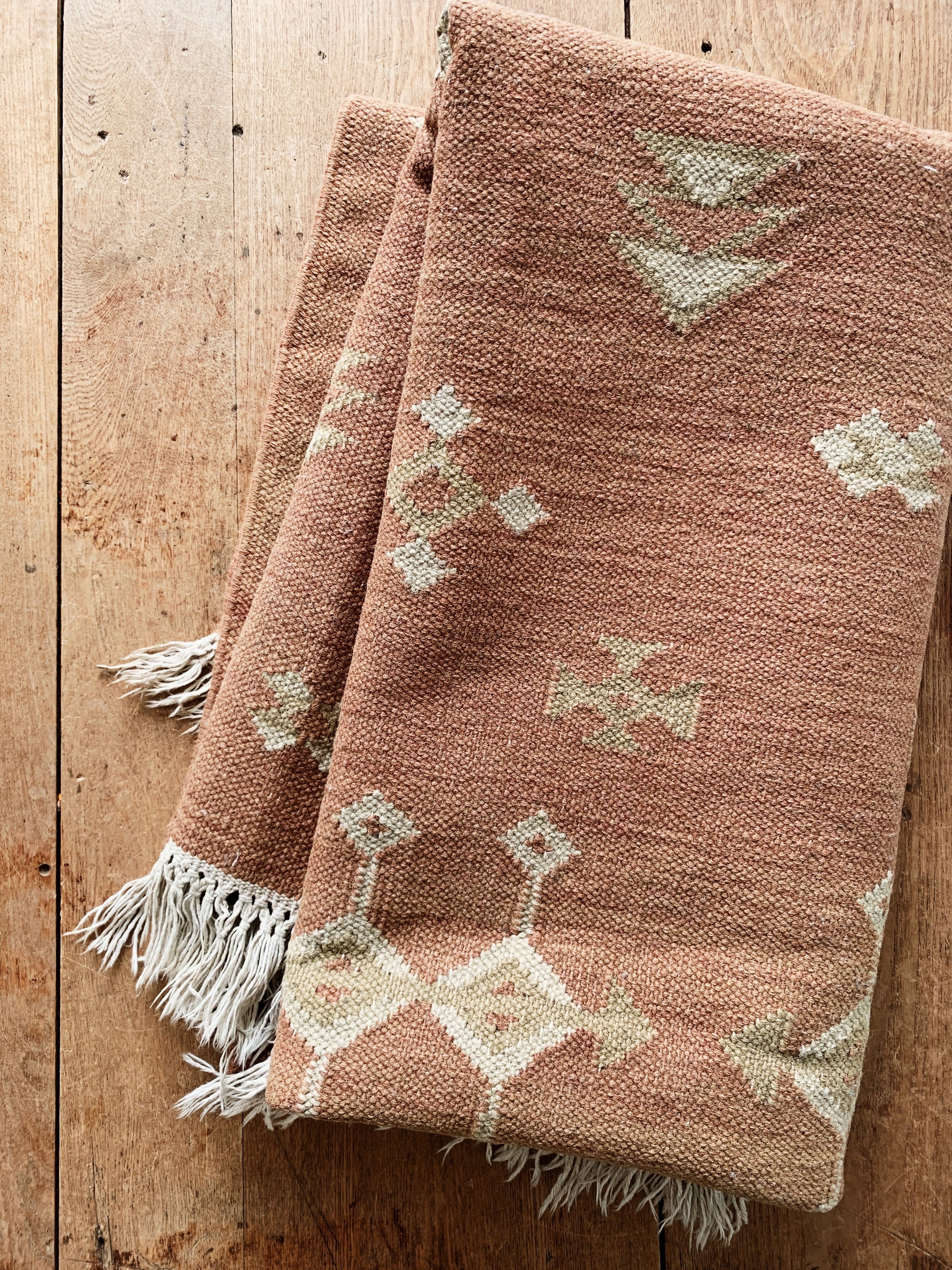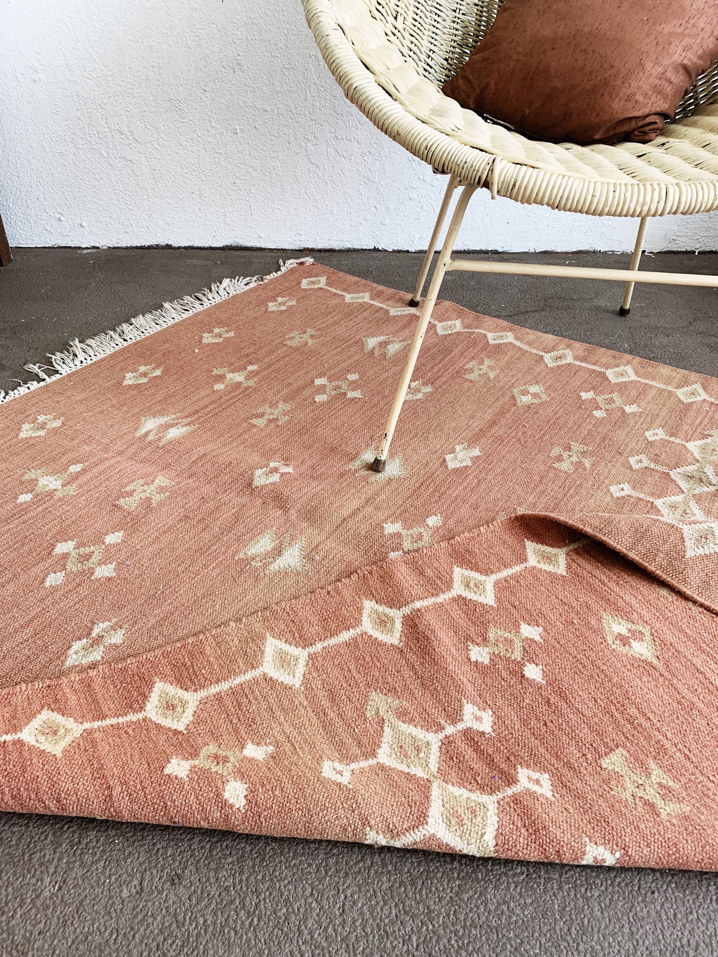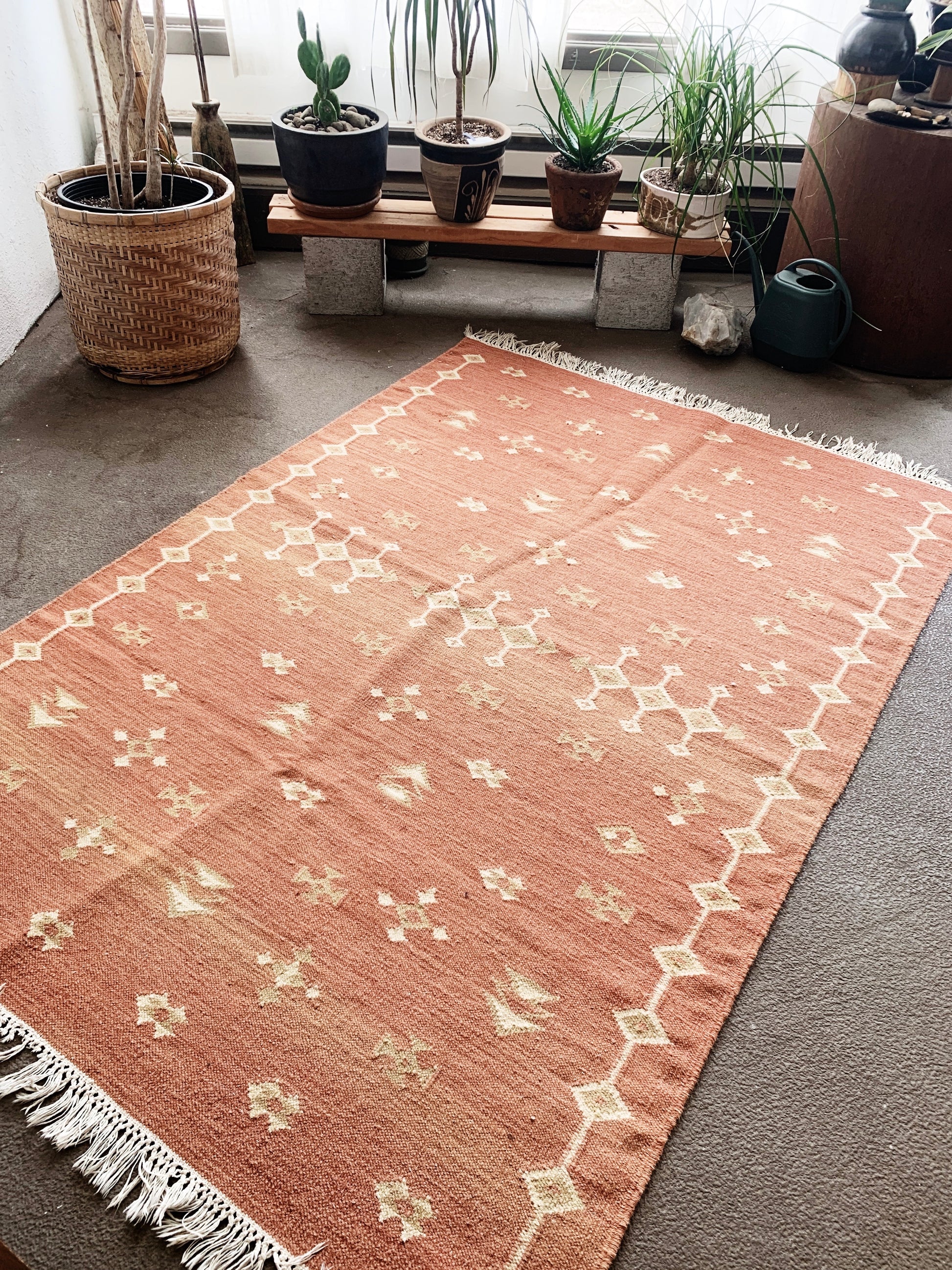 Terra Cotta dhurrie wool rug approx 20 years old.