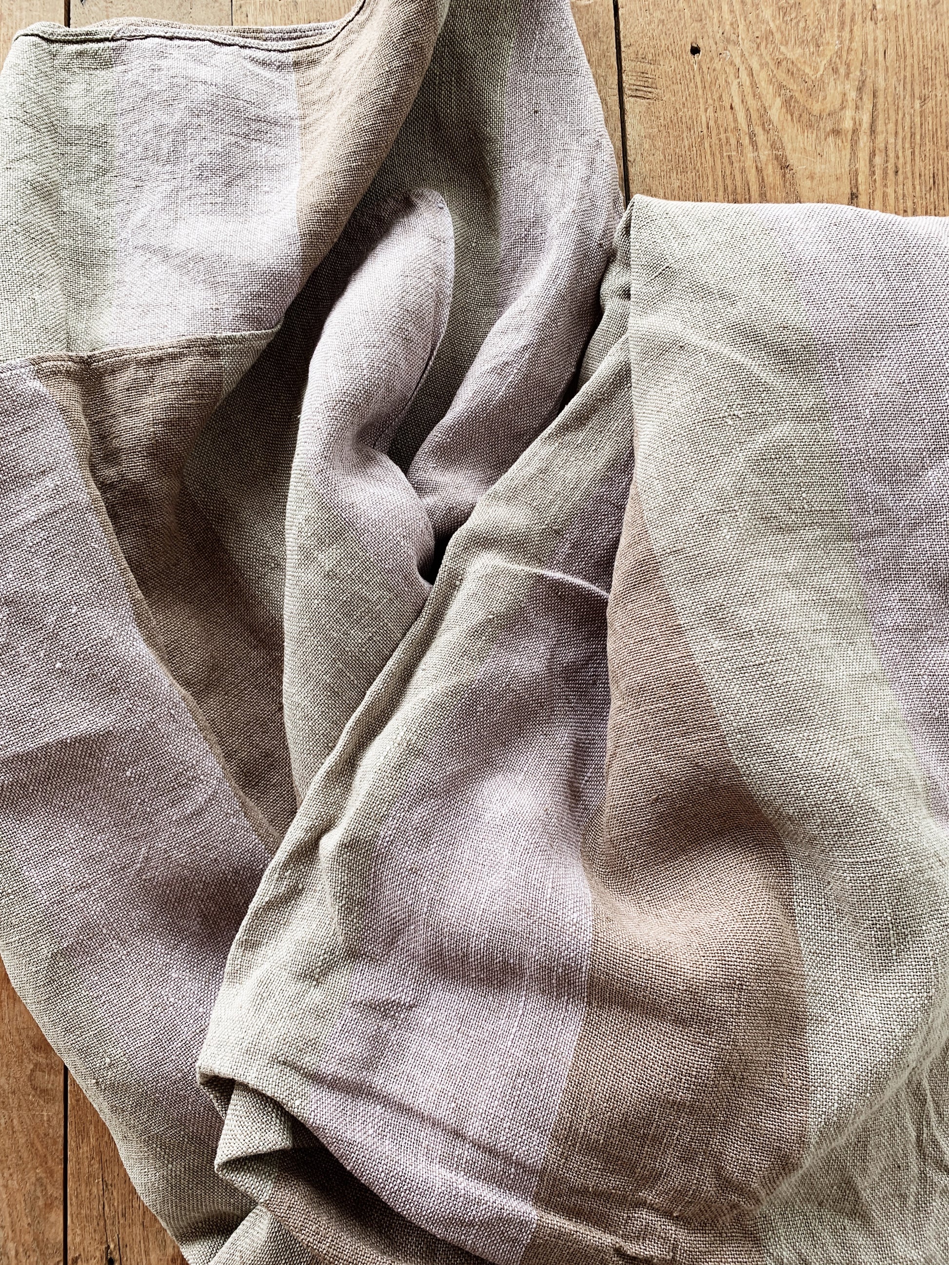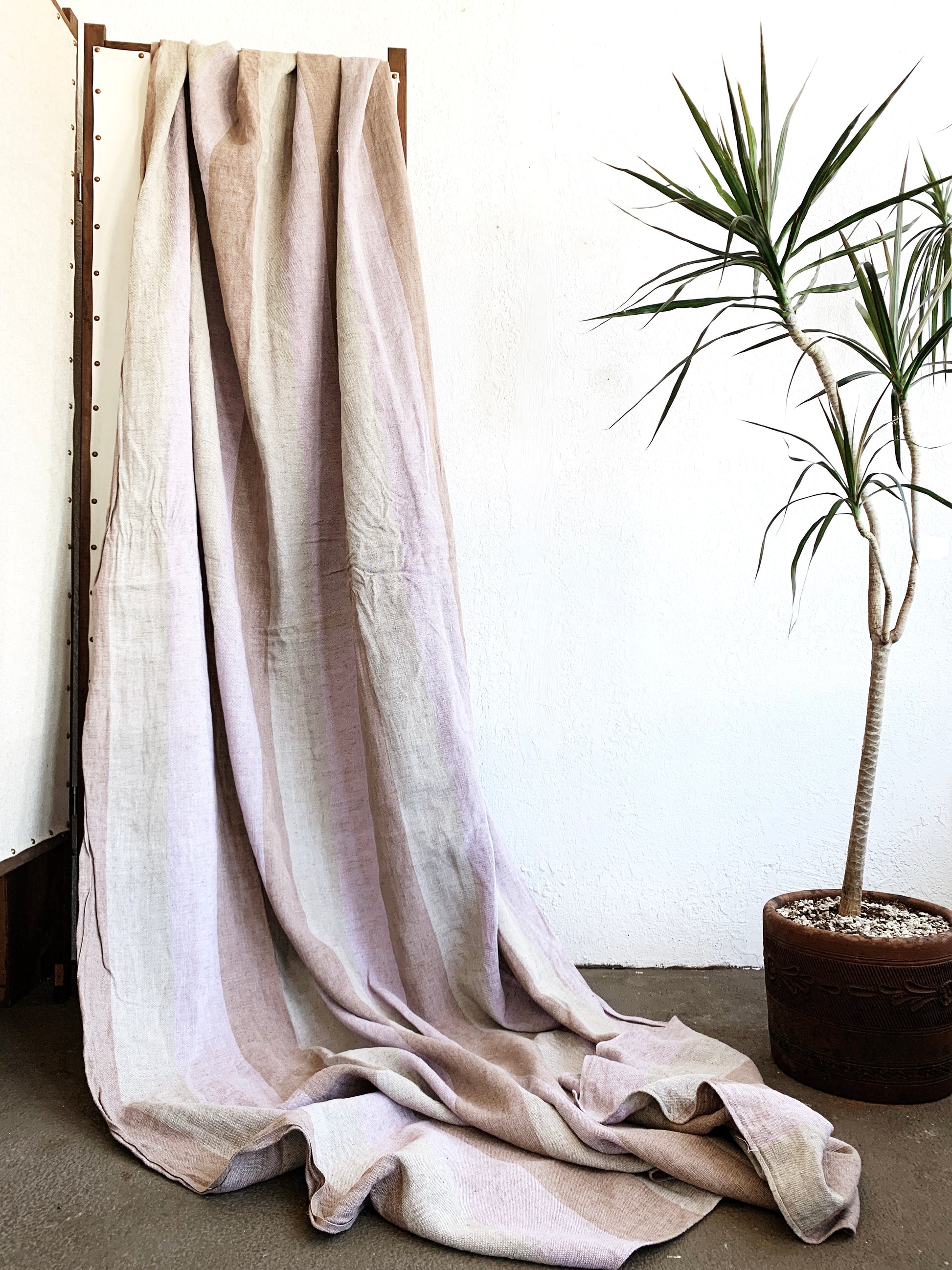Gorgeous thick linen fabric in pretty taupe, cocoa and lavender stripe. Would be great for any upholstery project or make curtains! Really nice, drapey quality with finished ends. This is a substantial amount of fabric at: