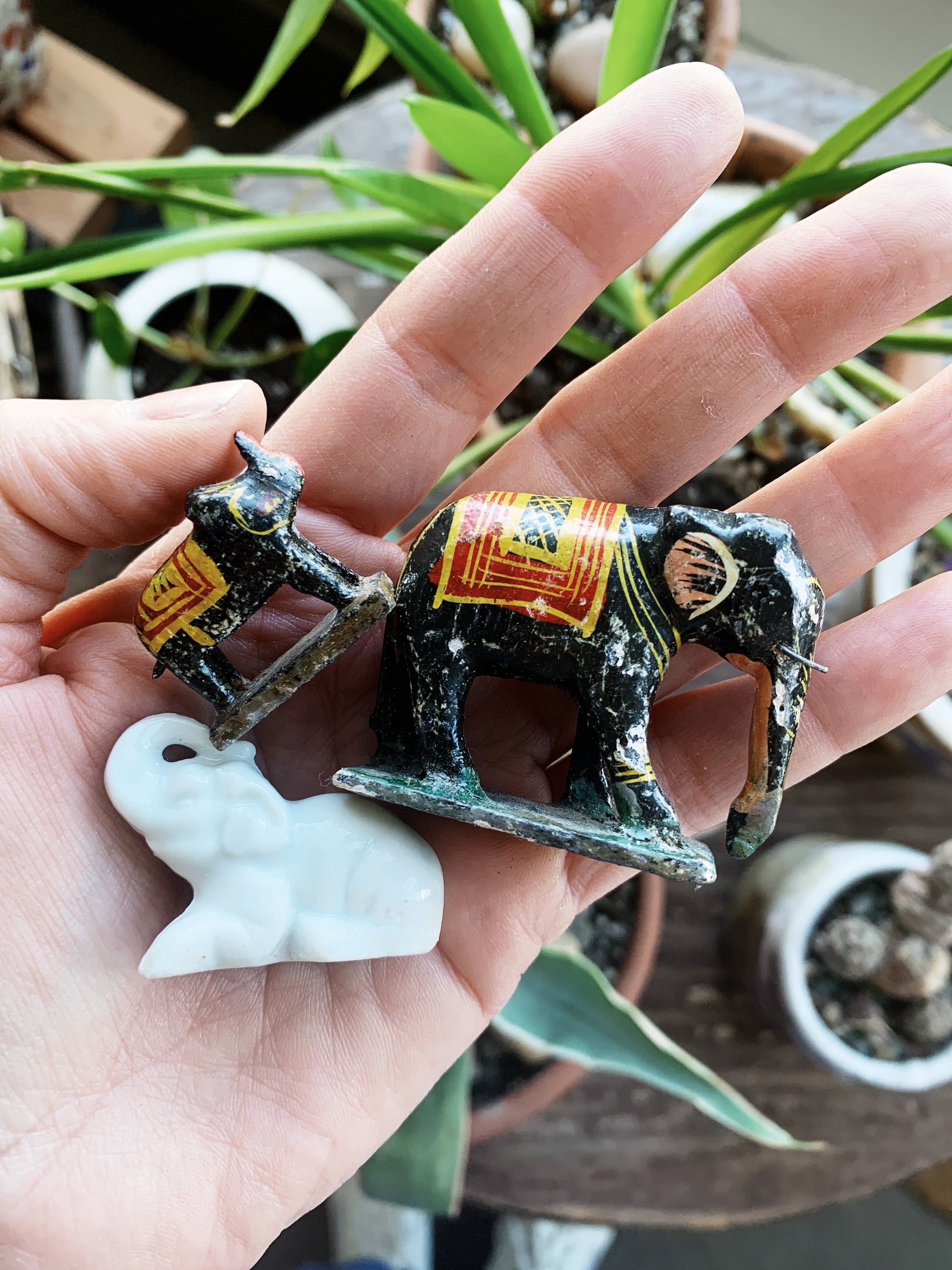 Three tiny vintage elephants. Two are paper mache from India, other is white porcelain.