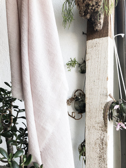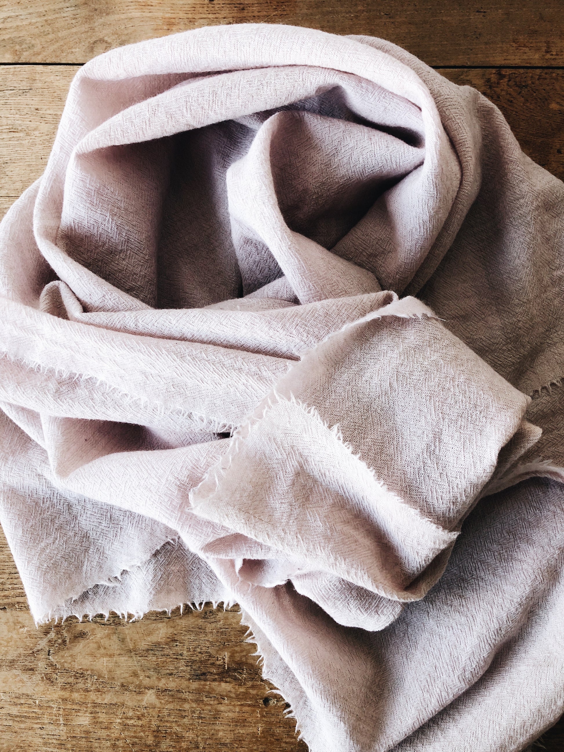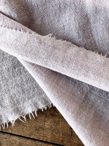 Beautiful tissue weight wool, in a pale black raspberry color. Large square shape makes this easy to wear as a scarf or shawl. Subtle woven chevron pattern and when held to the light, a large scale plaid can be seen