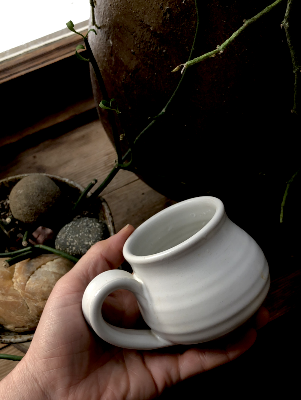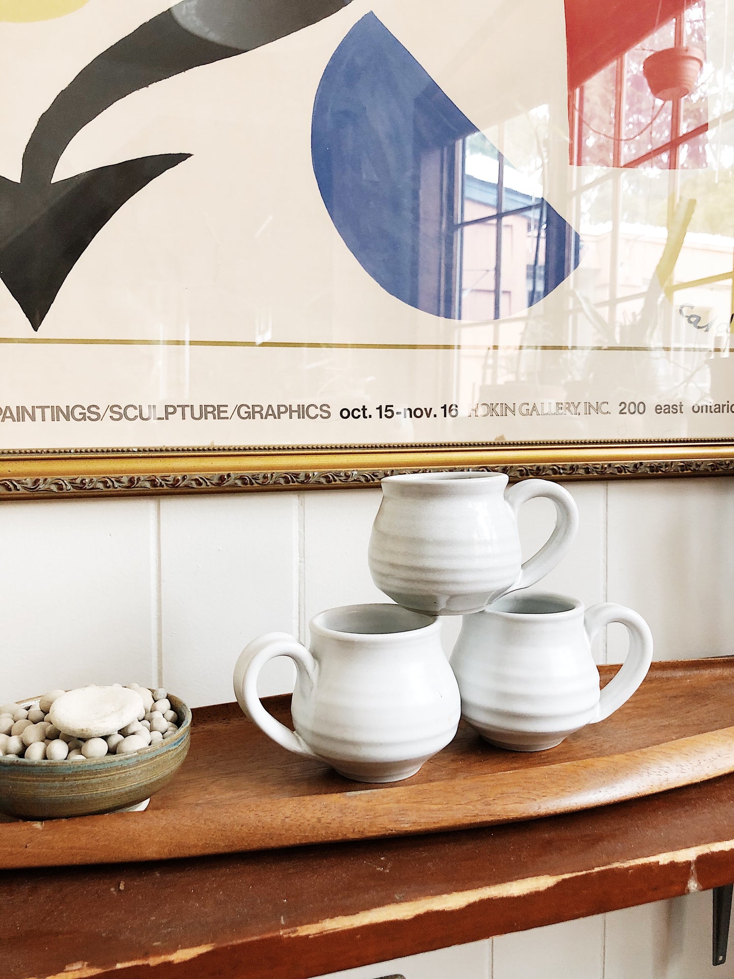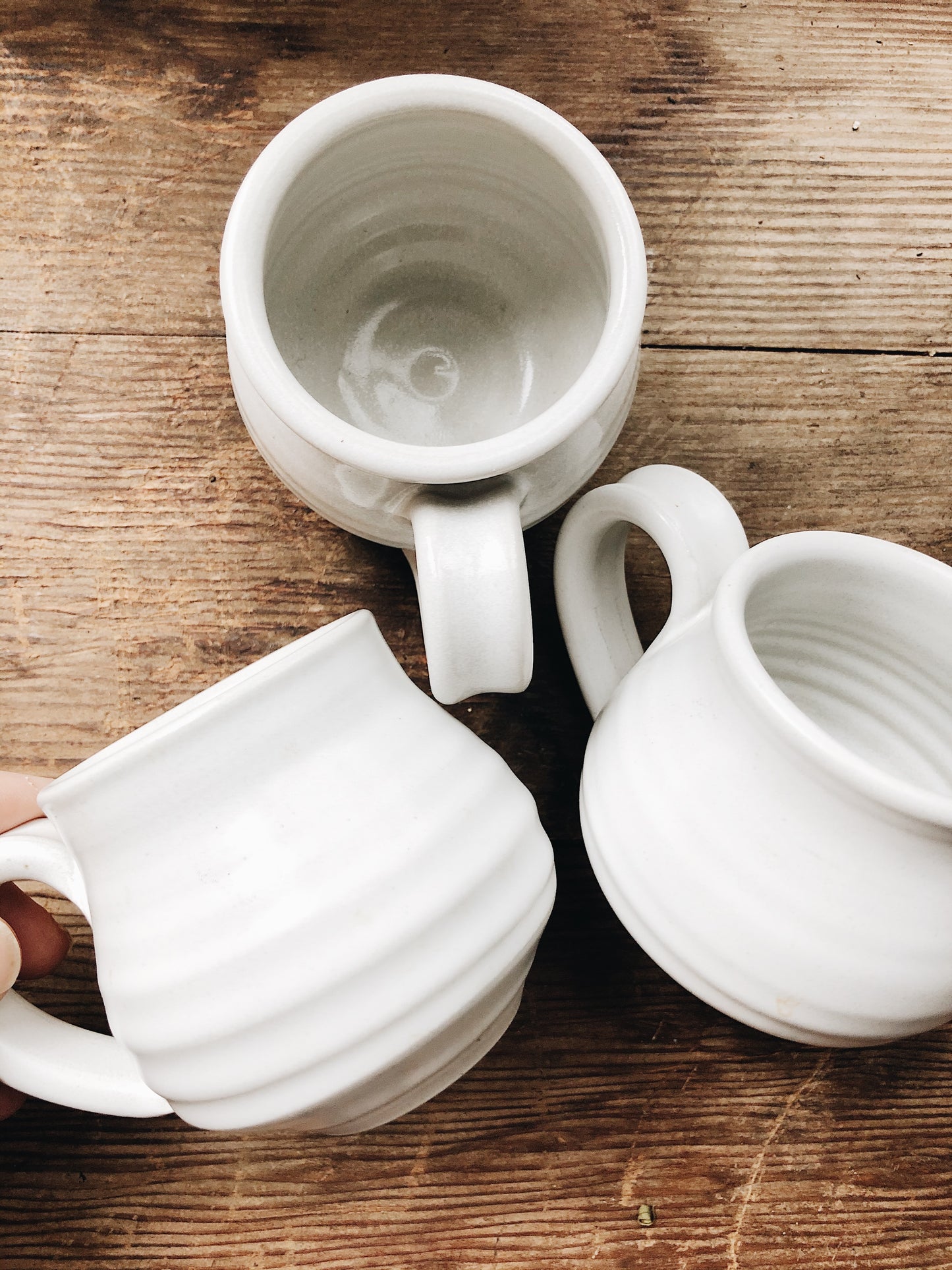 Nice set of handmade mugs in warm white. Holds 6 to 8 ounces
