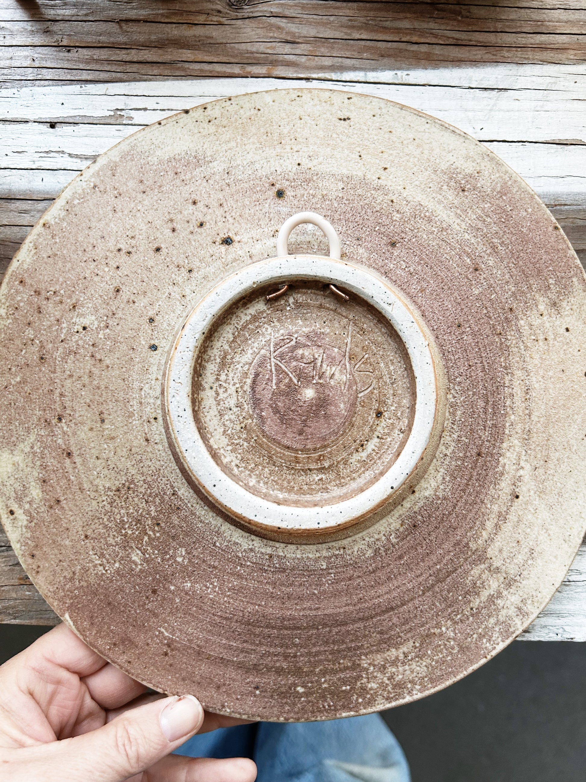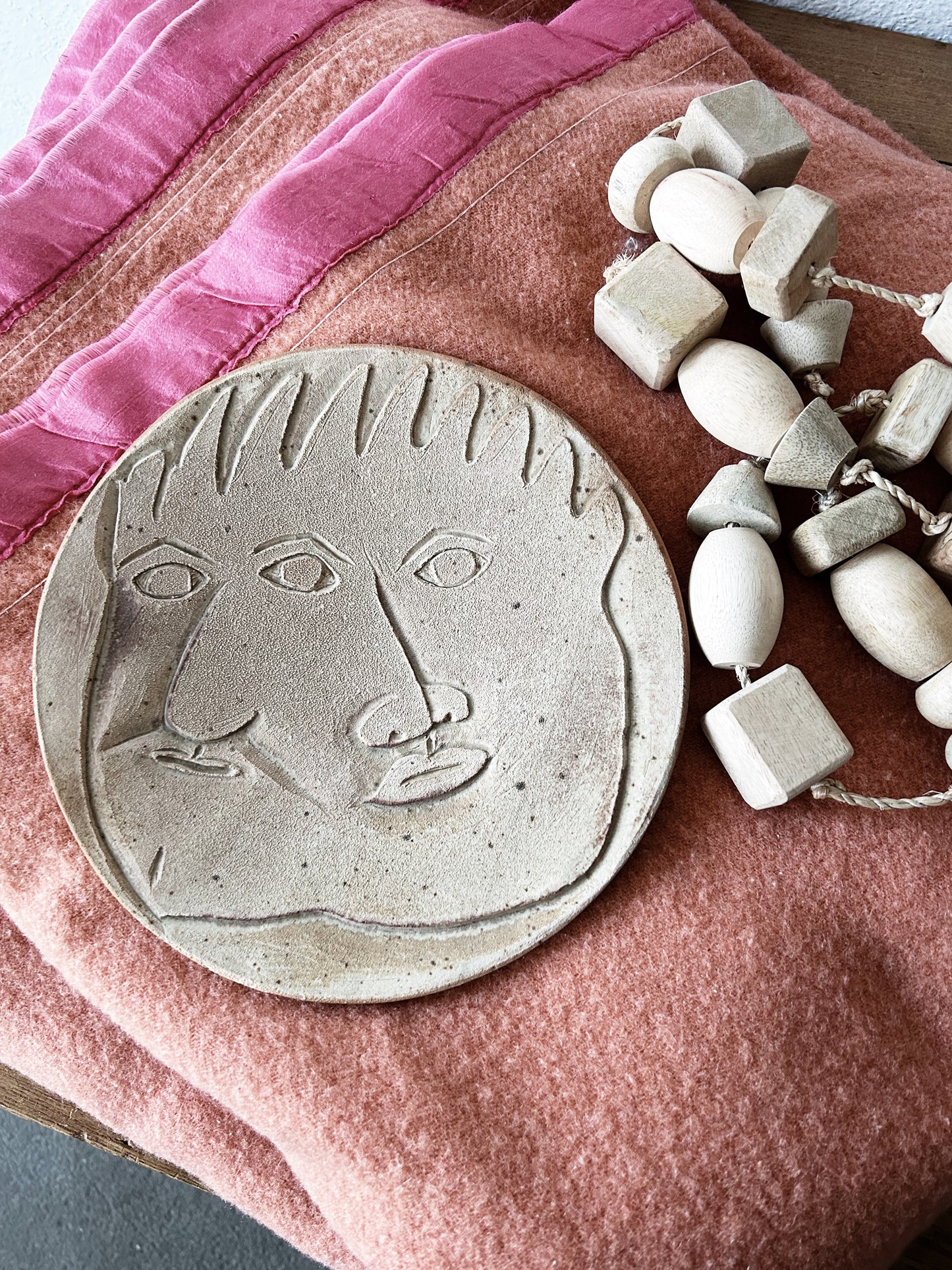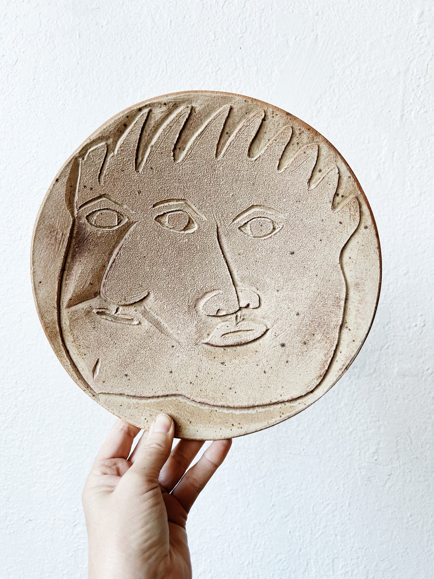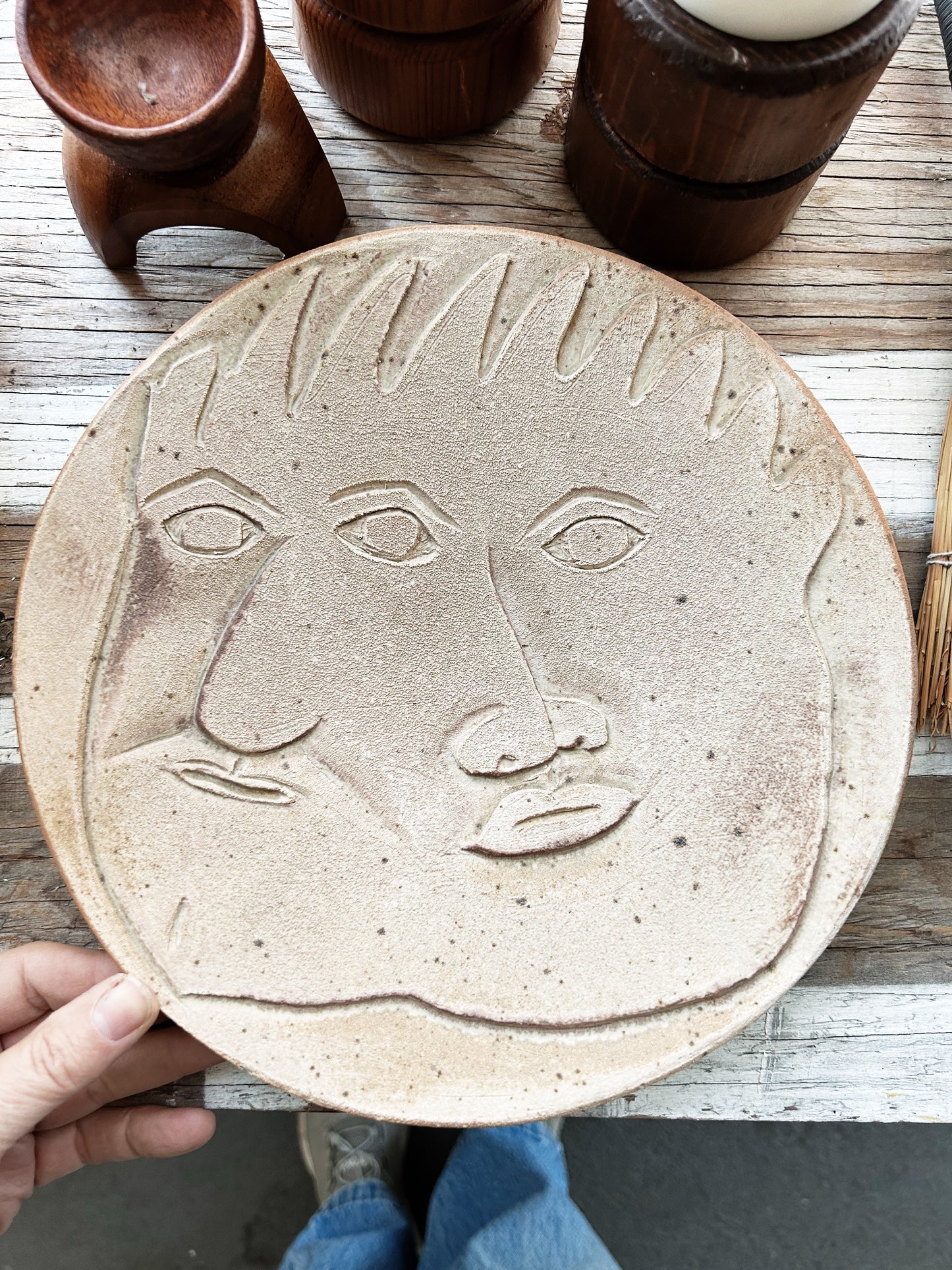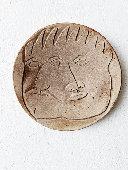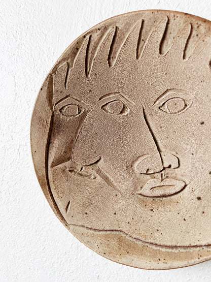 Such a fun find. Natural stoneware art pottery featuring two faces. Signed and has a hanger on back. No chips or cracks.