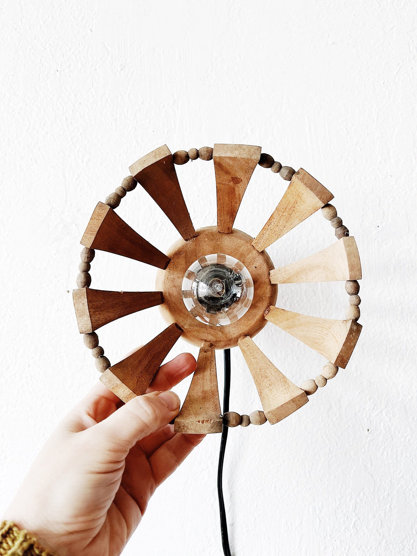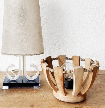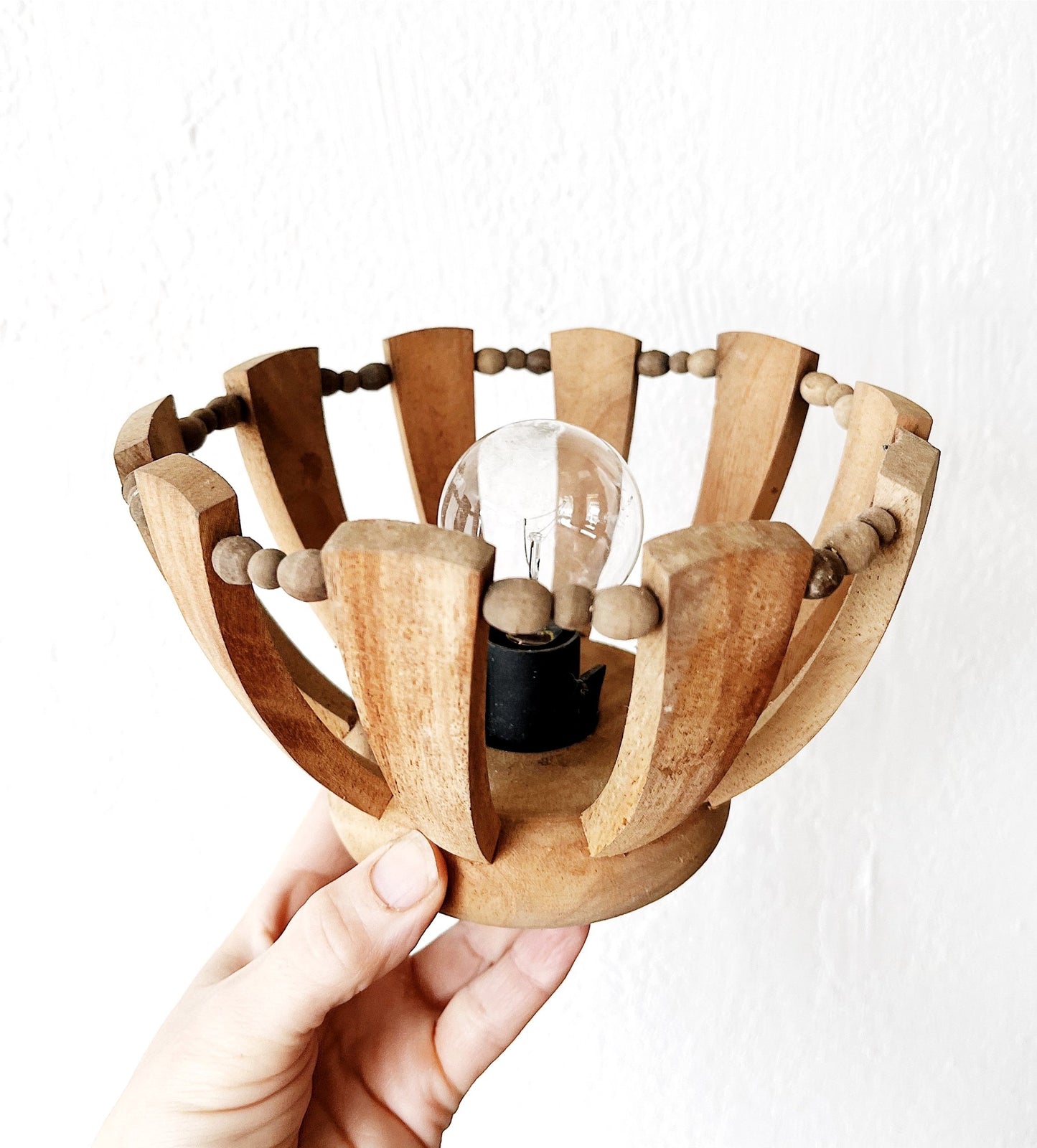 A nicely made wooden table lamp. Throws lovely shadows. On cord switch and takes a chandelier base bulb…frosted or clear